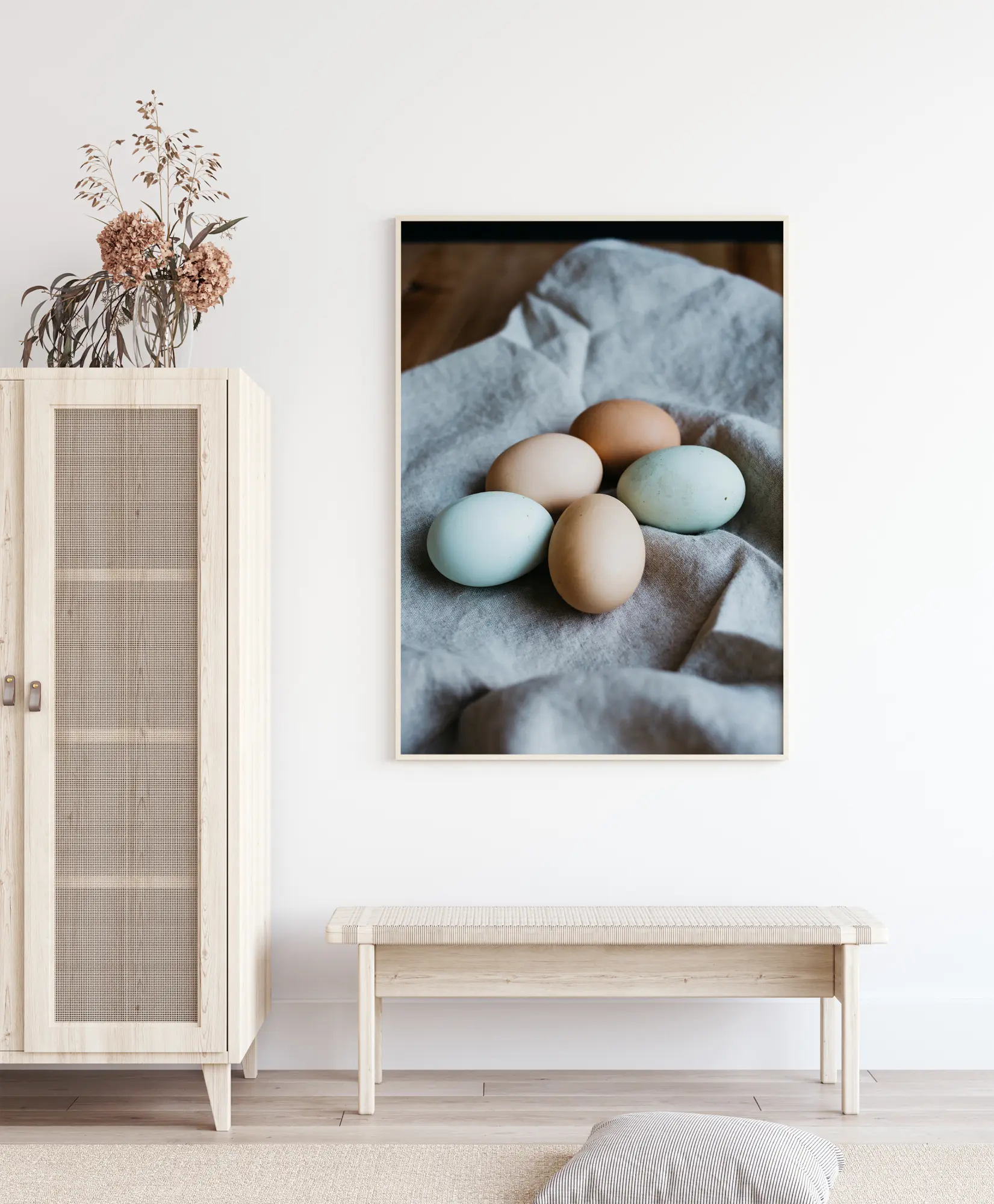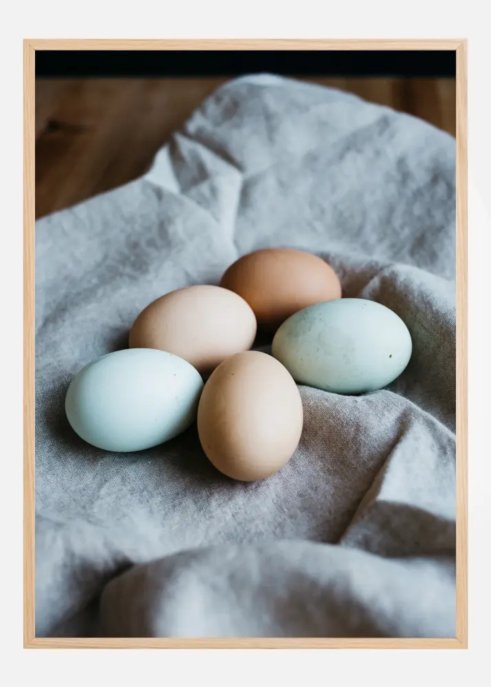 Um póster de natureza morta com cinco ovos em uma toalha de cozinha branca na mesa. Os ovos são de diferentes tons de marrom e branco e parecem ter sido recentemente postos. As tonalidades quentes criam uma sensação rústica onde pode apreciar a atmosfera natural e viva. Perfeito para um ambiente de cozinha.