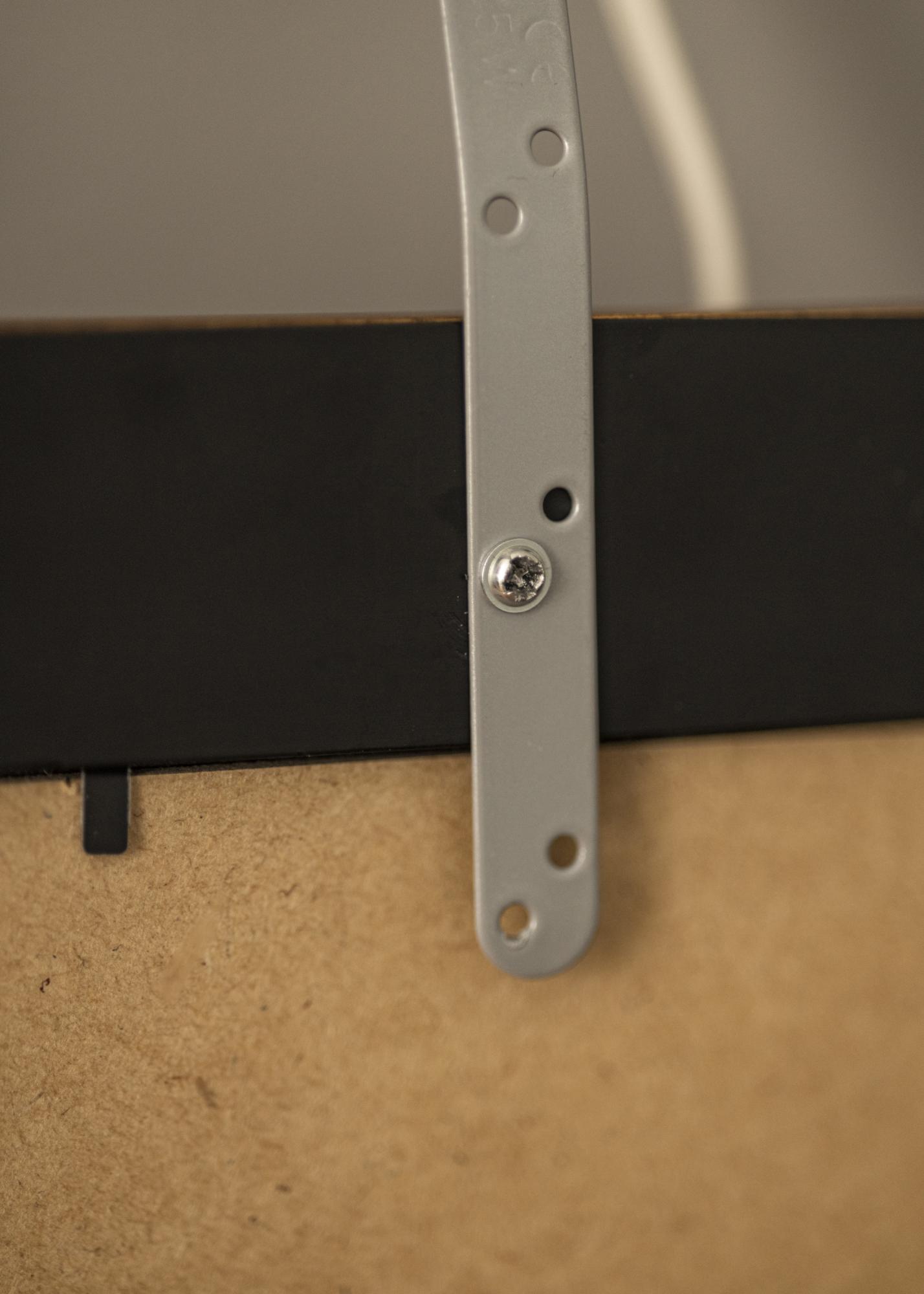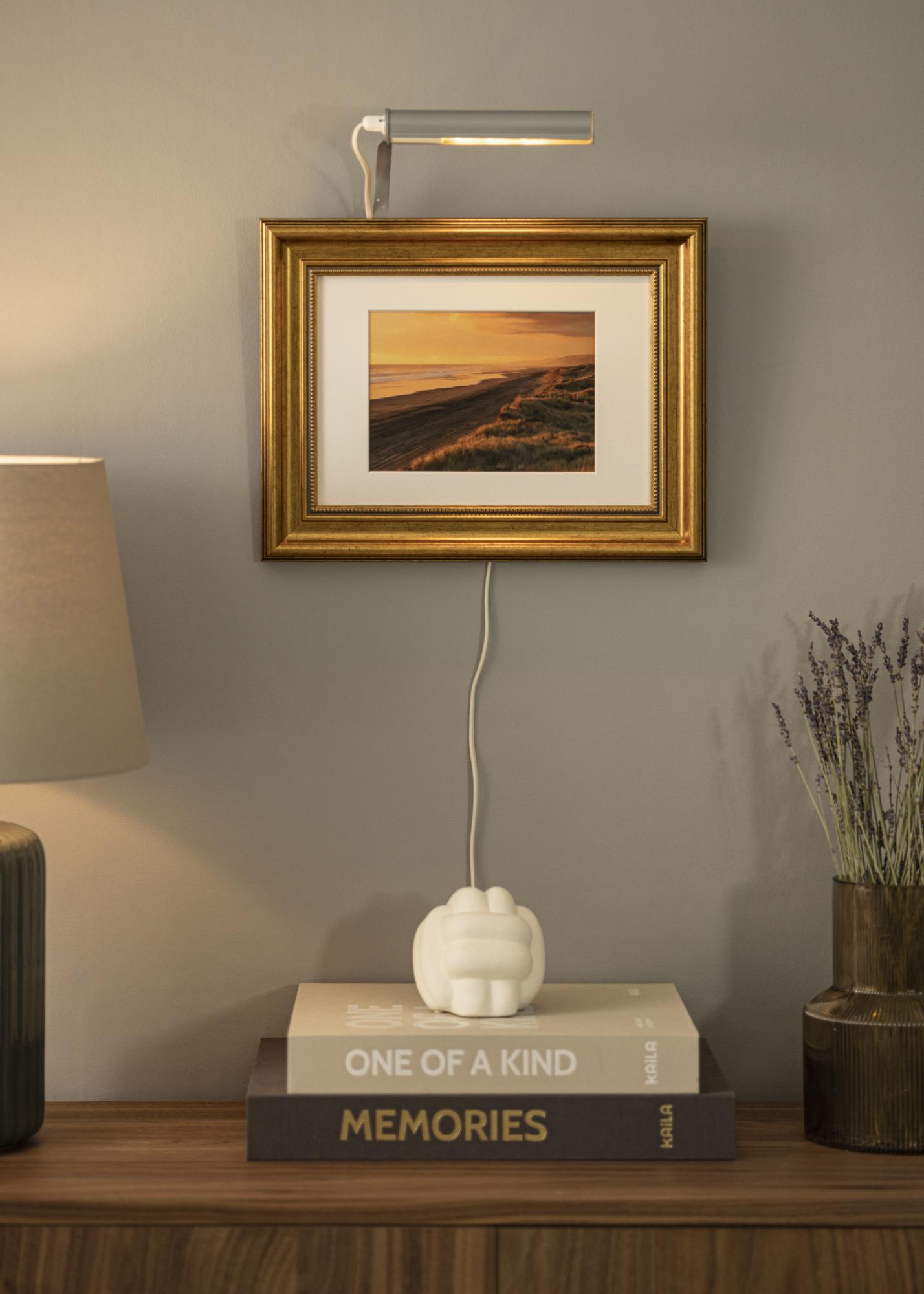 Normalmente, fixa a iluminação do quadro na parte de trás da moldura e a desvantagem disso é que é necessário uma moldura de madeira (algumas molduras compostas também funcionam) que tenha um perfil largo para que seja possível aparafusar na moldura. Com o nosso suporte de parede, não precisa se preocupar com isso e simplesmente monta a sua iluminação de quadros diretamente na parede atrás do quadro.