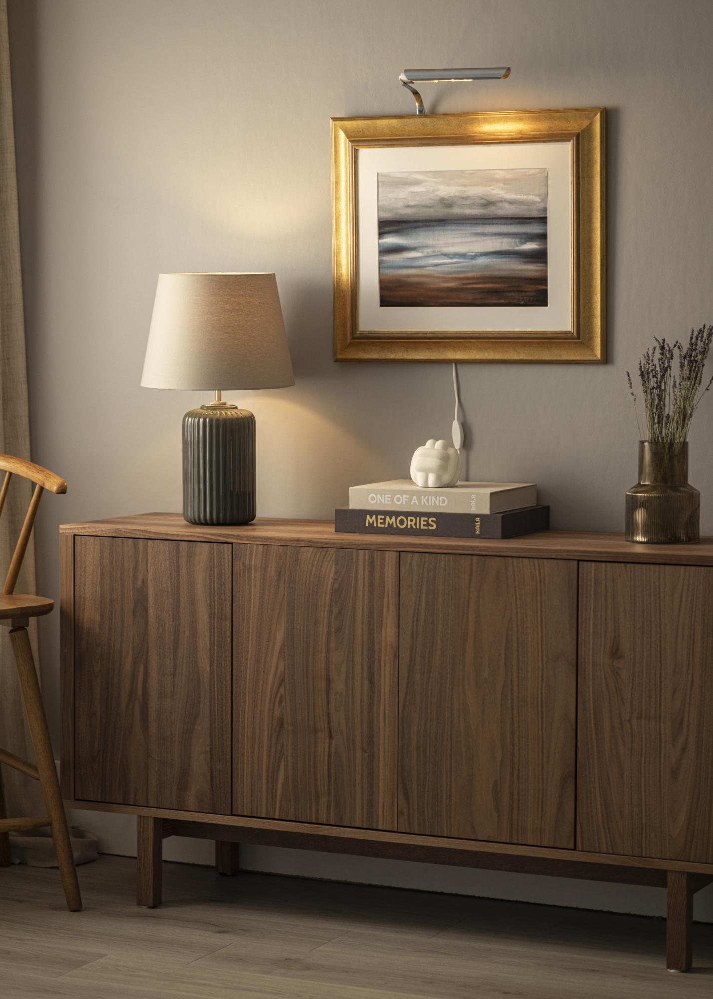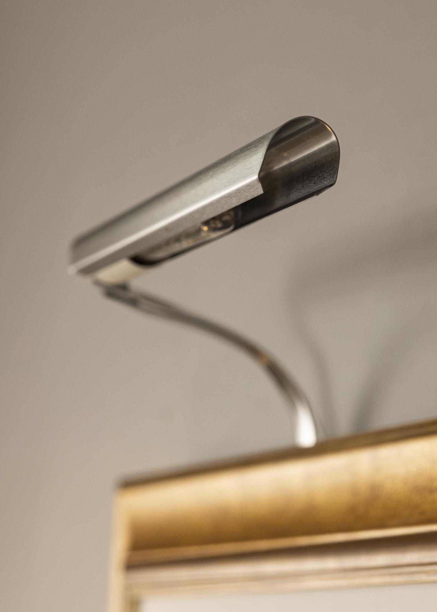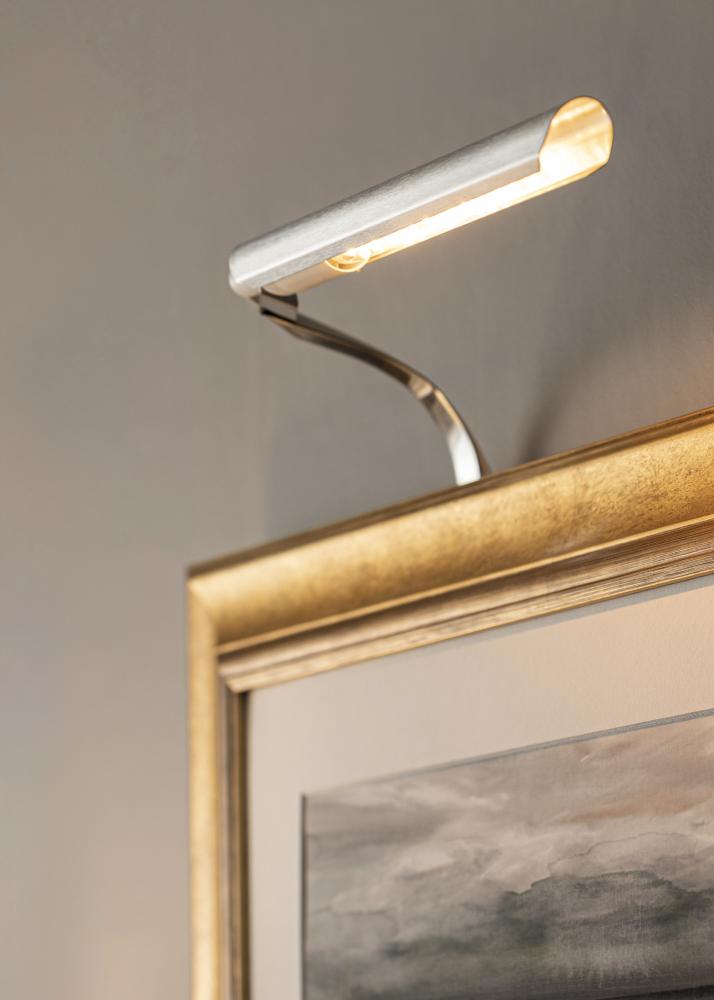 Normalmente, fixa a iluminação para quadros na parte de trás da moldura e a desvantagem disso é que é necessário ter uma moldura de madeira (algumas molduras compostas também funcionam) com um perfil largo para que seja possível aparafusar na moldura. Com o nosso suporte de parede, não precisa se preocupar com isso, basta montar a sua iluminação para quadros diretamente na parede atrás do quadro.
