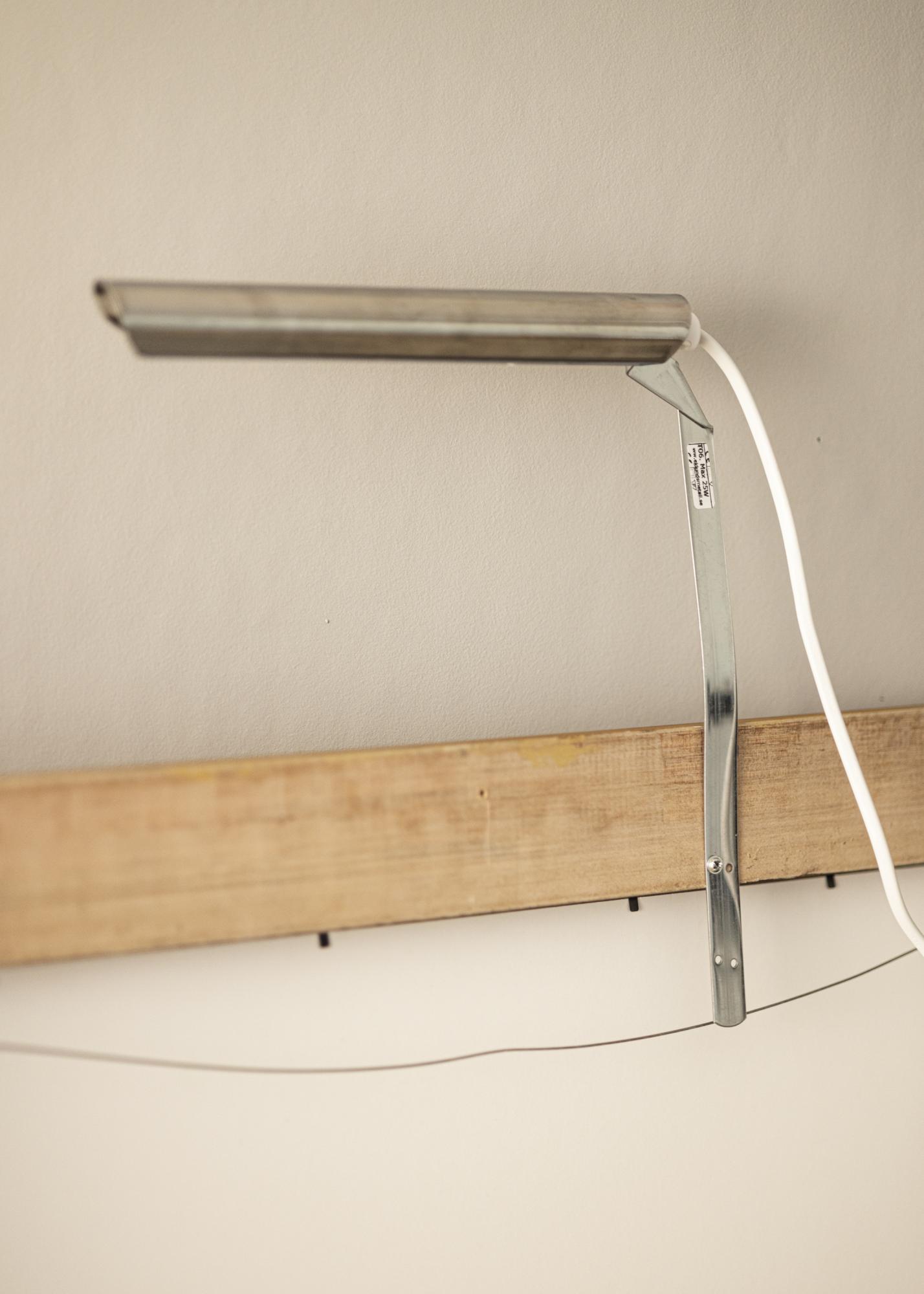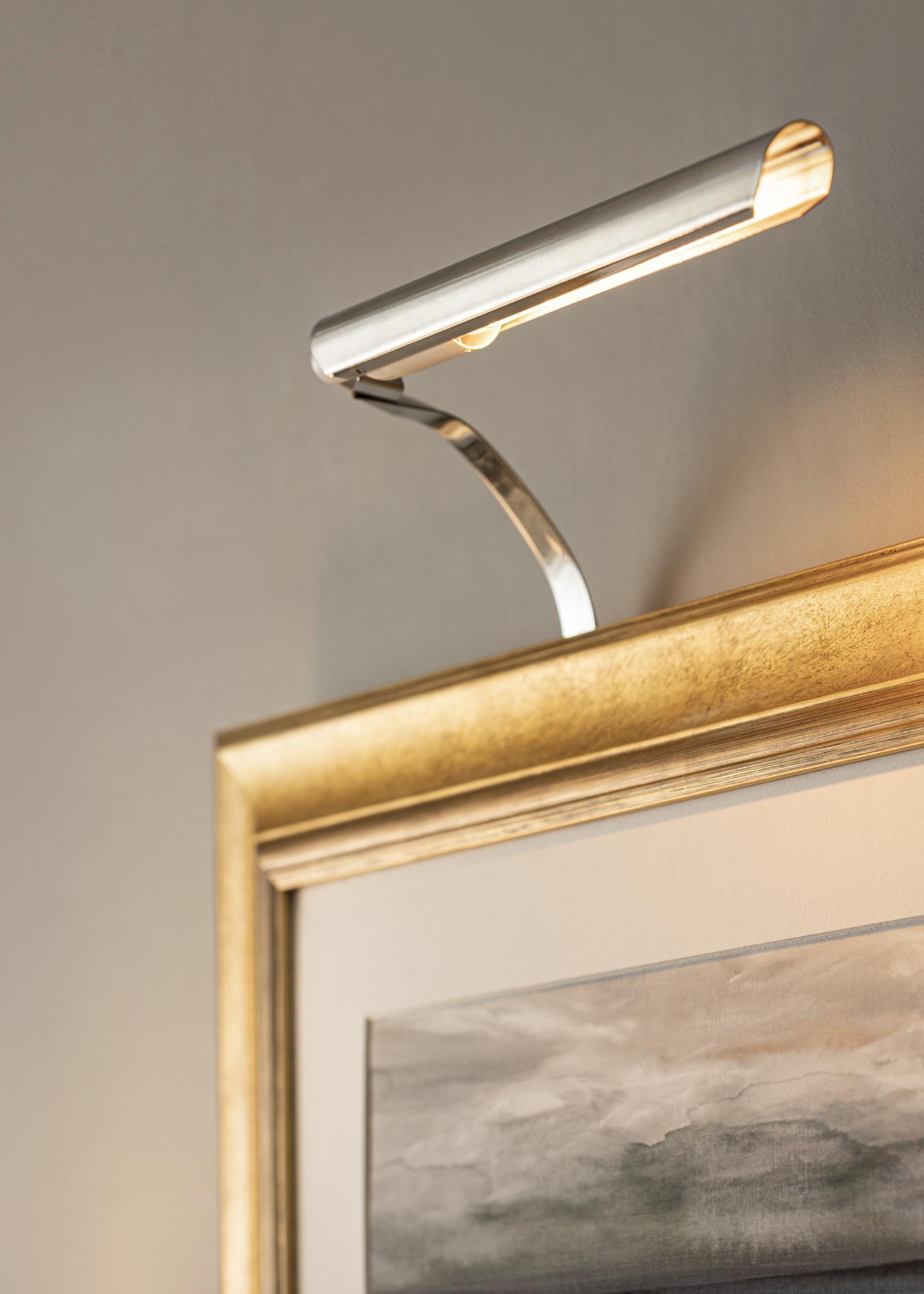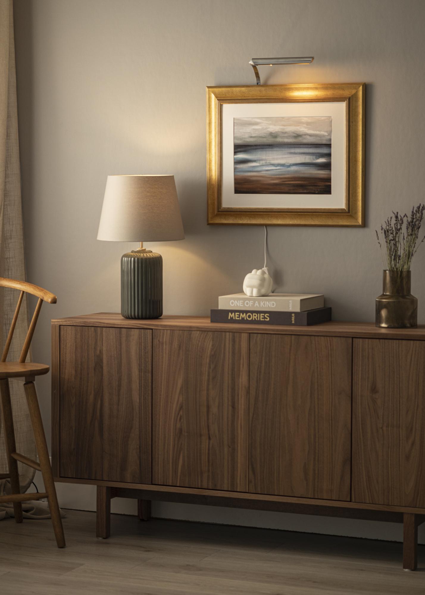 Normalmente, fixa a iluminação para quadros na parte de trás da moldura e a desvantagem disso é que é necessário ter uma moldura de madeira (algumas molduras compostas também funcionam) com um perfil largo para que seja possível aparafusar na moldura. Com o nosso suporte de parede, não precisa se preocupar com isso, basta montar a sua iluminação para quadros diretamente na parede atrás do quadro.