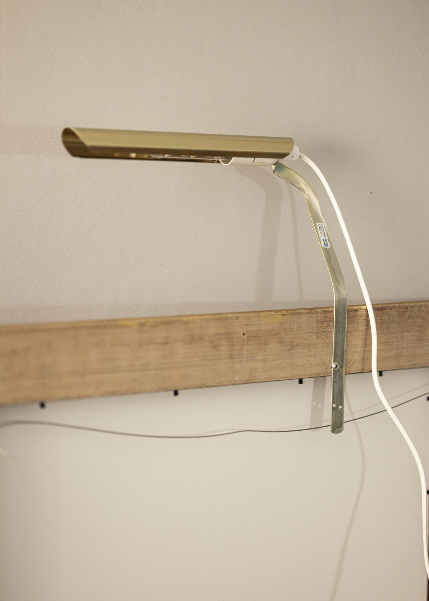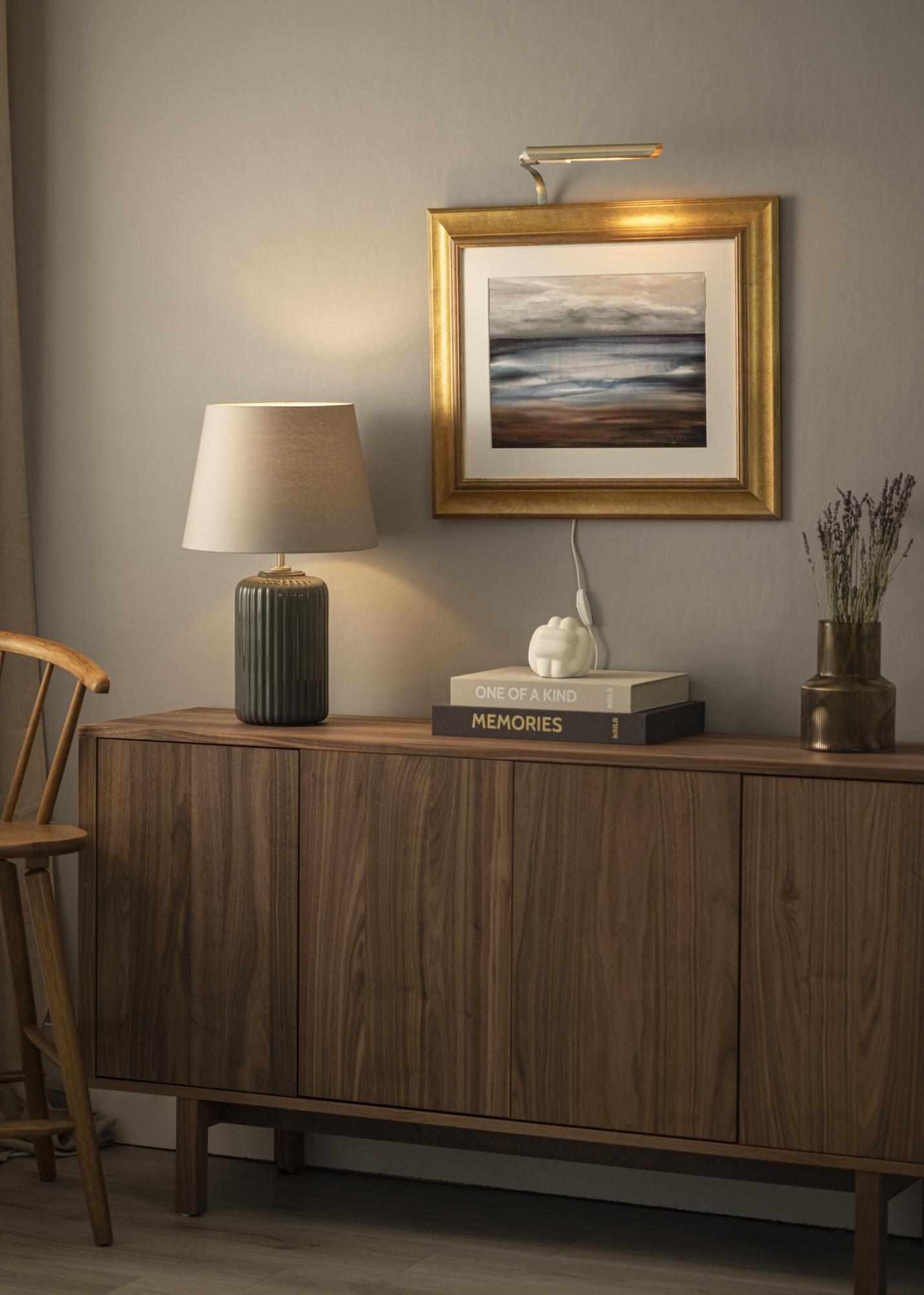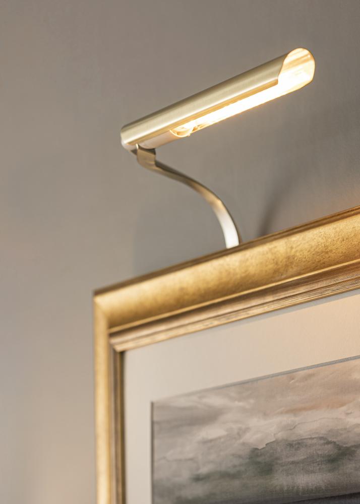 Normalmente, fixa a iluminação para quadros na parte de trás da moldura e a desvantagem disso é que é necessário ter uma moldura de madeira (algumas molduras compostas também funcionam) com um perfil largo para que seja possível aparafusar na moldura. Com o nosso suporte de parede, não precisa se preocupar com isso, basta montar a sua iluminação para quadros diretamente na parede atrás do quadro.