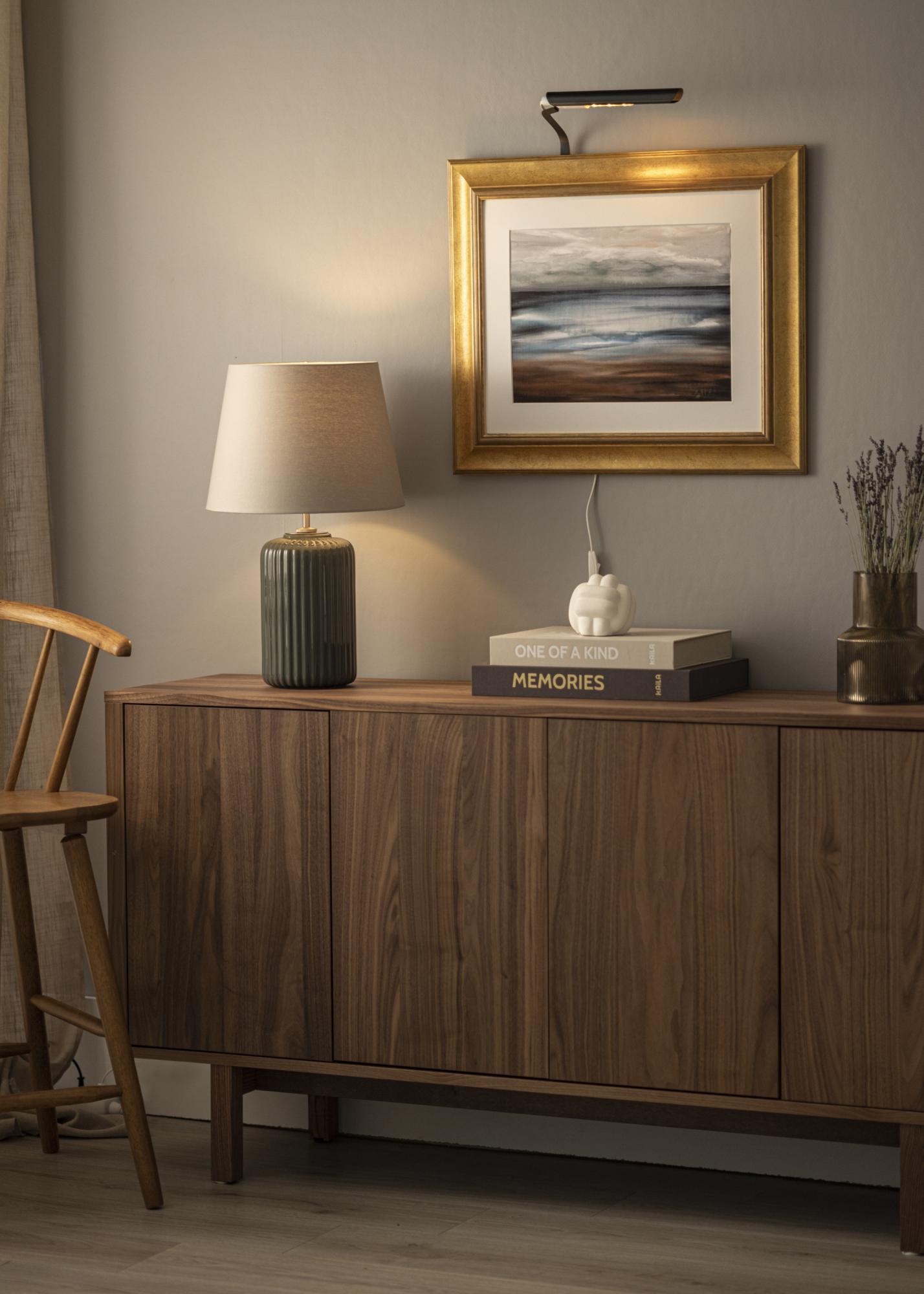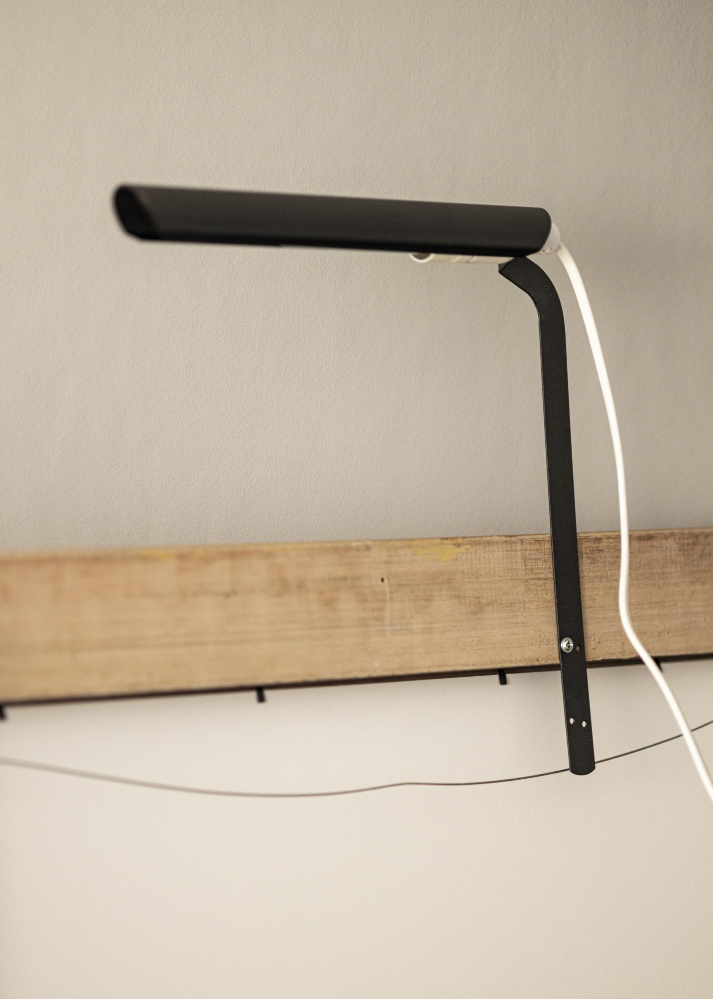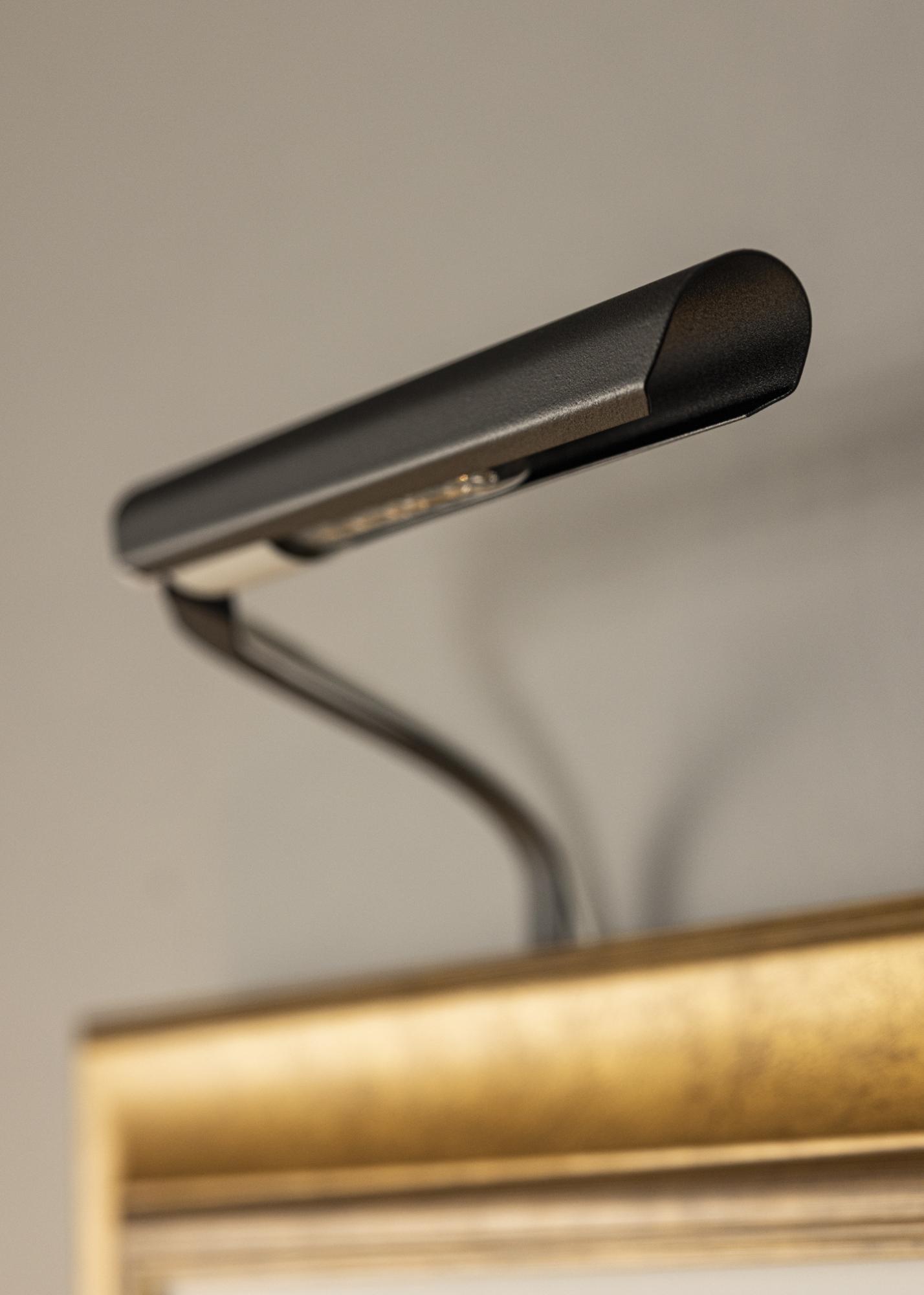 Normalmente, fixa a iluminação para quadros na parte de trás da moldura e a desvantagem disso é que é necessário ter uma moldura de madeira (algumas molduras compostas também funcionam) com um perfil largo para que seja possível aparafusar na moldura. Com o nosso suporte de parede, não precisa se preocupar com isso, basta montar a sua iluminação para quadros diretamente na parede atrás do quadro.