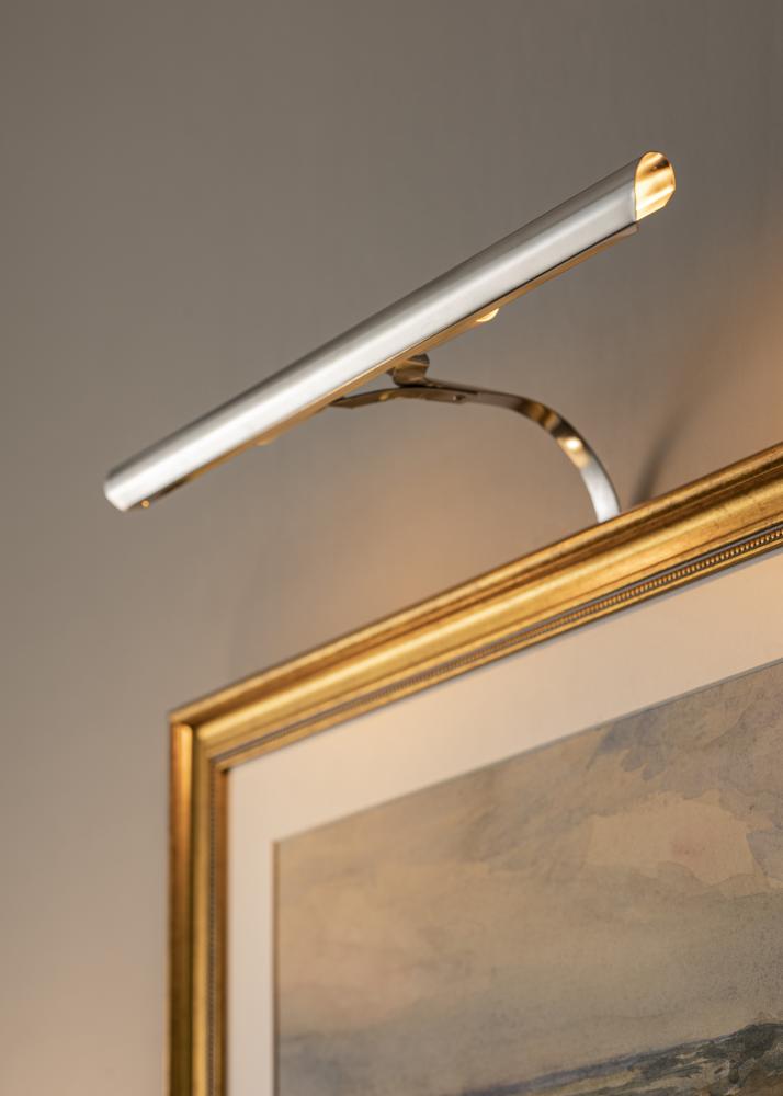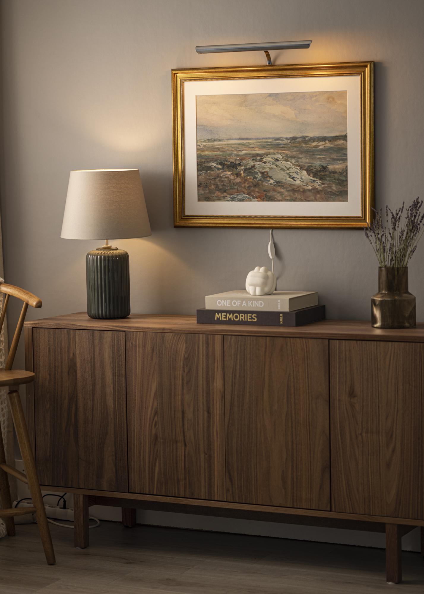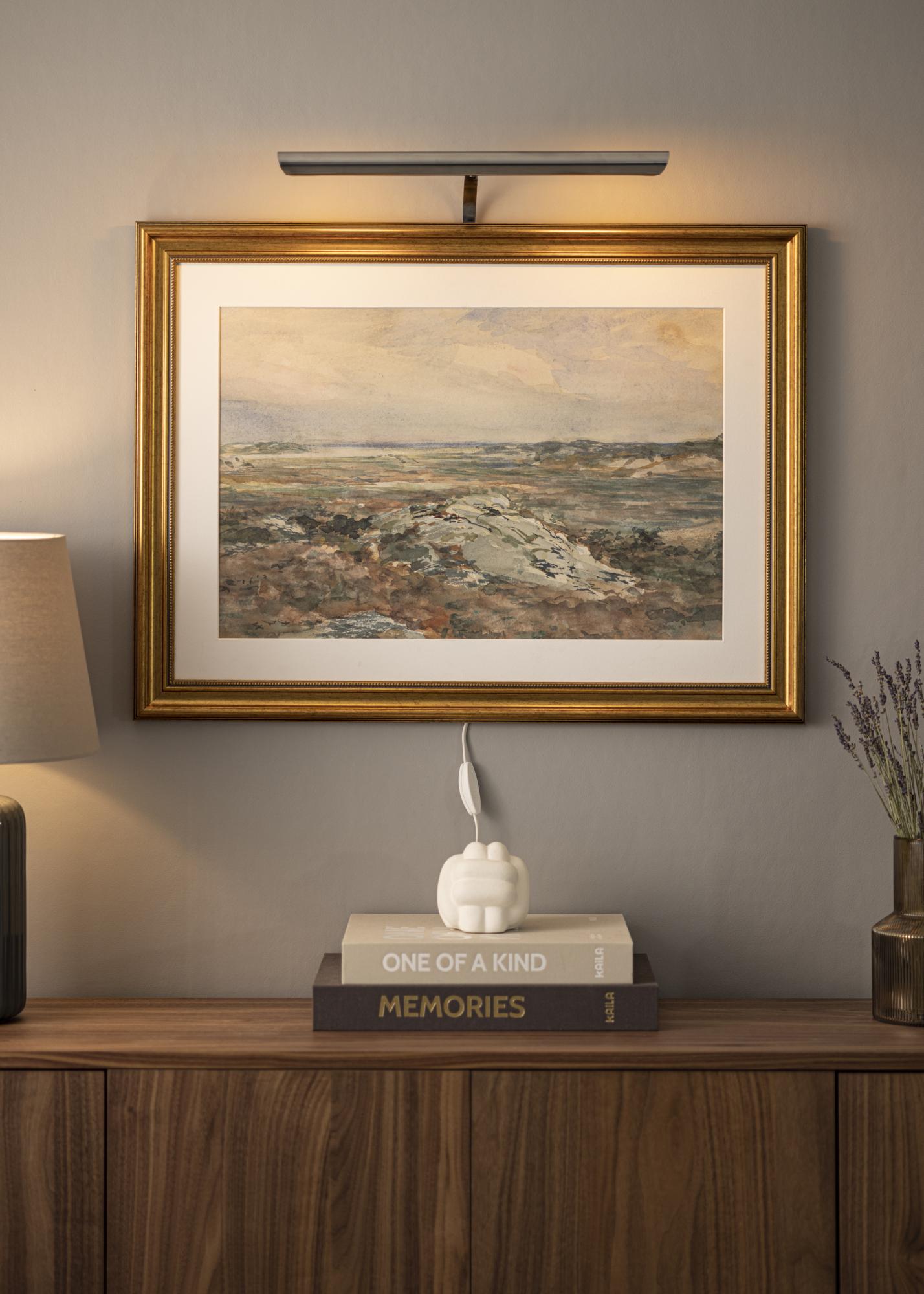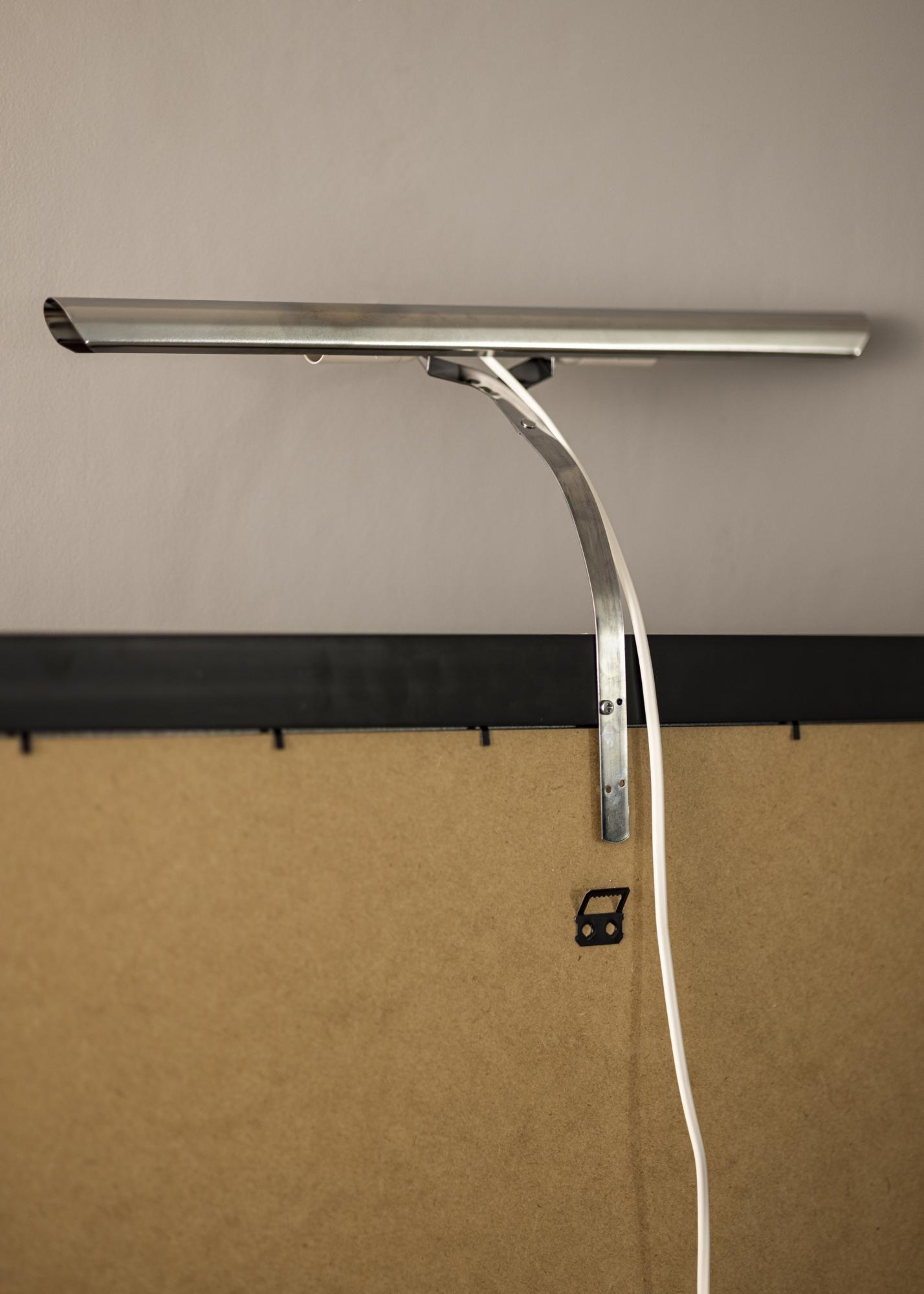 Normalmente, fixa a iluminação para quadros na parte de trás da moldura e a desvantagem disso é que é necessário ter uma moldura de madeira (algumas molduras compostas também funcionam) com um perfil largo para que seja possível aparafusar na moldura. Com o nosso suporte de parede, não precisa se preocupar com isso, basta montar a sua iluminação para quadros diretamente na parede atrás do quadro.