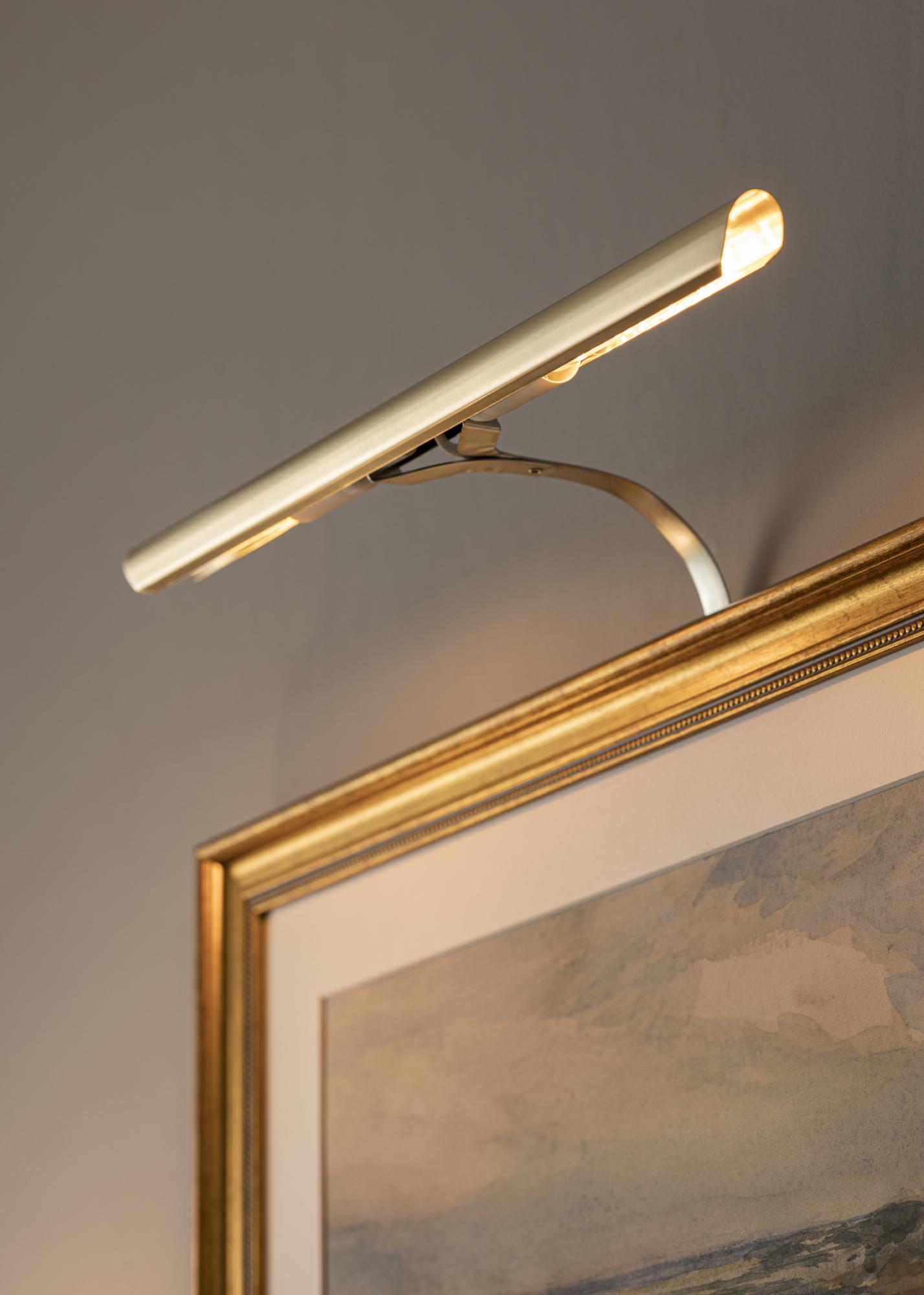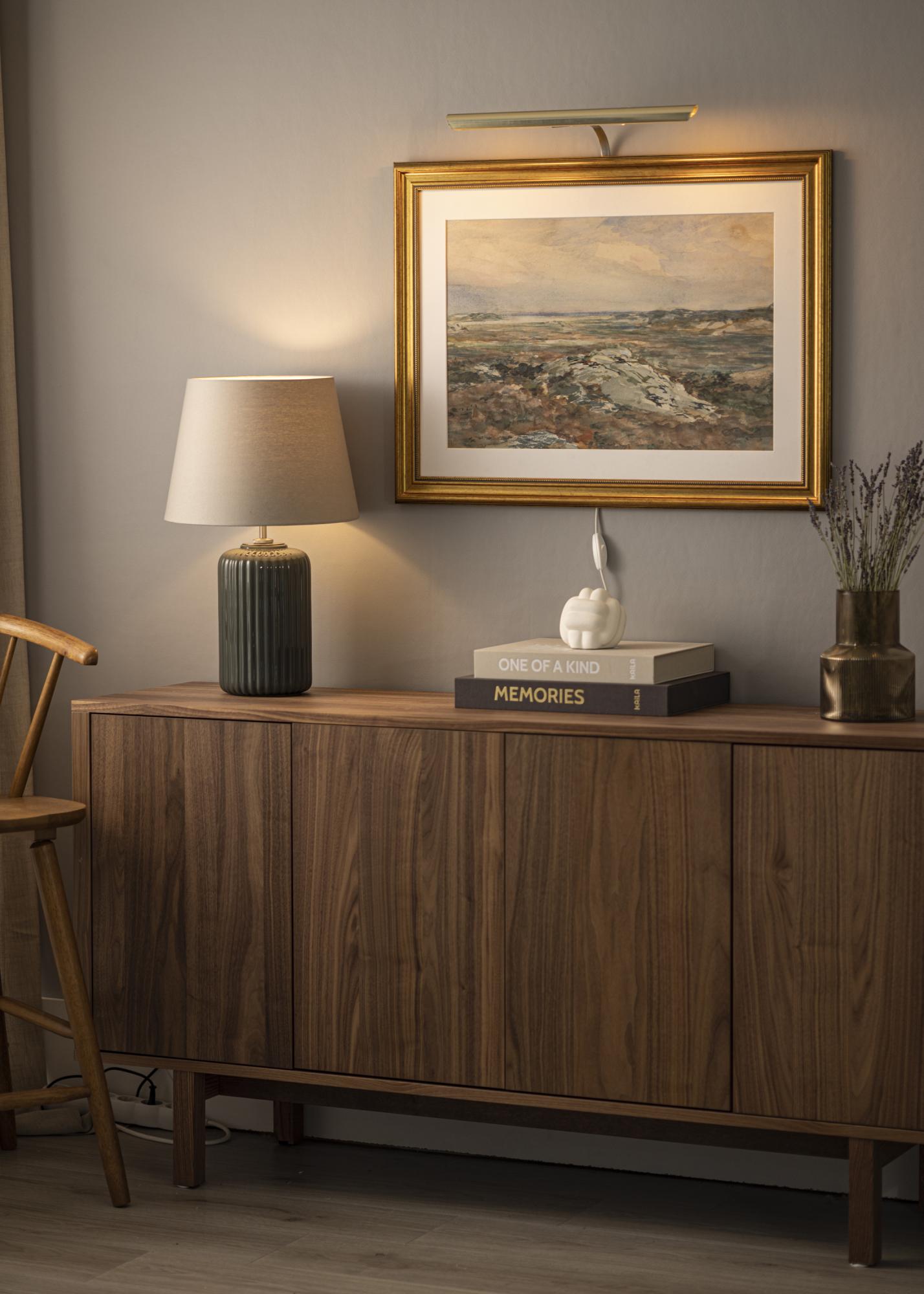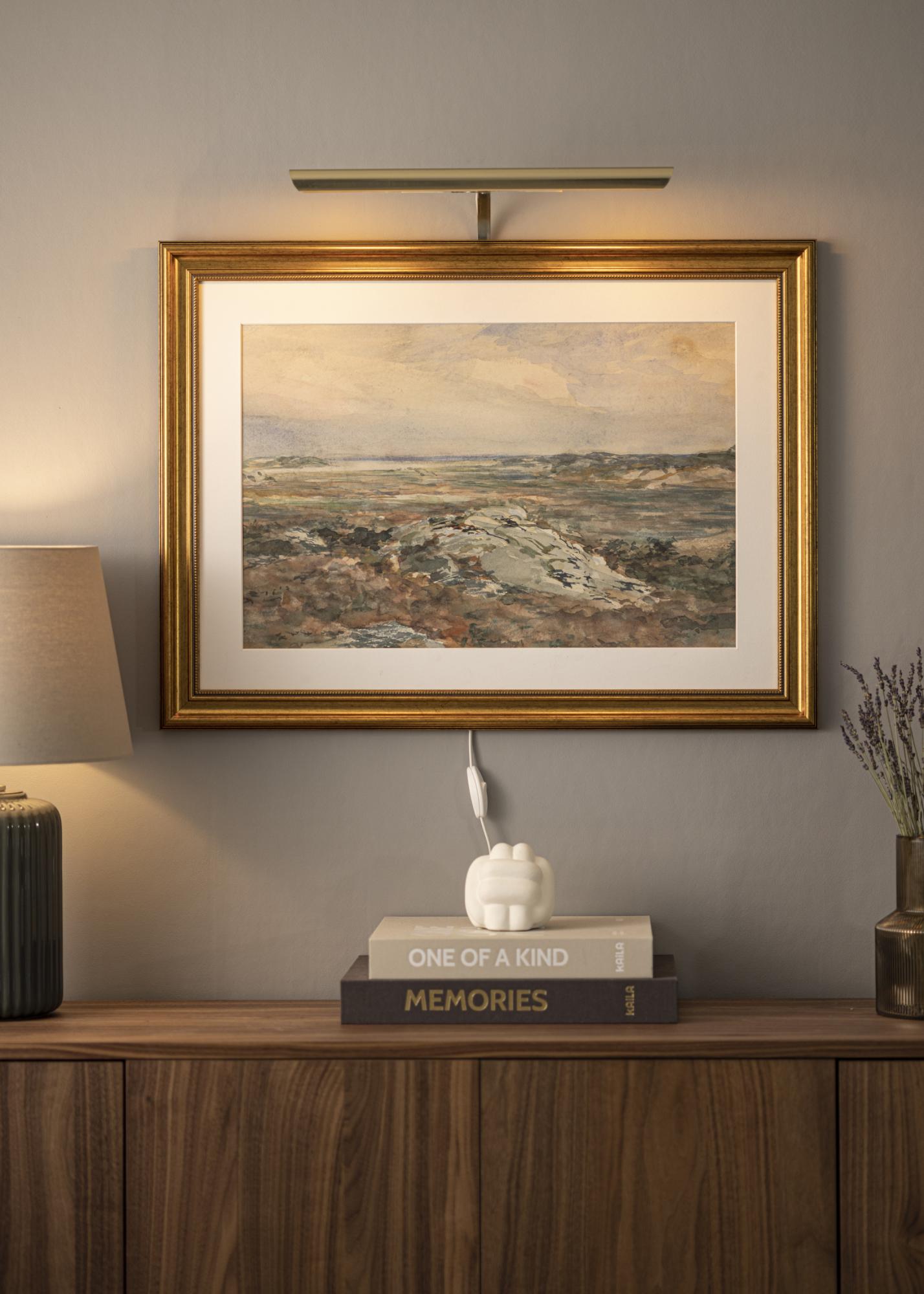 Normalmente, fixa a iluminação para quadros na parte de trás da moldura e a desvantagem disso é que é necessário ter uma moldura de madeira (algumas molduras compostas também funcionam) com um perfil largo para que seja possível aparafusar na moldura. Com o nosso suporte de parede, não precisa se preocupar com isso, basta montar a sua iluminação para quadros diretamente na parede atrás do quadro.