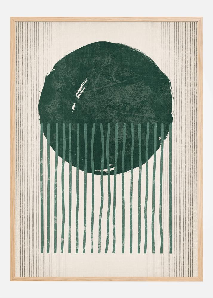 Este pôster convida a uma exploração imaginativa do mundo marinho, com uma imagem estilizada que lembra uma água-viva com seus tentáculos fluindo. A forte forma circular em esmeralda é tanto cativante quanto calmante, enquanto as linhas verticais pintadas de branco, que compõem os 'tentáculos', criam uma sensação de movimento. Esta é uma interpretação artística que combina forma abstrata com fantasia biológica, oferecendo uma abordagem única e moderna ao tema marinho.