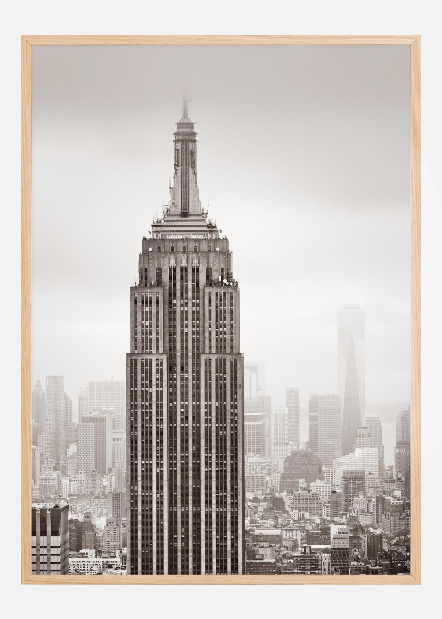 Um póster urbano com o Empire State Building em Nova Iorque. O Empire State Building é o foco aqui, onde ele se destaca com Nova Iorque ao fundo. O resto da cidade está parcialmente escondido na névoa, o que faz com que os detalhes deste arranha-céu se destaquem claramente. Imagine que esta é a sua vista quando pendurar isso em sua casa.