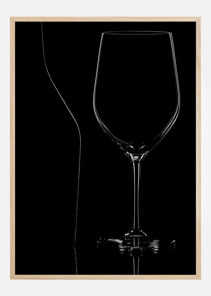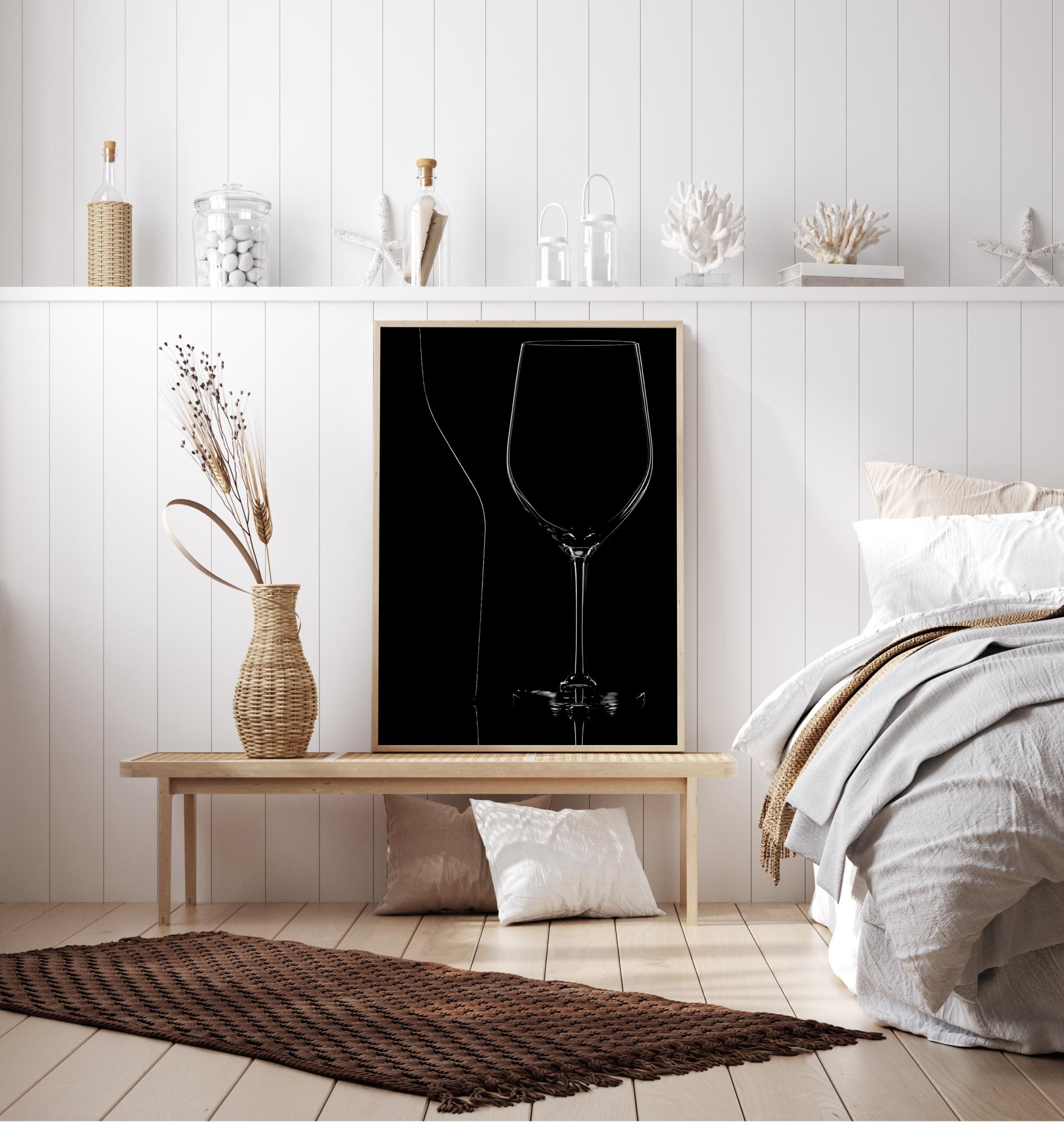 Um elegante póster com uma taça de vinho num fundo preto. Esta imagem abstrata irradia classe, pois você só vê o copo através da luz refletida ao redor das bordas. Combine isso com uma parede branca para manter a elegância dramática.