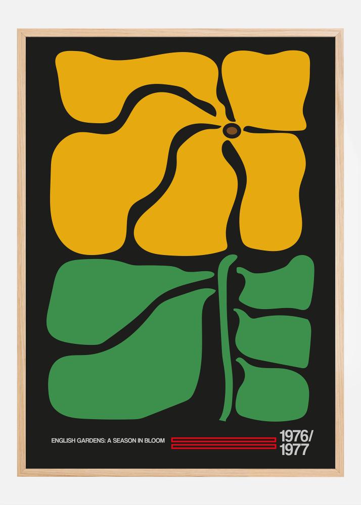 Este cartaz é uma interpretação elegante e conceitual das maravilhas da natureza, e o texto '1976/1977' dá uma sensação de um evento histórico ou recorrente, como uma floração anual ou uma exposição especial. O design é minimalista, mas expressivo, usando formas geométricas para representar uma flor e suas folhas de uma maneira quase abstrata. É uma escolha ideal para todos que apreciam arte que captura a essência da natureza sem retratá-la em sua forma literal. Este poster certamente despertará conversas e admiração em qualquer sala onde for exibido.