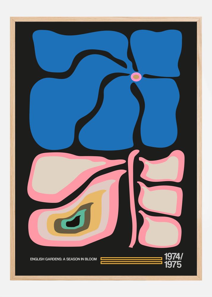 Este criativo e colorido pôster 'English Gardens: A Season in Bloom' é uma homenagem estética à diversidade e esplendor da floração nos jardins. O pôster chama a atenção com sua forte flor azul, que contrasta com um fundo preto, complementada com cores de destaque em rosa, bege e um toque de verde. Esta combinação especial de cores oferece uma interpretação ousada e contemporânea de um clássico jardim inglês em plena floração. O ano '1974/1975' adiciona uma dimensão histórica que talvez sugira um período significativo para jardins ou a arte.