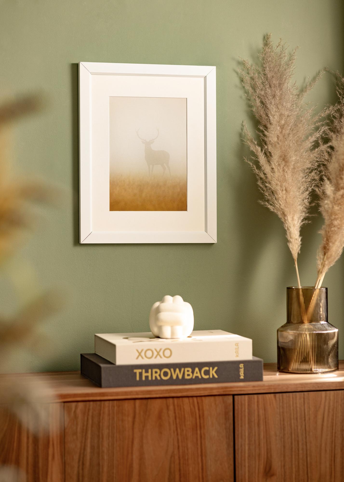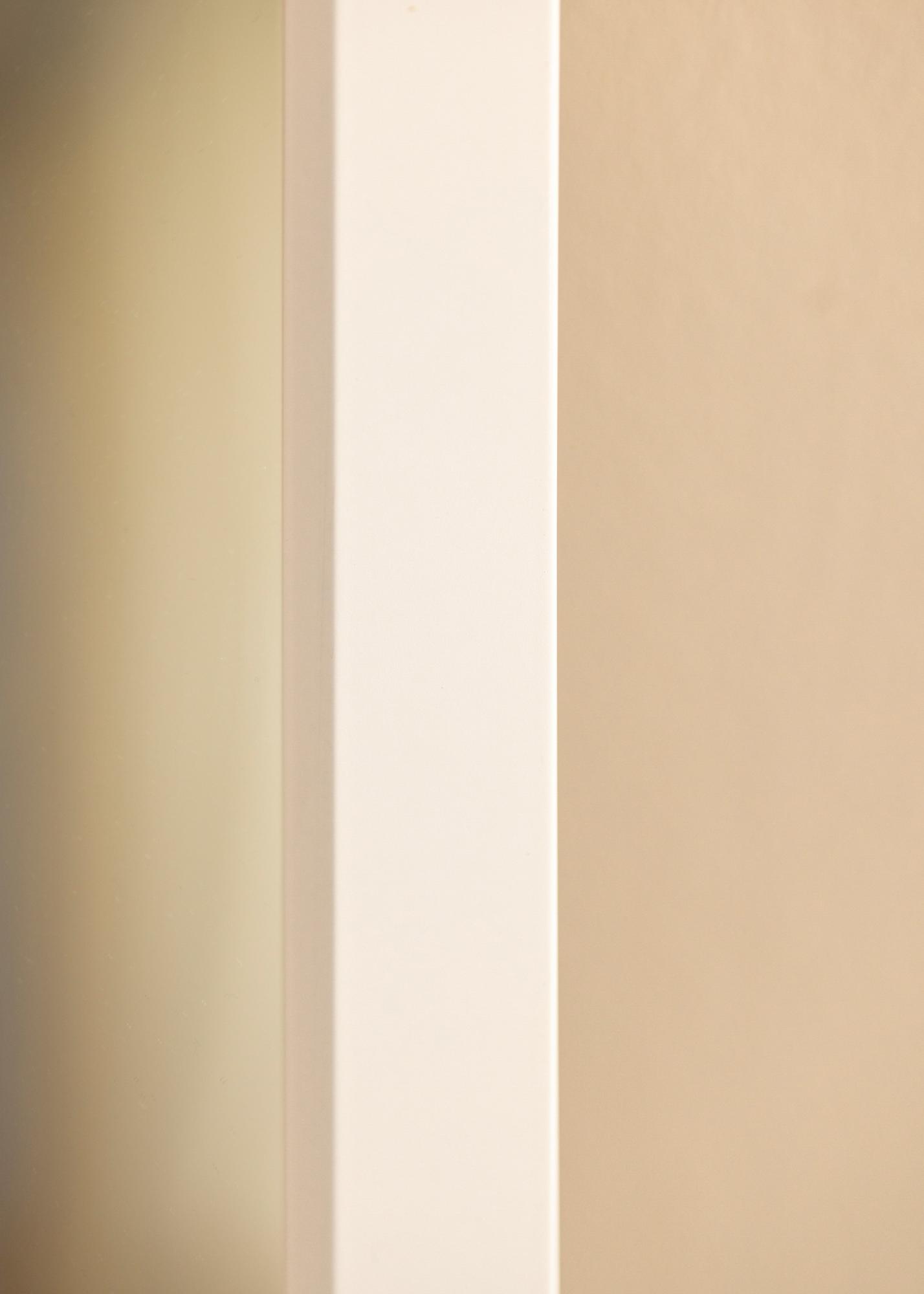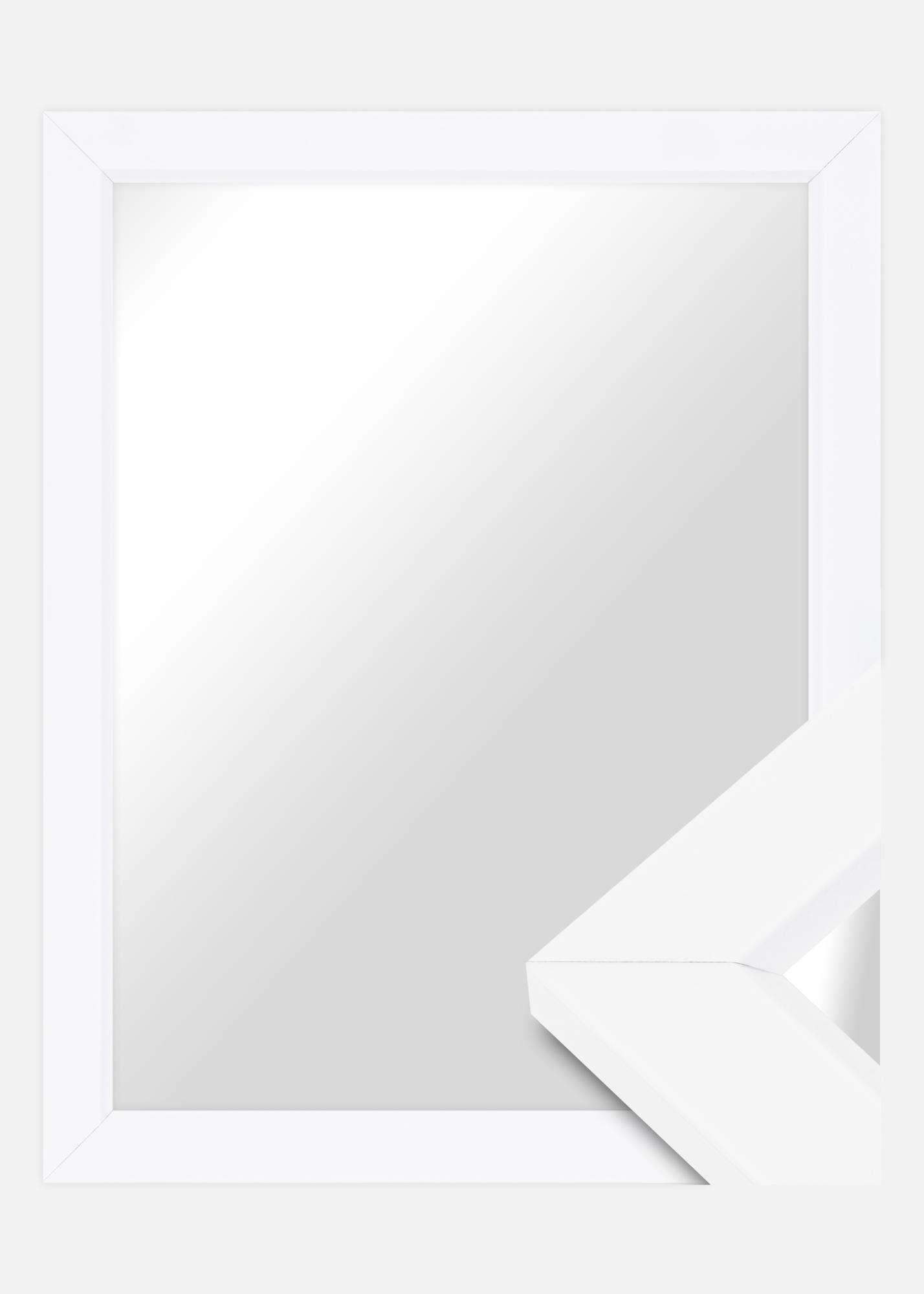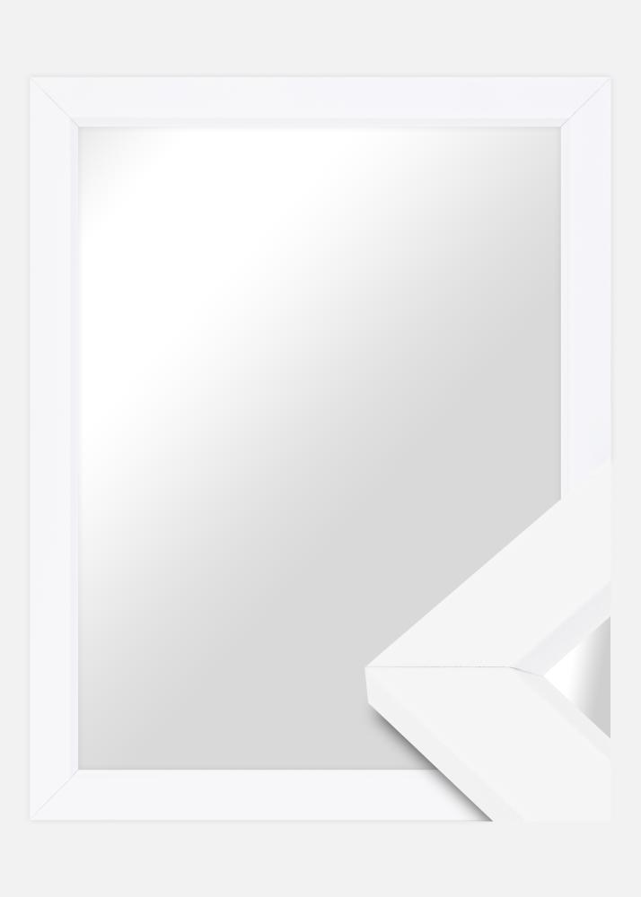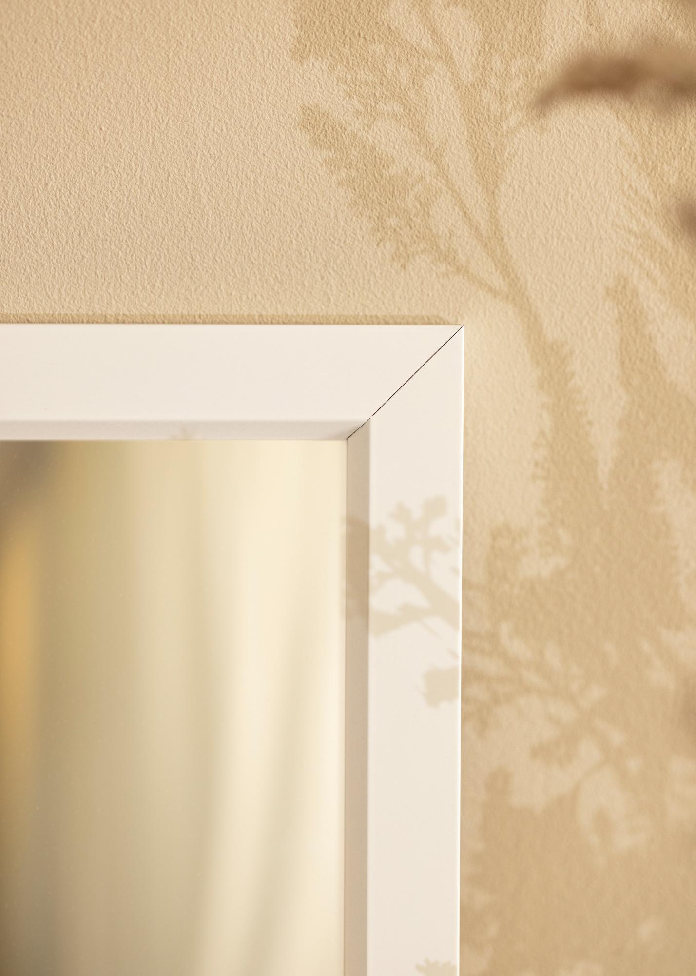 Espelho elegante com uma moldura branca simples feita de alumínio que possui uma borda interna chanfrada. O visual elegante e esbelto da moldura faz com que o espelho se encaixe bem em todas as divisões da casa, independentemente do estilo de decoração, mas fica especialmente bonito num ambiente claro com uma inclinação para o minimalismo. Combine o espelho com pósteres gráficos em molduras brancas nas paredes e objetos de vidro como acessórios para criar uma sensação de luminosidade e leveza na decoração.