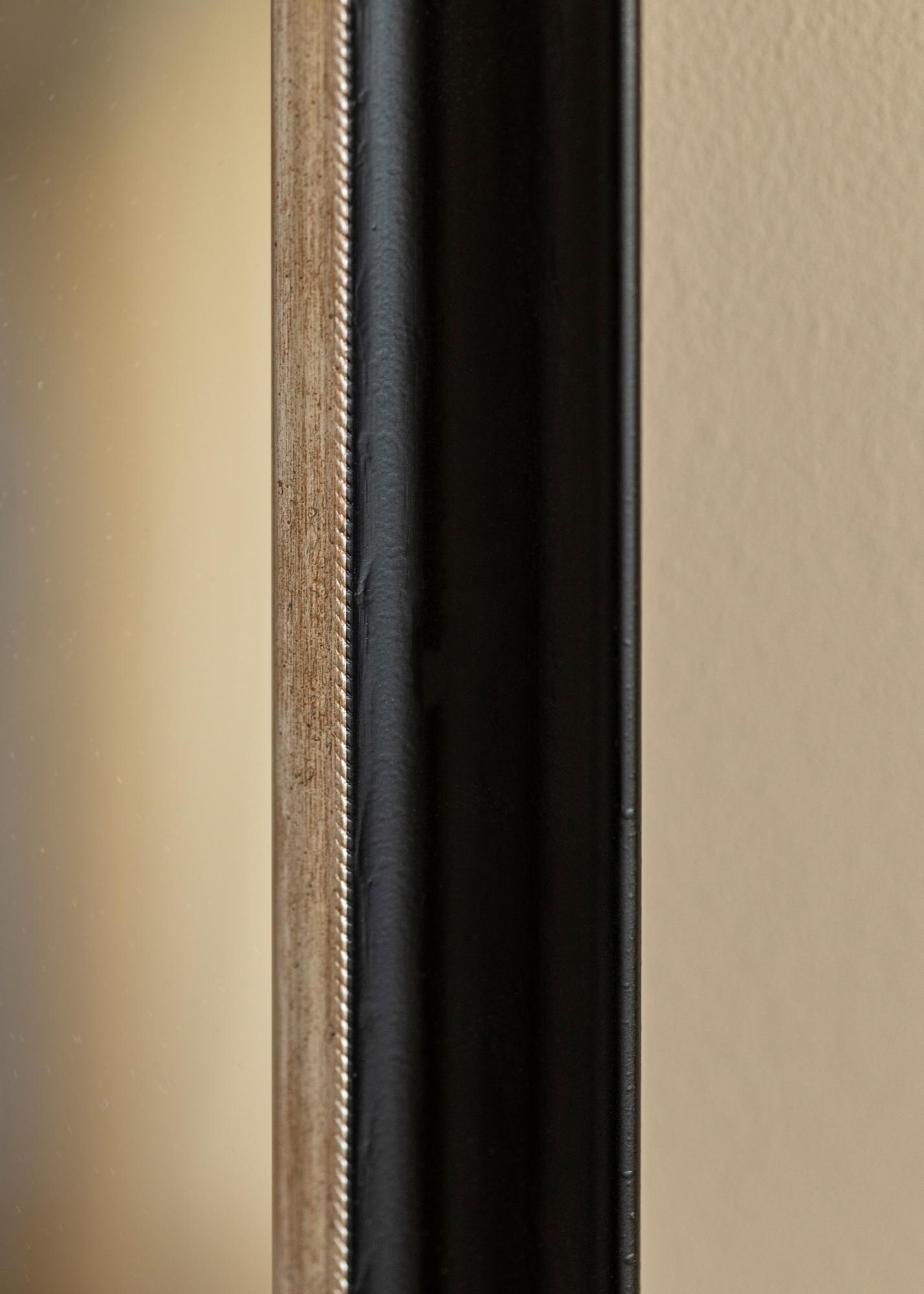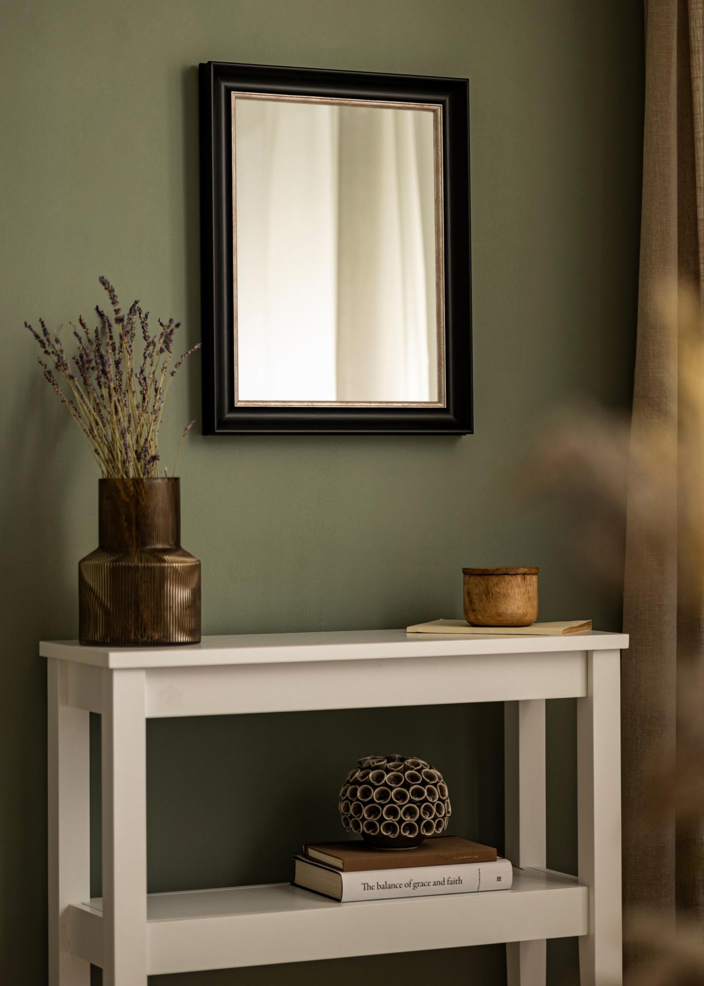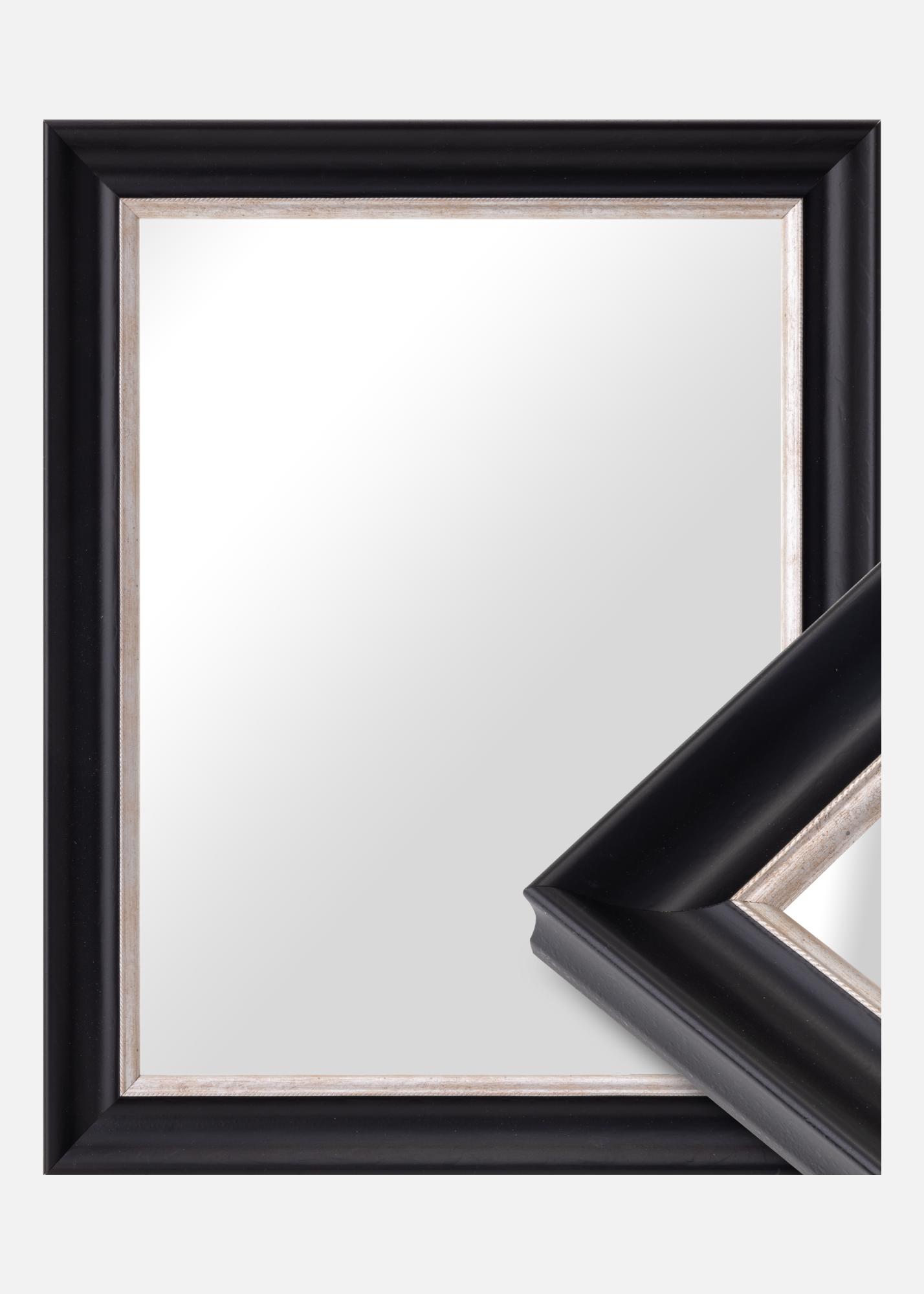 Espelho luxuoso em qualquer tamanho com um perfil clássico preto. Próximo à imagem, há uma elegante borda prateada que dá ao espelho um brilho extra.