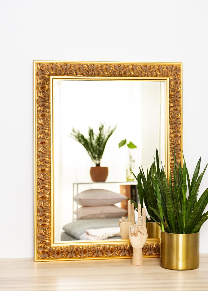 Dê ao seu lar um toque luxuoso com decorações que remetem ao estilo barroco. Este espelho possui alta qualidade e uma moldura barroca elegante. A moldura é feita de madeira proveniente de uma floresta sustentável e é pintada em diferentes tons de ouro. Próximo ao vidro, há uma fina moldura dourada clara. Como o espelho está disponível em 7 tamanhos diferentes, encontrará tanto um espelho para a penteadeira quanto um espelho de corpo inteiro.