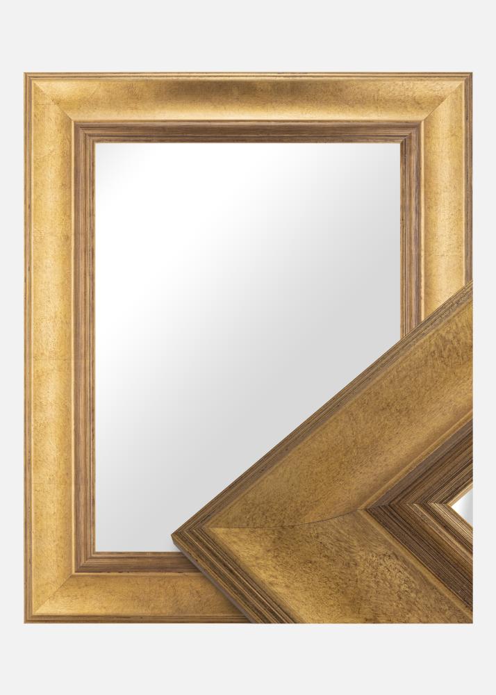 A moldura é feita de pinho e tem um belo tom dourado escuro que proporciona uma sensação de luxo e elegância. A superfície escovada possui variações sutis que criam uma sensação ligeiramente envelhecida, dando ao espelho um charme atemporal. As linhas finas ao longo das bordas contribuem para uma riqueza de detalhes sofisticados que fazem o espelho se destacar.