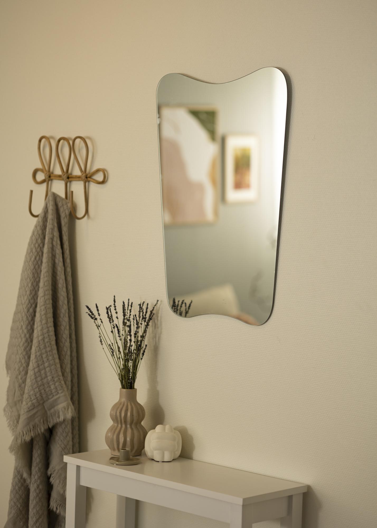 Descubra o espelho elegante e moderno, projetado para complementar qualquer cômodo com seu charme único. Este espelho com formato único possui curvas suaves e fluidas que conferem um toque moderno ao formato retangular clássico, e não possui moldura visível, criando um visual elegante e sem costura. Com suas generosas dimensões de 50x70 cm, ele se torna um detalhe prático e decorativo em sua casa.