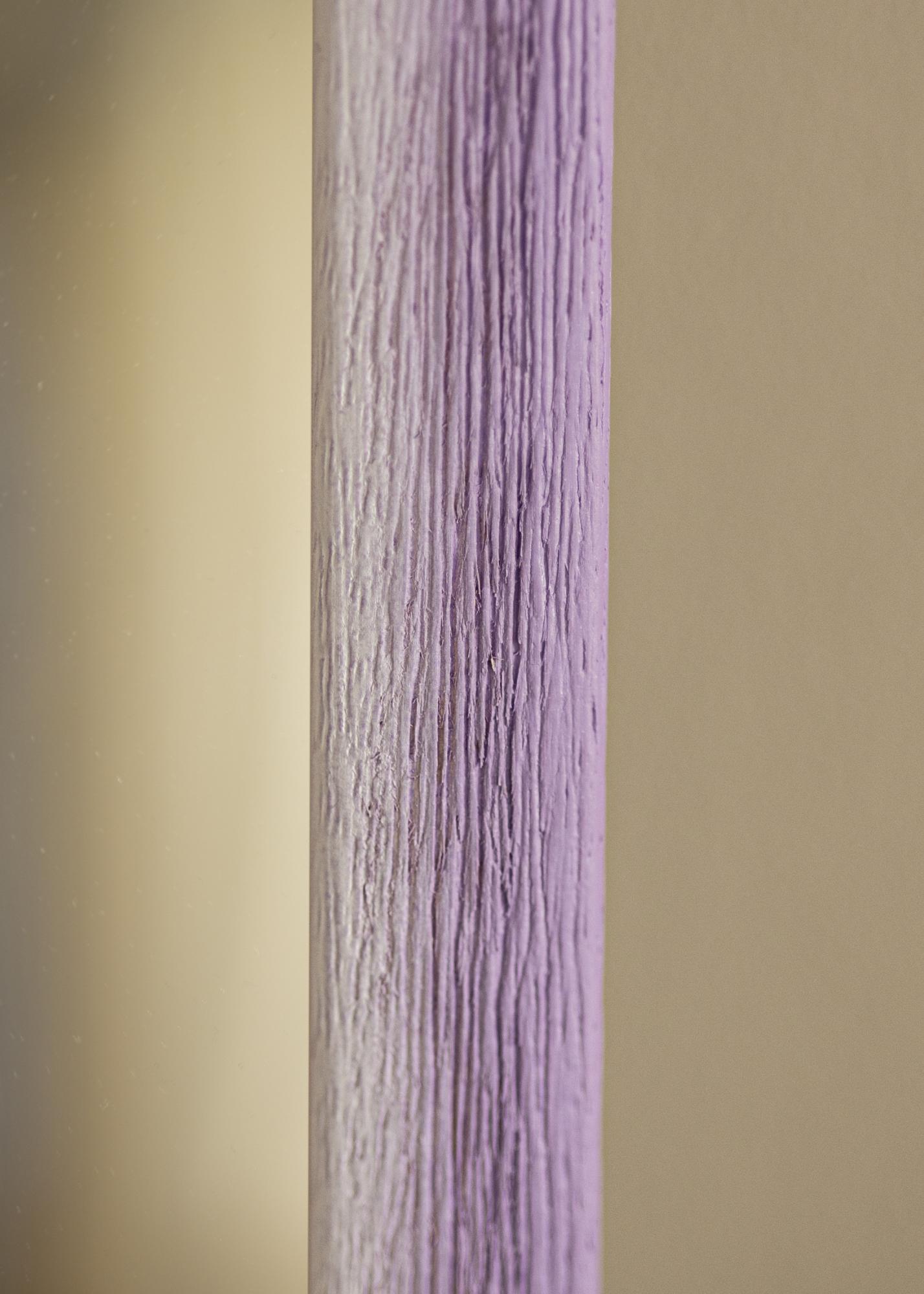 A cor lilás clara do espelho tem uma transição suave de um tom quase branco osso para um suave tom lavanda lilás. Isso dá ao espelho uma sensação harmônica e tranquila, tornando-o ideal para criar uma atmosfera relaxante em sua casa. A estrutura de madeira proeminente com veios verticais contribui para uma sensação natural e rústica, fazendo com que o espelho se integre bem em decorações tanto modernas quanto tradicionais.