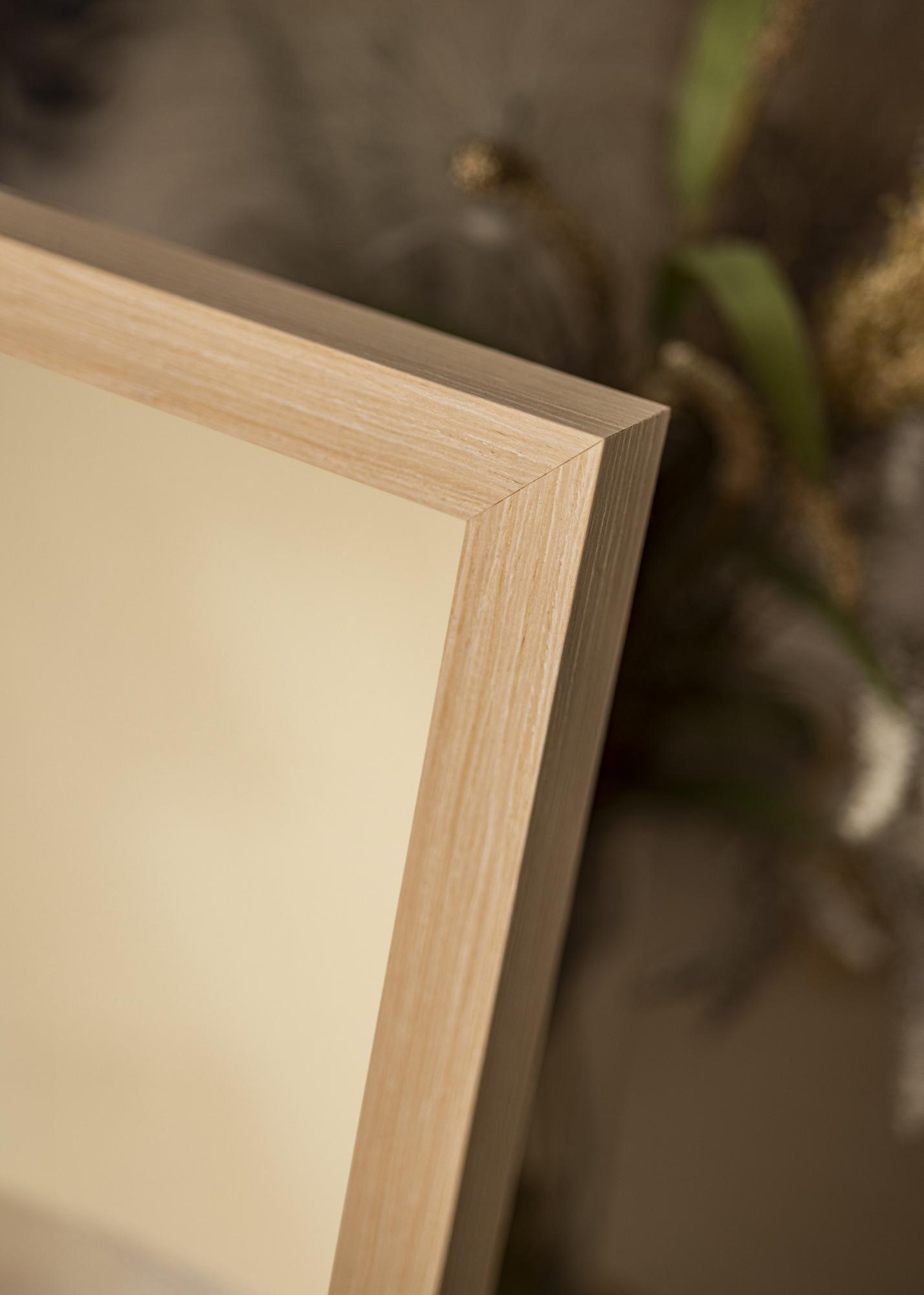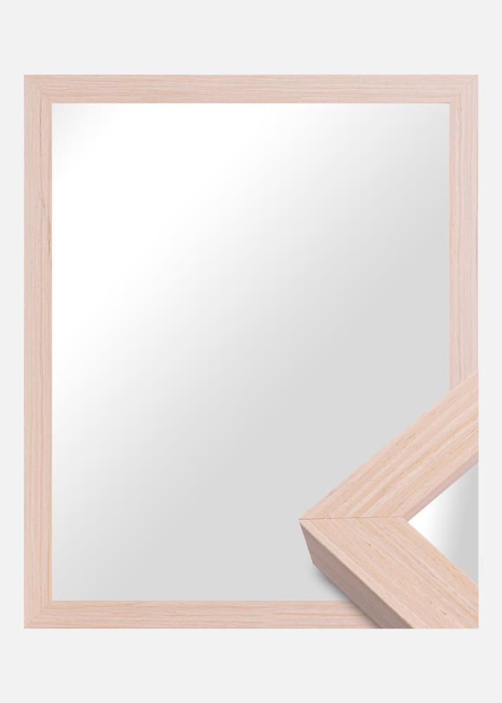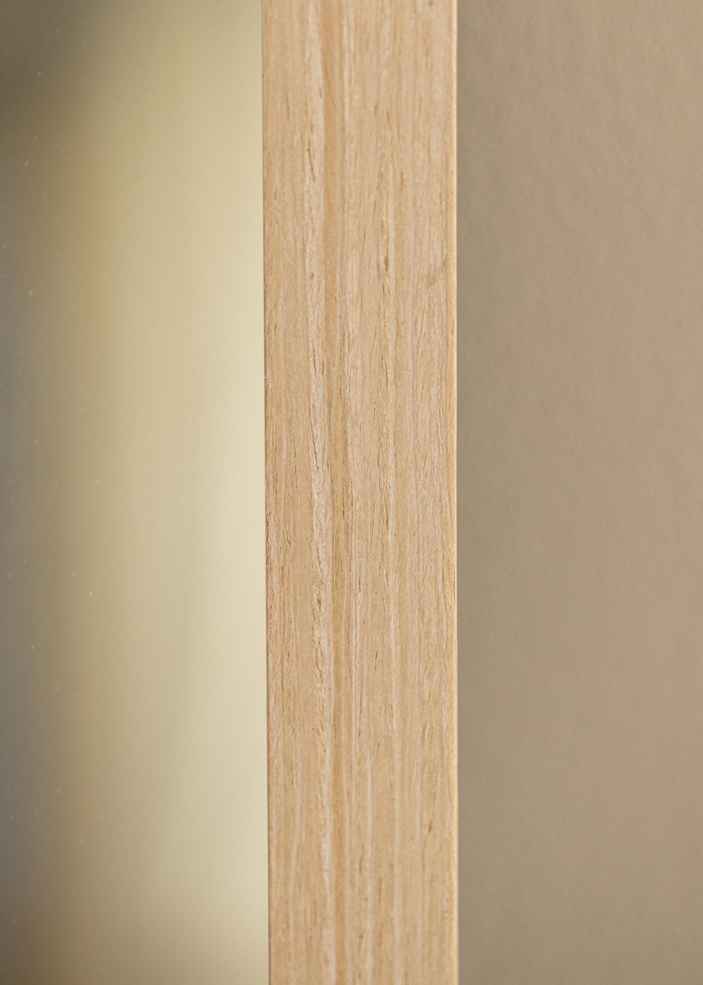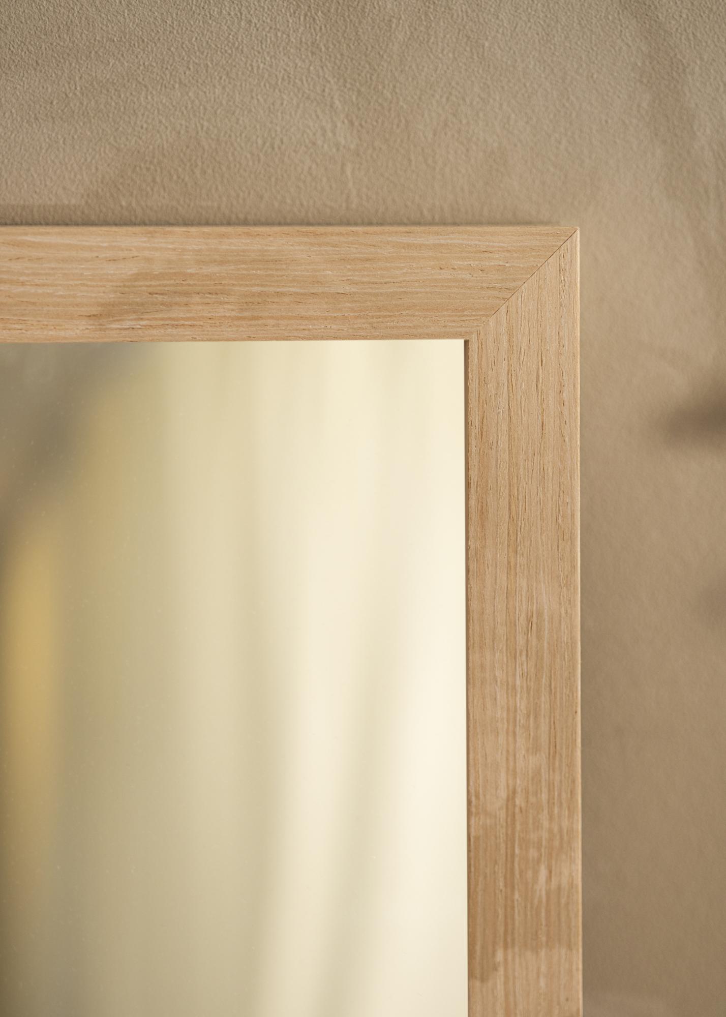 A moldura do espelho tem 28 mm de largura e uma profundidade de 33 mm, o que proporciona uma sensação estável e robusta sem dominar o ambiente. Feito de pinho, combina durabilidade com leveza, tornando-o fácil de manusear e montar. O acabamento acetinado destaca a estrutura natural da madeira sem refletir luz, criando uma atmosfera agradável no ambiente.