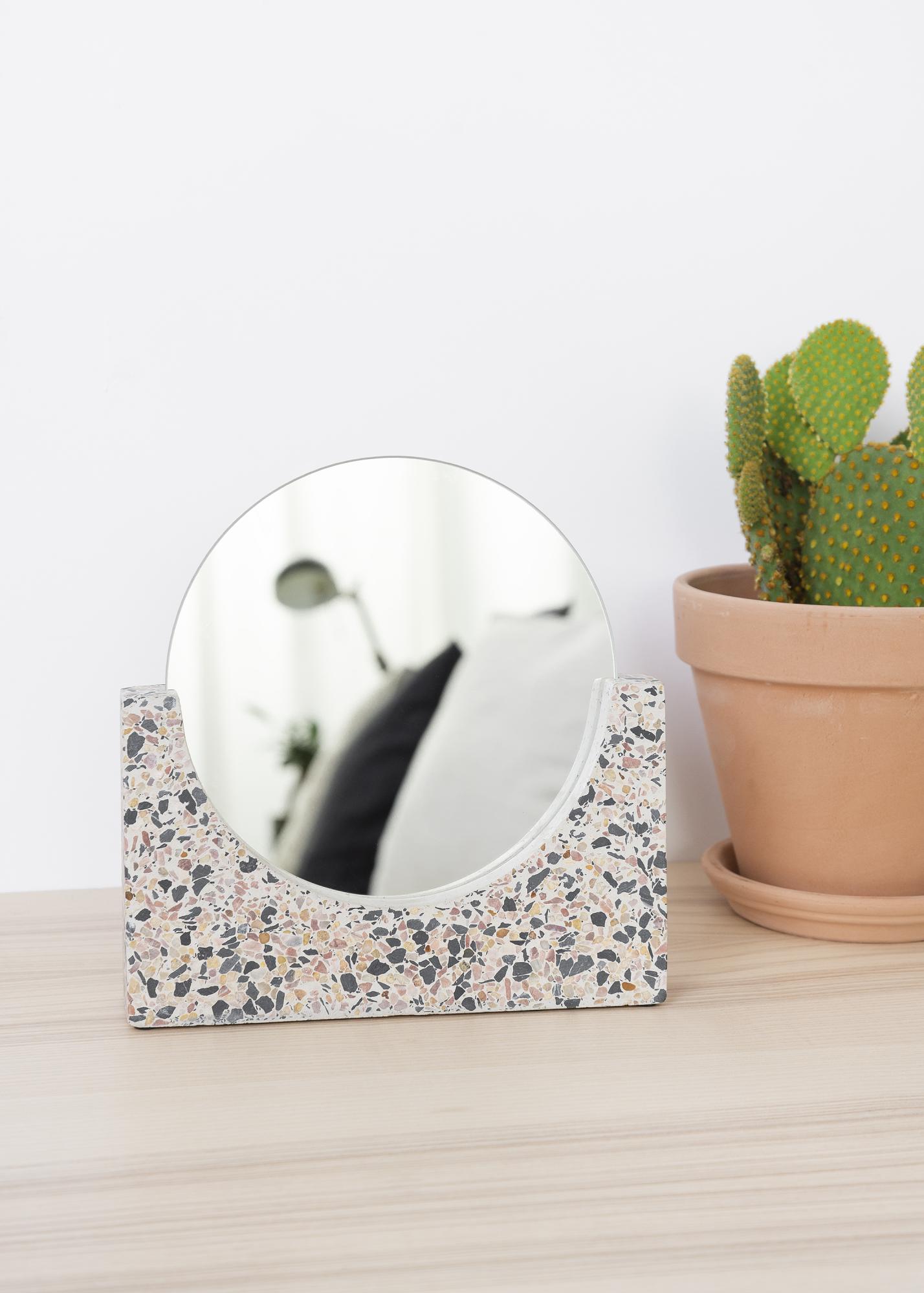 Este espelho redondo de mesa é quase uma obra de arte! Um suporte elegante e resistente em belo Terrazzo branco (pedra sintético) faz deste espelho muito mais do que apenas funcional. É um detalhe de decoração de bom gosto que adiciona design moderno a qualquer sala em que escolher colocá-lo.