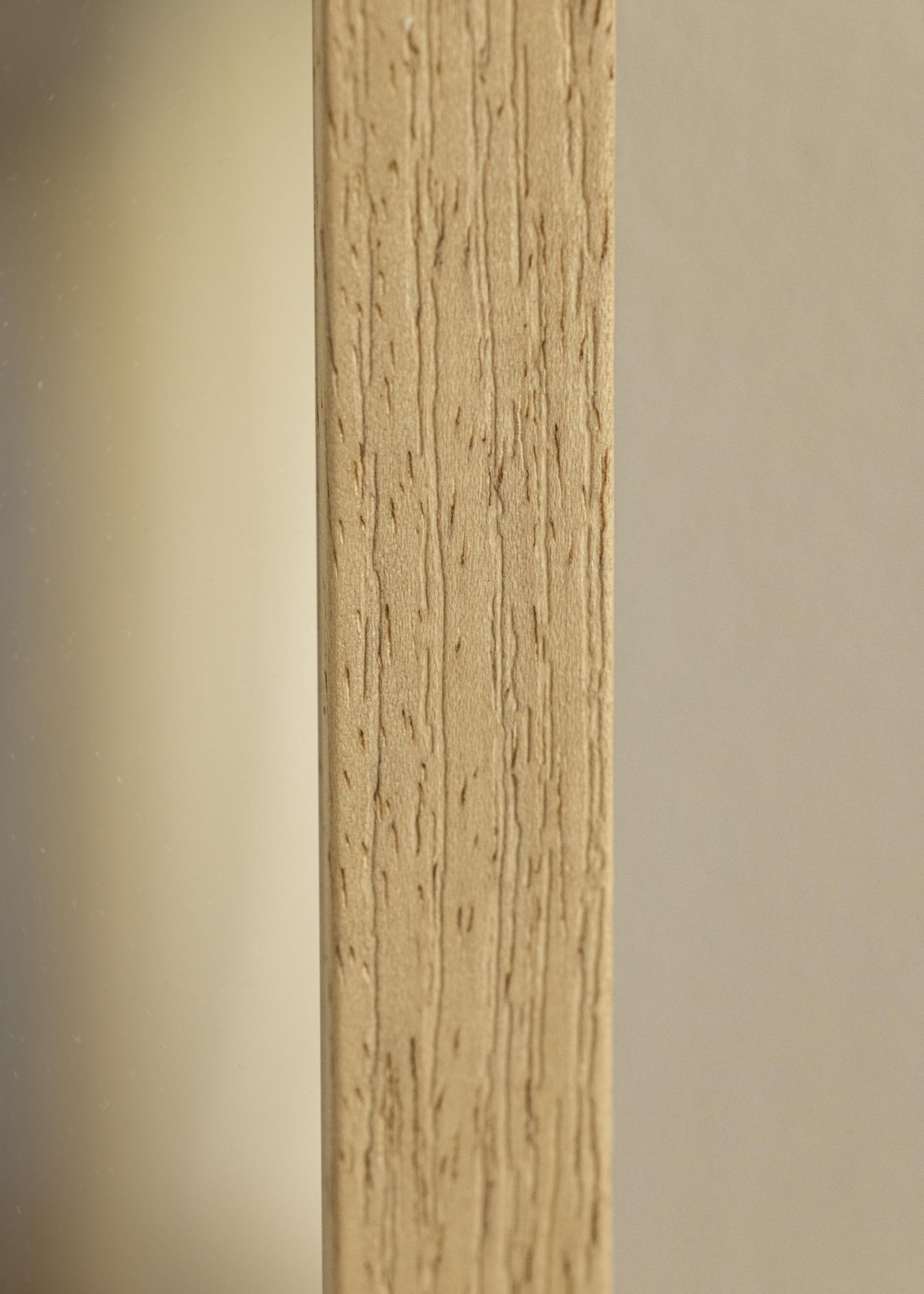 A moldura do espelho é feita de madeira ayos, o que lhe confere tanto durabilidade quanto estilo. Com uma largura de 20 mm e uma profundidade de 20 mm, a moldura tem uma presença discreta mas ainda assim evidente que enquadra o vidro do espelho de forma elegante. A superfície tem um acabamento fosco com uma sensação ligeiramente texturizada, o que contribui para o charme do espelho e o torna uma excelente escolha tanto para decorações modernas quanto tradicionais.