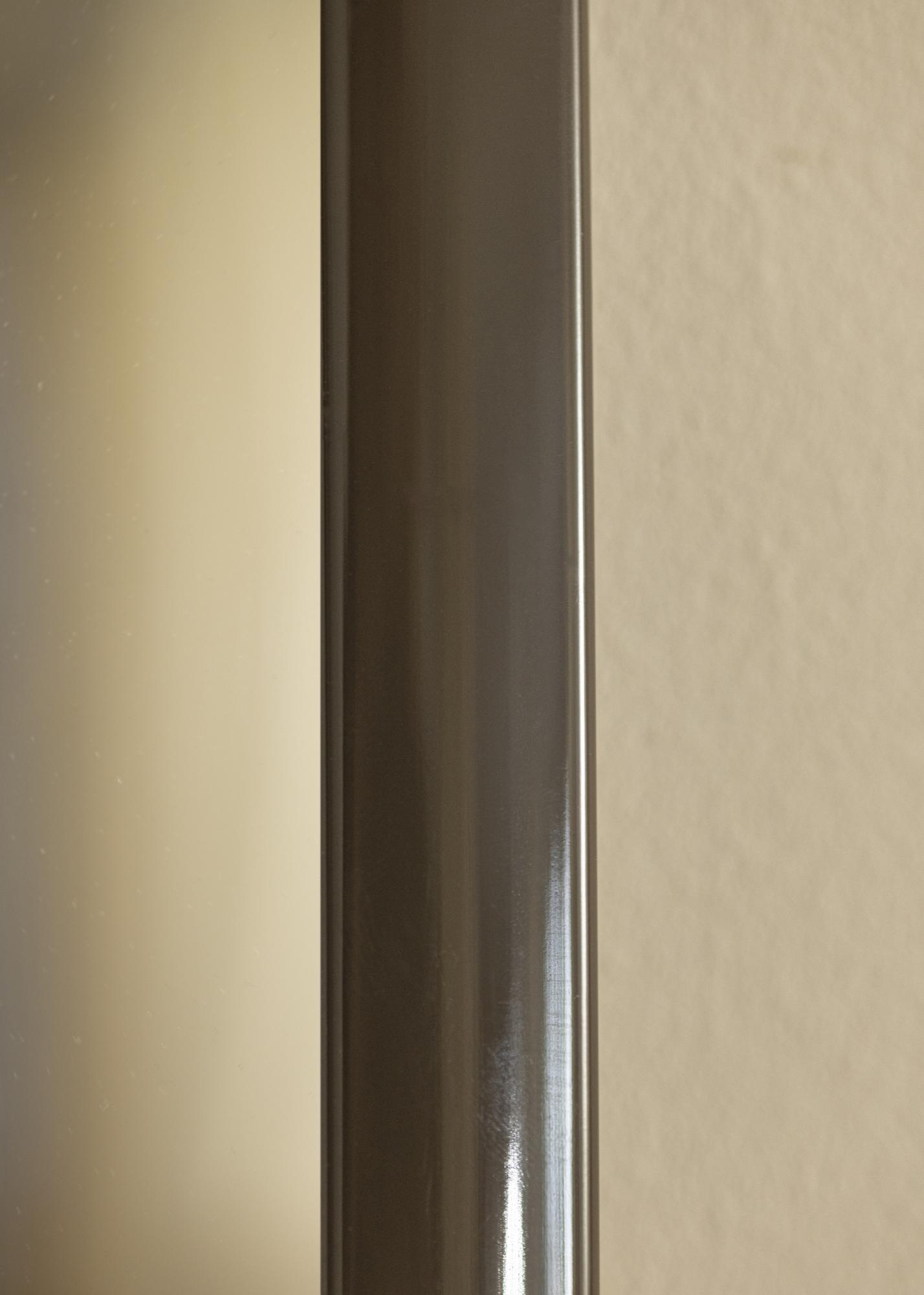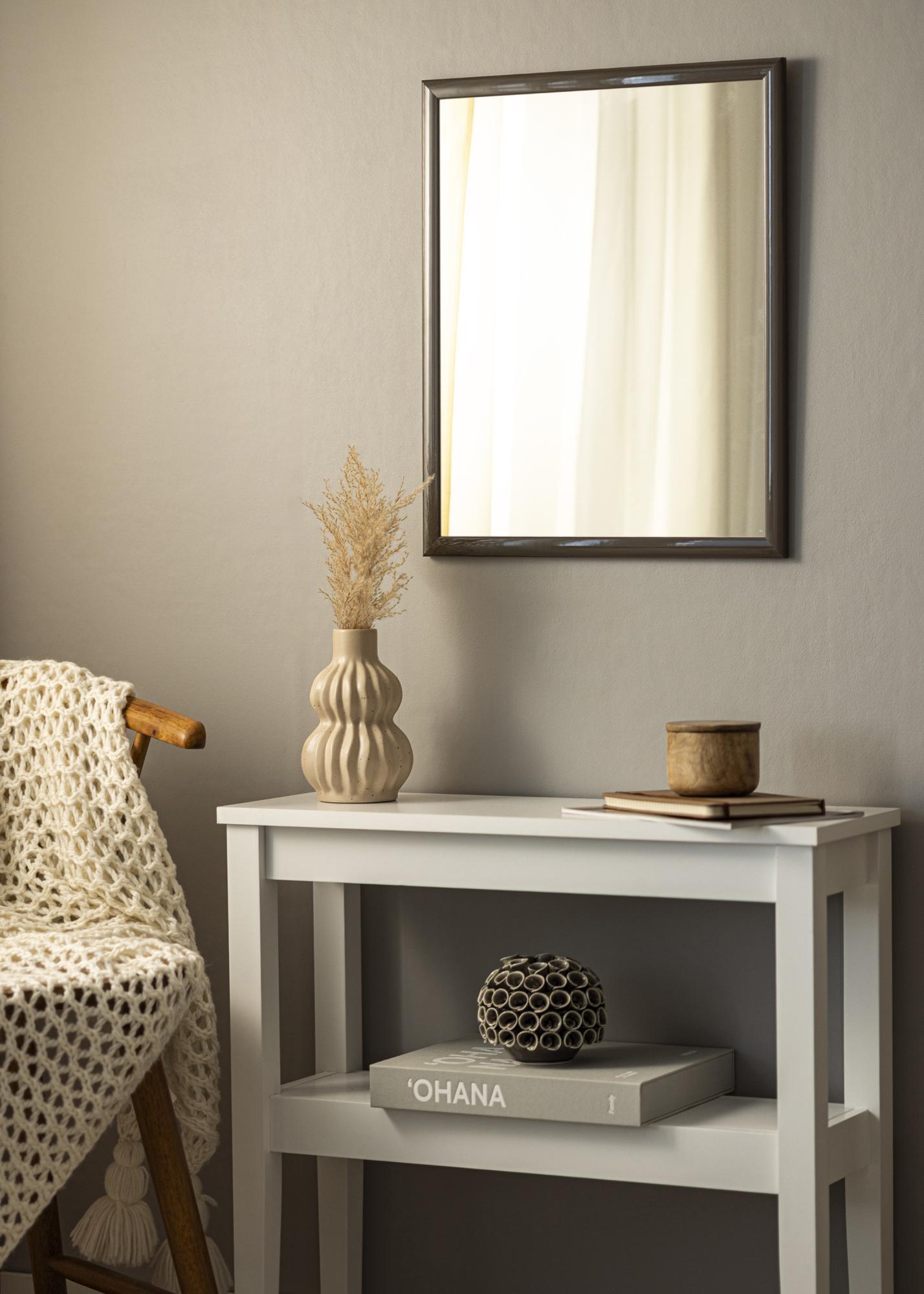 A moldura do espelho tem 23 mm de largura e é feita de madeira de ayós, o que proporciona uma construção robusta e durável. Com uma profundidade de 13 mm, o espelho tem um perfil discreto que se mistura na maioria dos ambientes sem ser dominante. A tonalidade cinza escura é tanto moderna quanto atemporal, fazendo com que o espelho se encaixe em diferentes estilos de decoração, desde os minimalistas aos mais tradicionais.