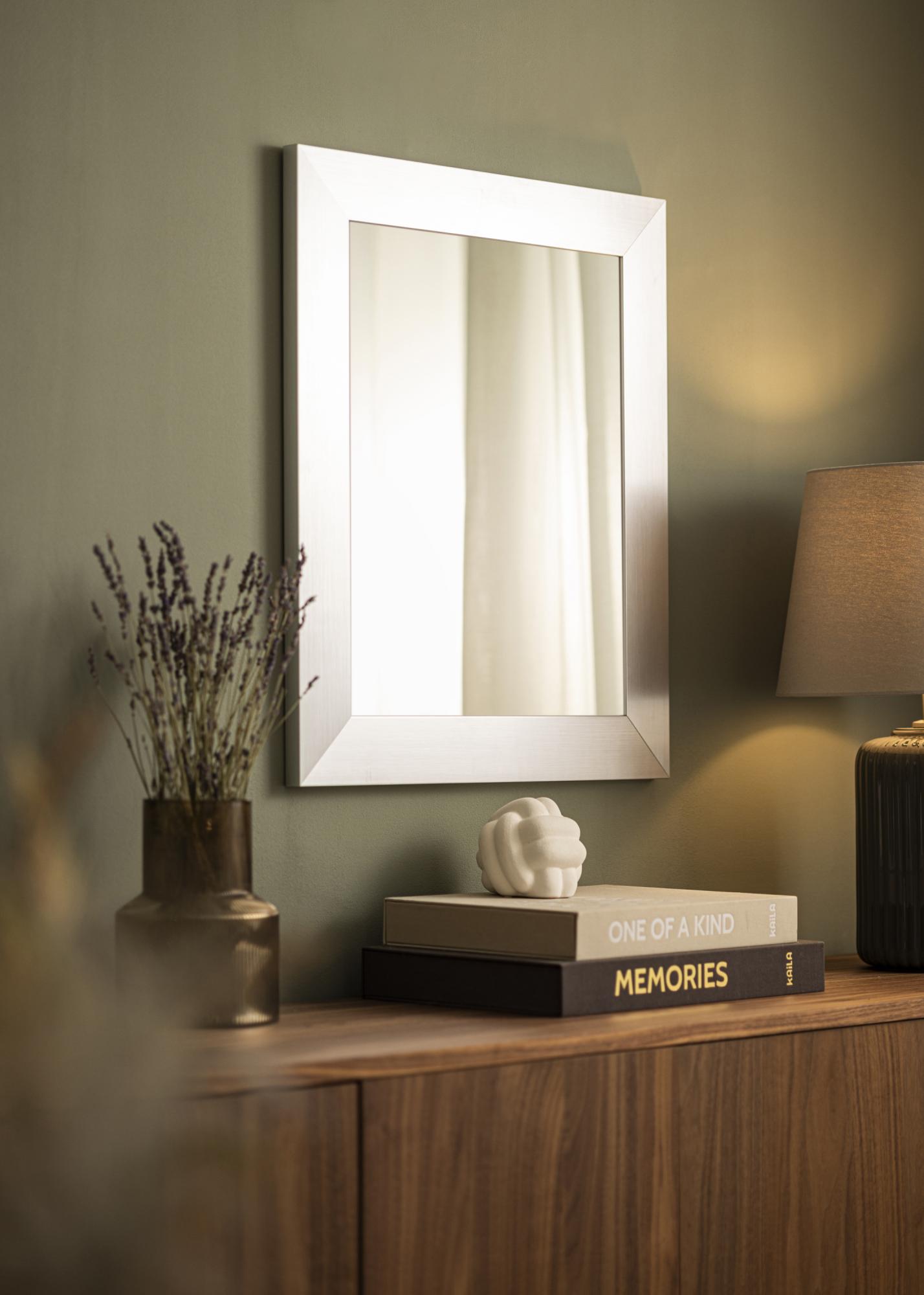Espelho Dover Liso Prata é um espelho elegante e sofisticado que fabricamos com grande cuidado. Este espelho é perfeito para quem busca um detalhe de decoração moderna com um toque de luxo. Com sua moldura larga em acabamento prata escovado, oferece uma impressão sofisticada e é ideal tanto para ambientes modernos quanto clássicos.