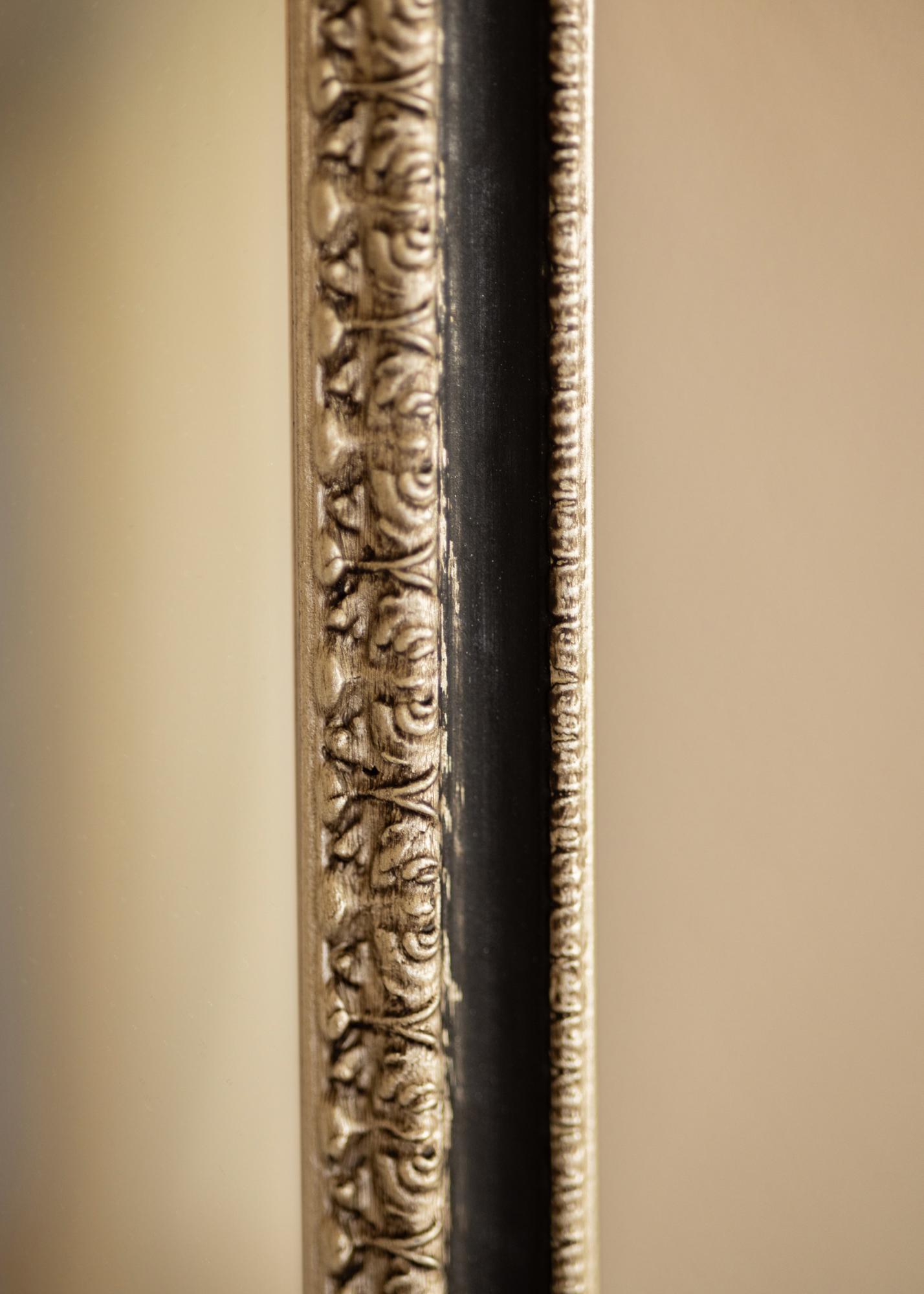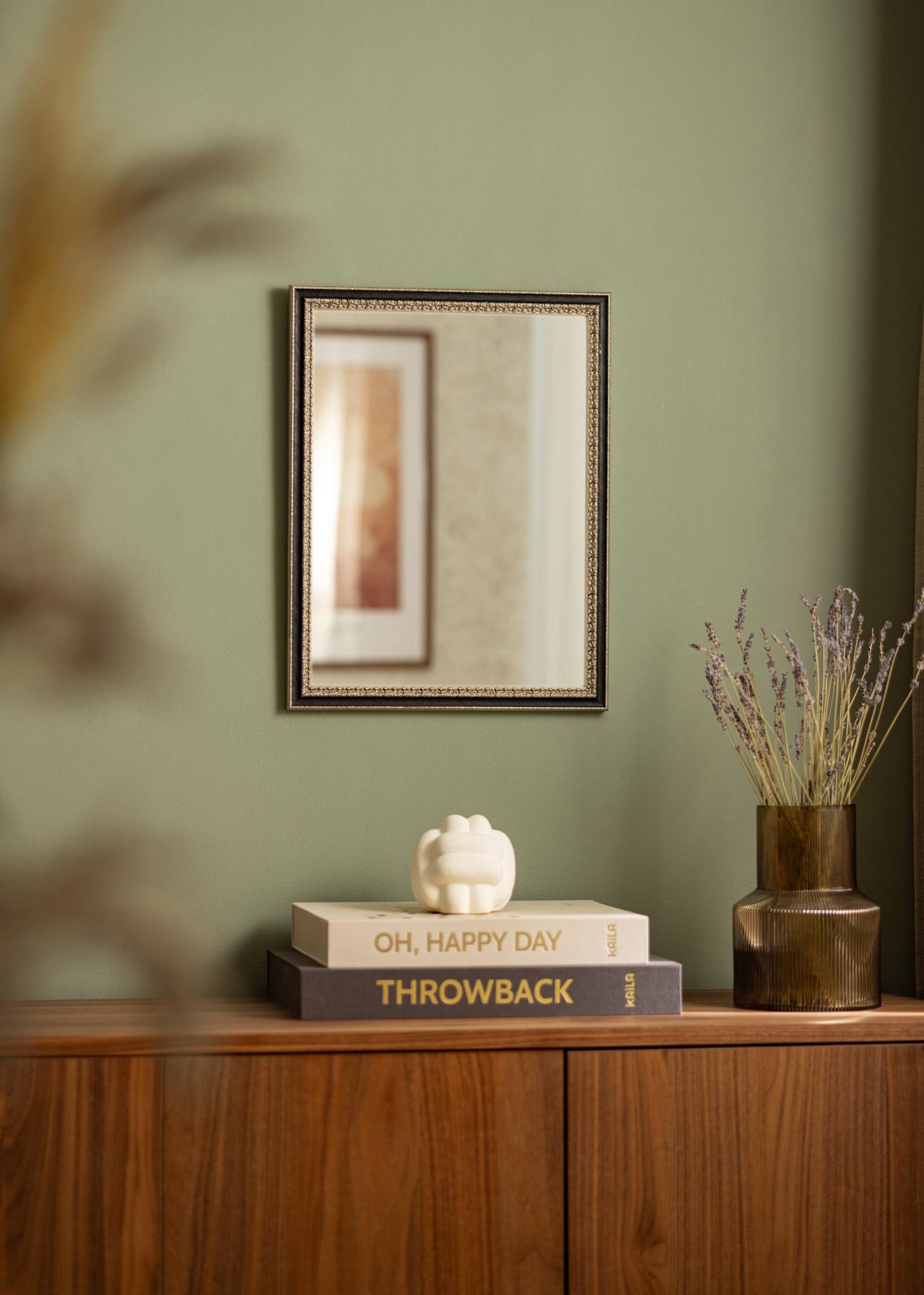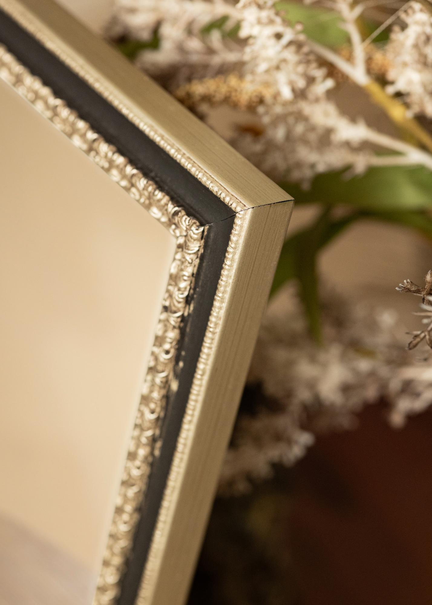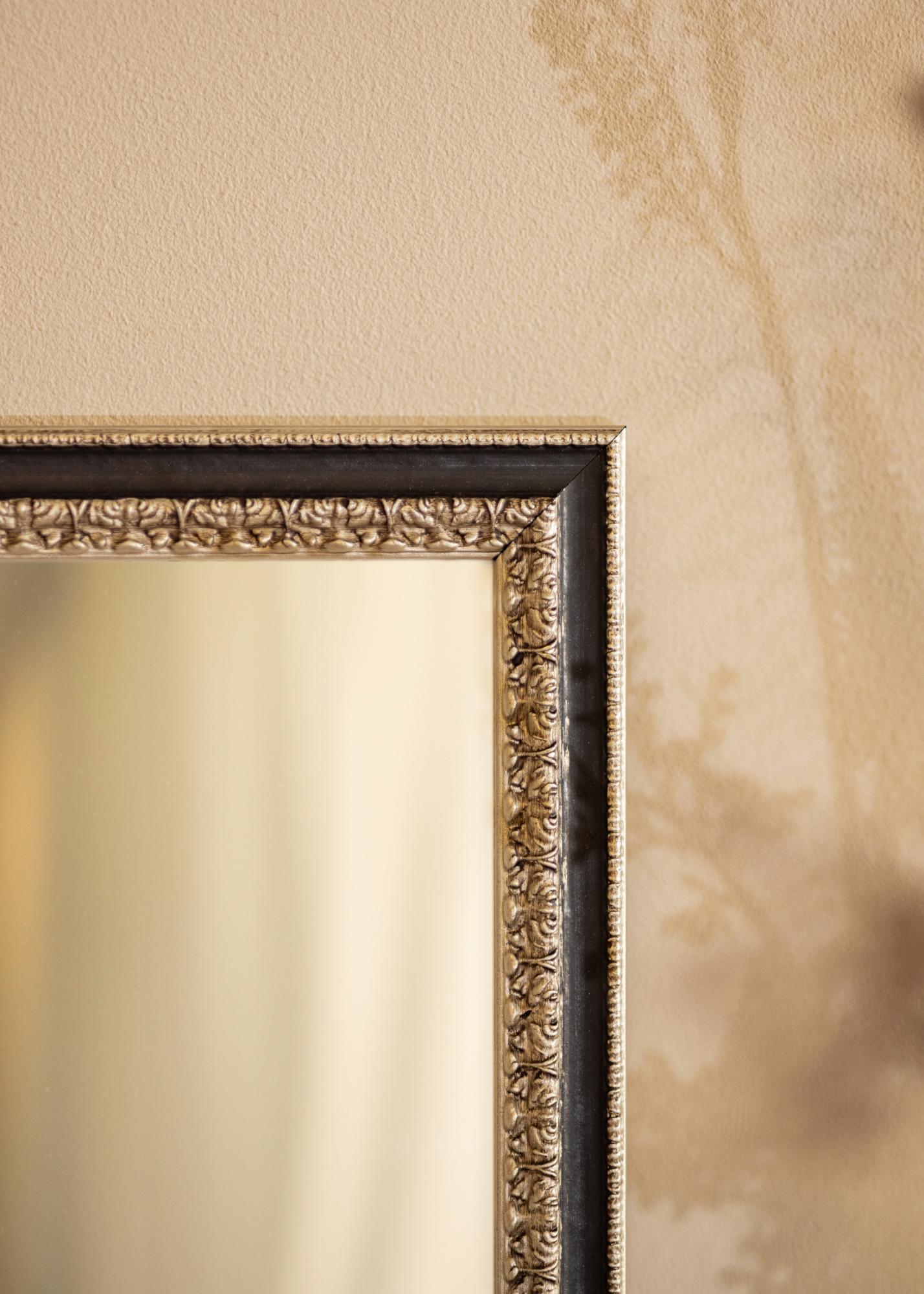 A moldura é feita de madeira e possui um acabamento em ouro antigo com ornamentos decorativos que dão ao espelho uma sensação clássica e atemporal. Os detalhes ornamentados são ainda realçados pela borda preta, criando um equilíbrio harmonioso entre o antigo e o moderno.
