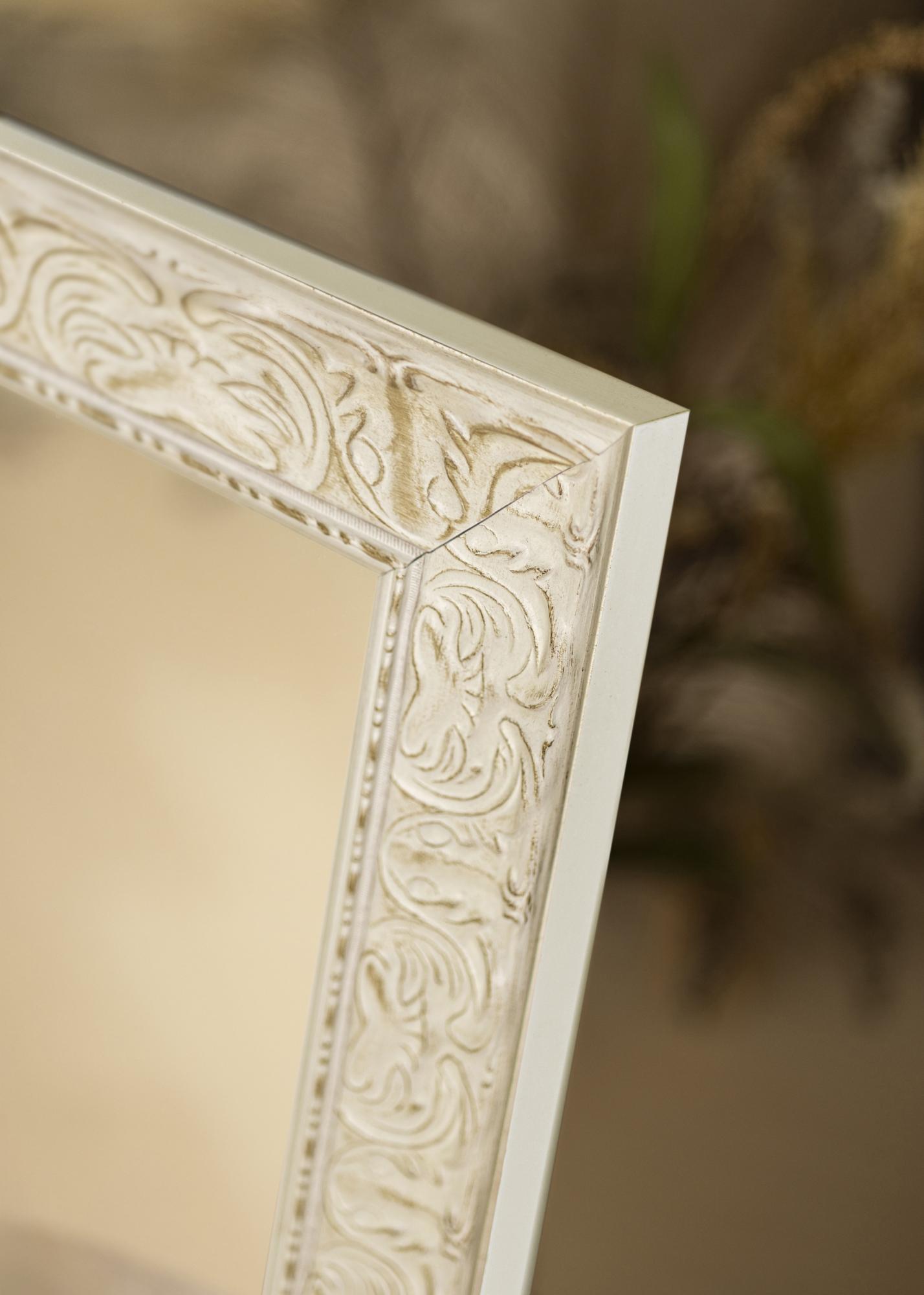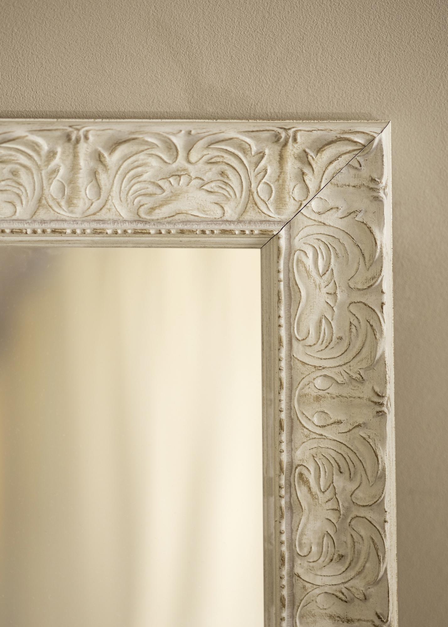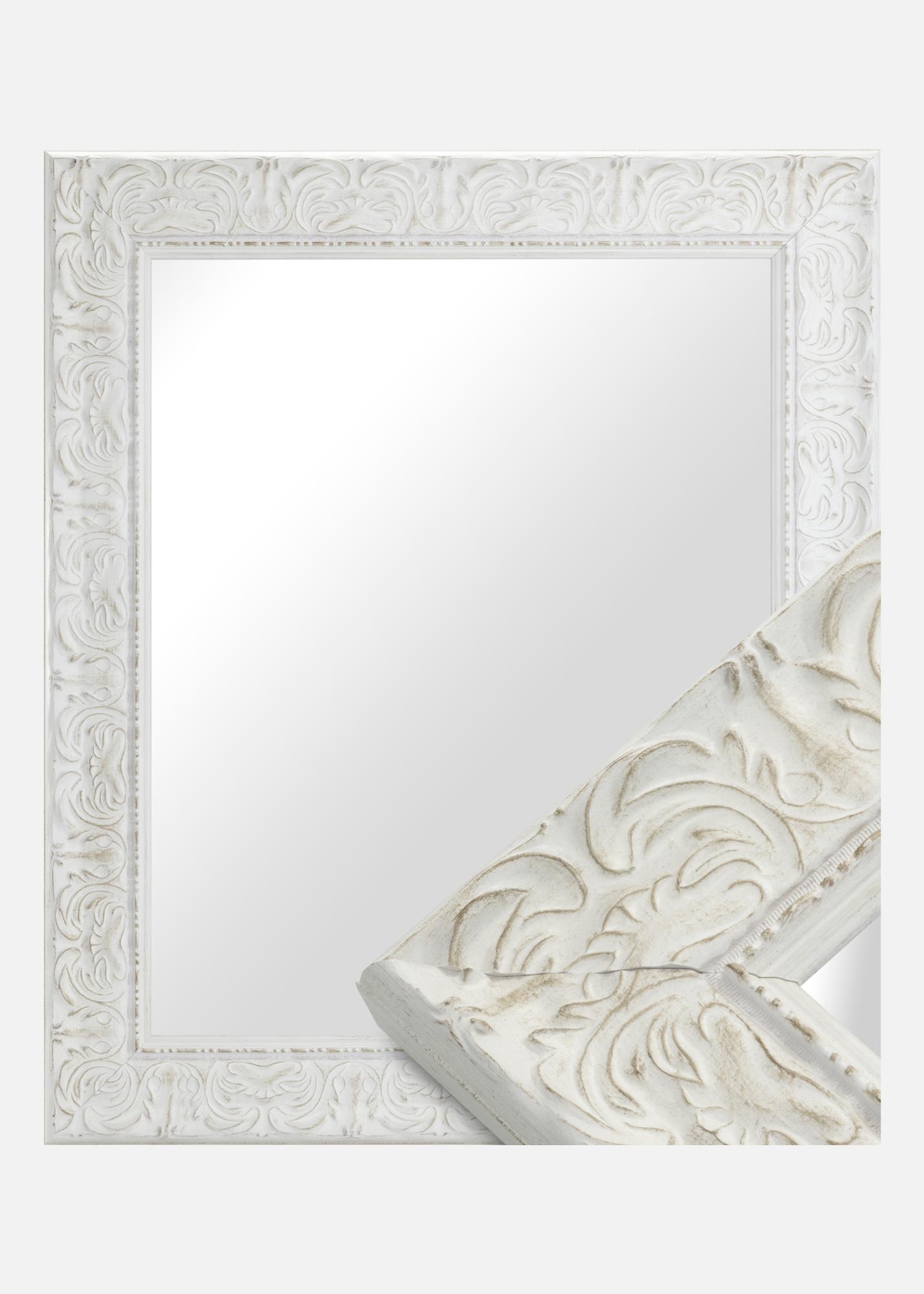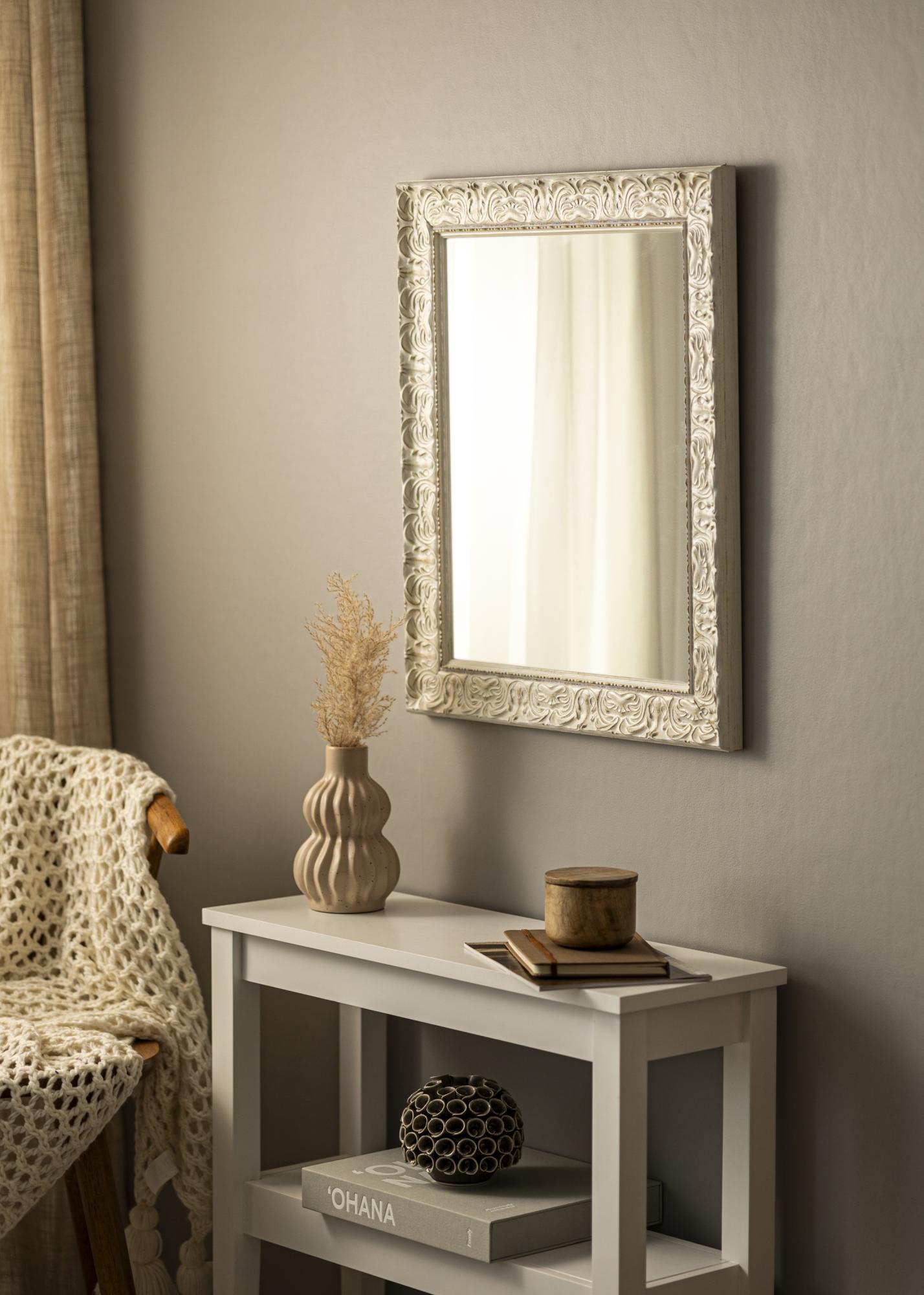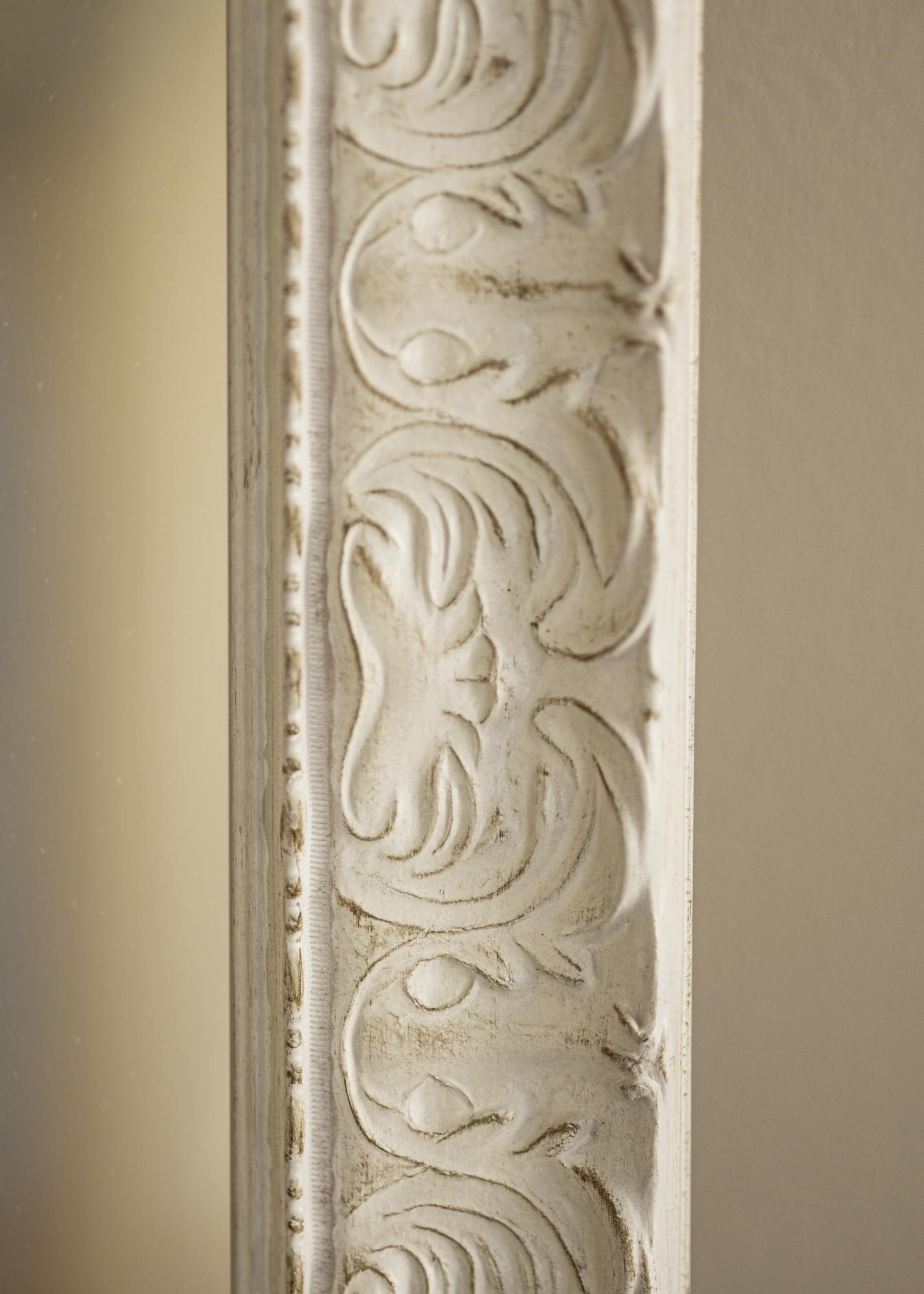 O acabamento branco antigo do espelho com relevo decorativo e superfície sutilmente desgastada confere-lhe um caráter único. Os detalhes ornamentados reforçam sua expressão clássica e fazem dele um ponto focal no ambiente. Quer você tenha uma decoração moderna ou tradicional, este espelho se integrará e ao mesmo tempo adicionará algo especial.