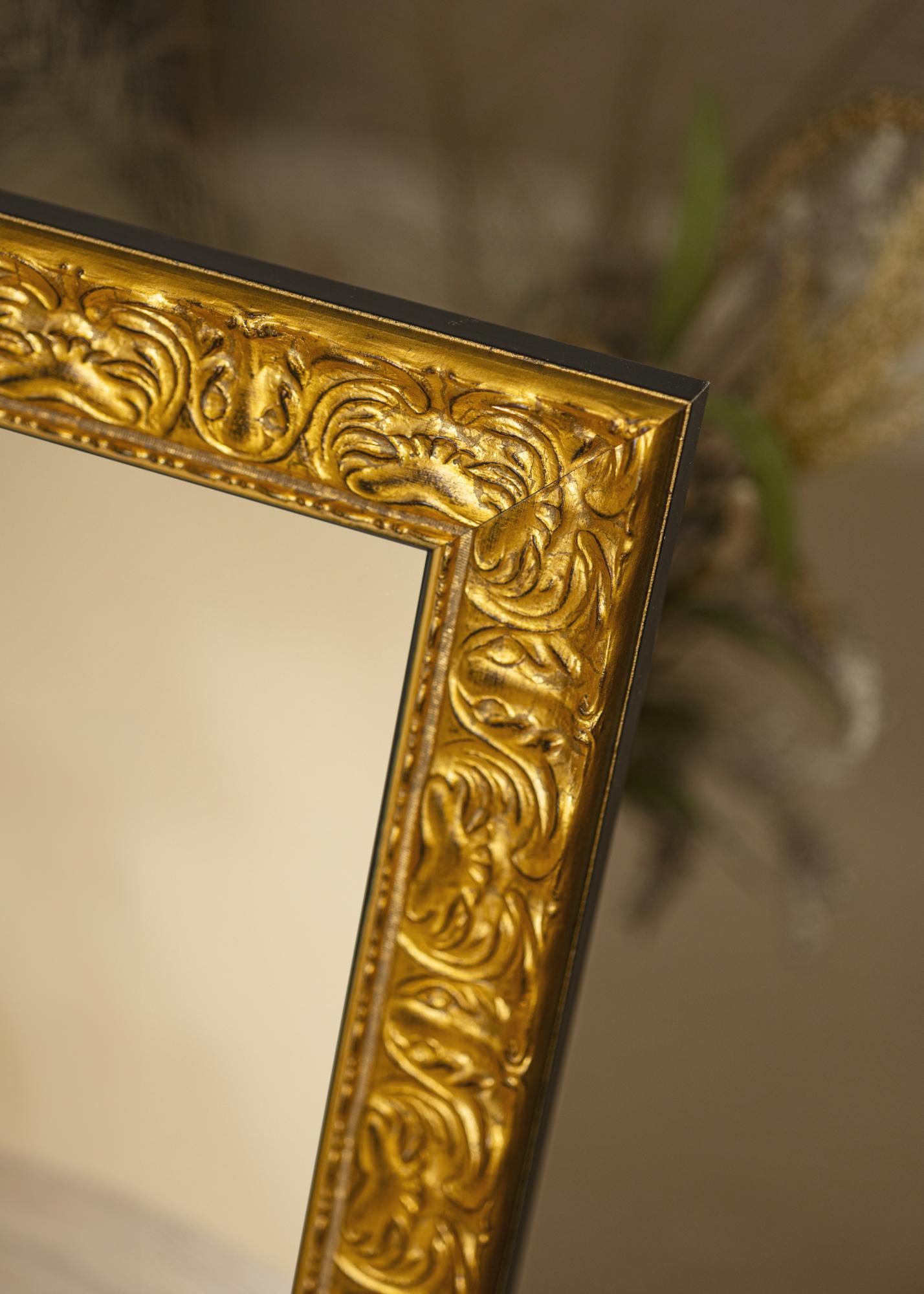 A moldura do Espelho Durham Ouro tem 70 mm de largura e uma profundidade de 35 mm, o que confere ao espelho uma sensação robusta e sólida. Fabricado em pinho, combina durabilidade com estética. A superfície dourada possui um belo acabamento antigo que realça o charme e elegância intemporais do espelho.
