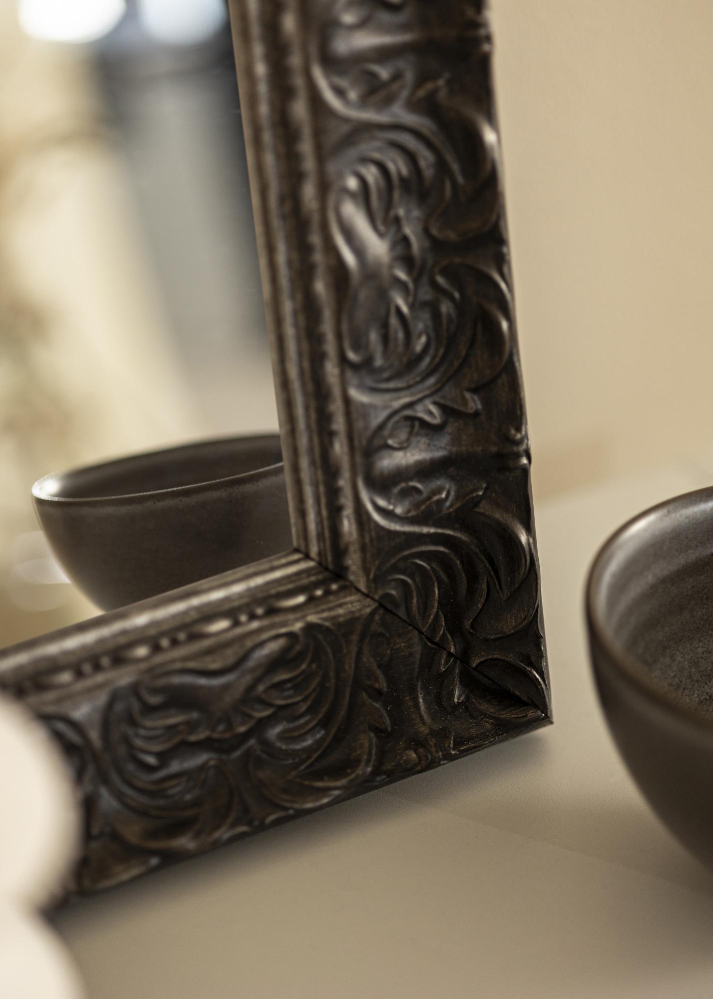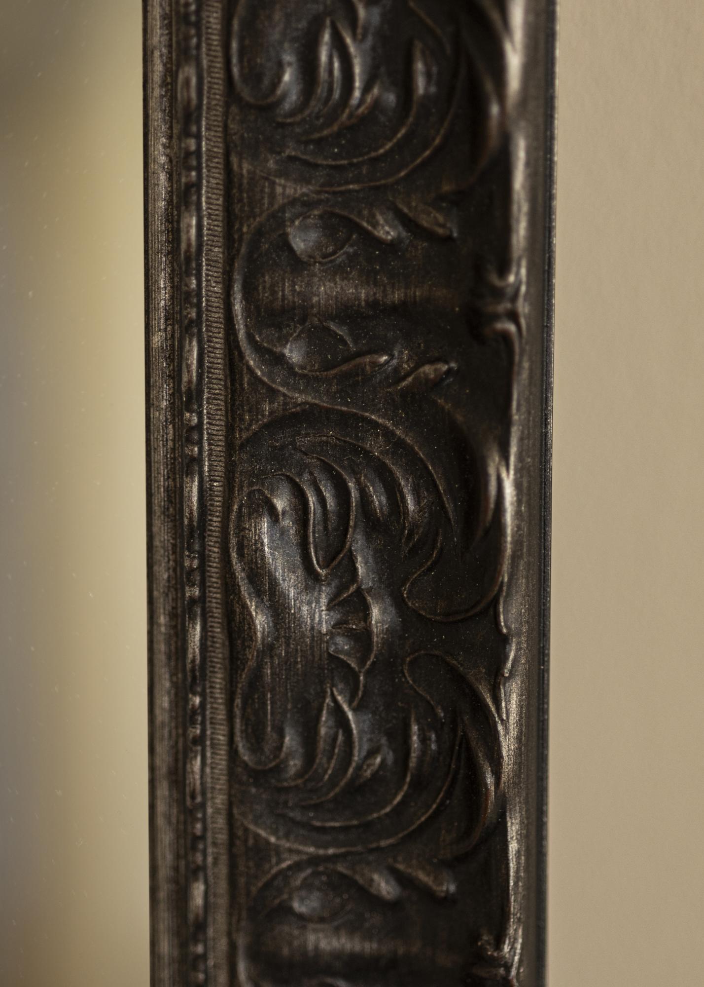 A moldura do Espelho Durham Preto tem 70 mm de largura, o que dá ao espelho uma sensação robusta e sólida. A profundidade de 35 mm contribui para sua estabilidade e garante que ele fique seguro na parede. Fabricado em pinho, este espelho possui um acabamento marrom-escuro envelhecido que lhe confere uma aparência antiga, o que reforça seu caráter clássico e rústico.