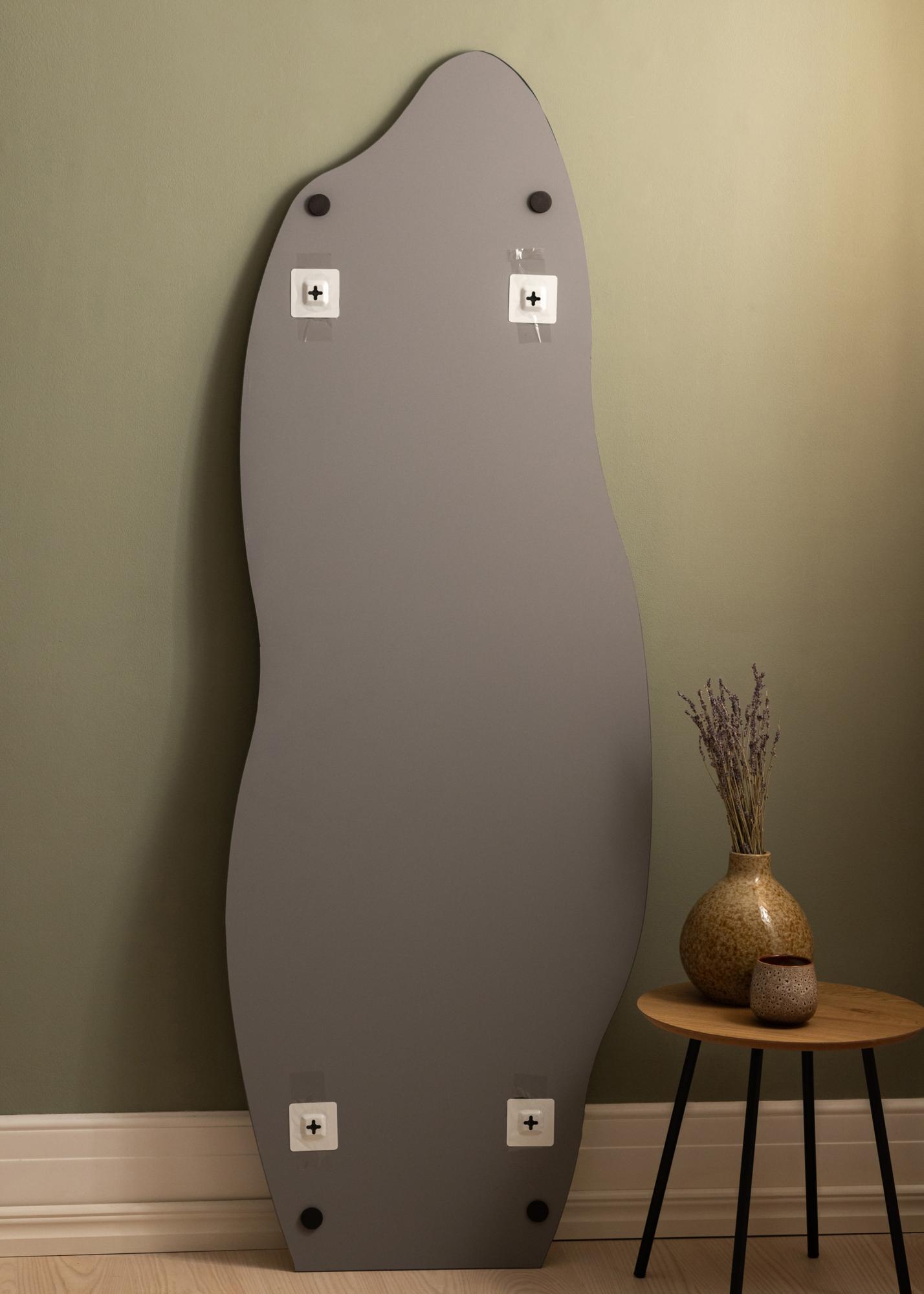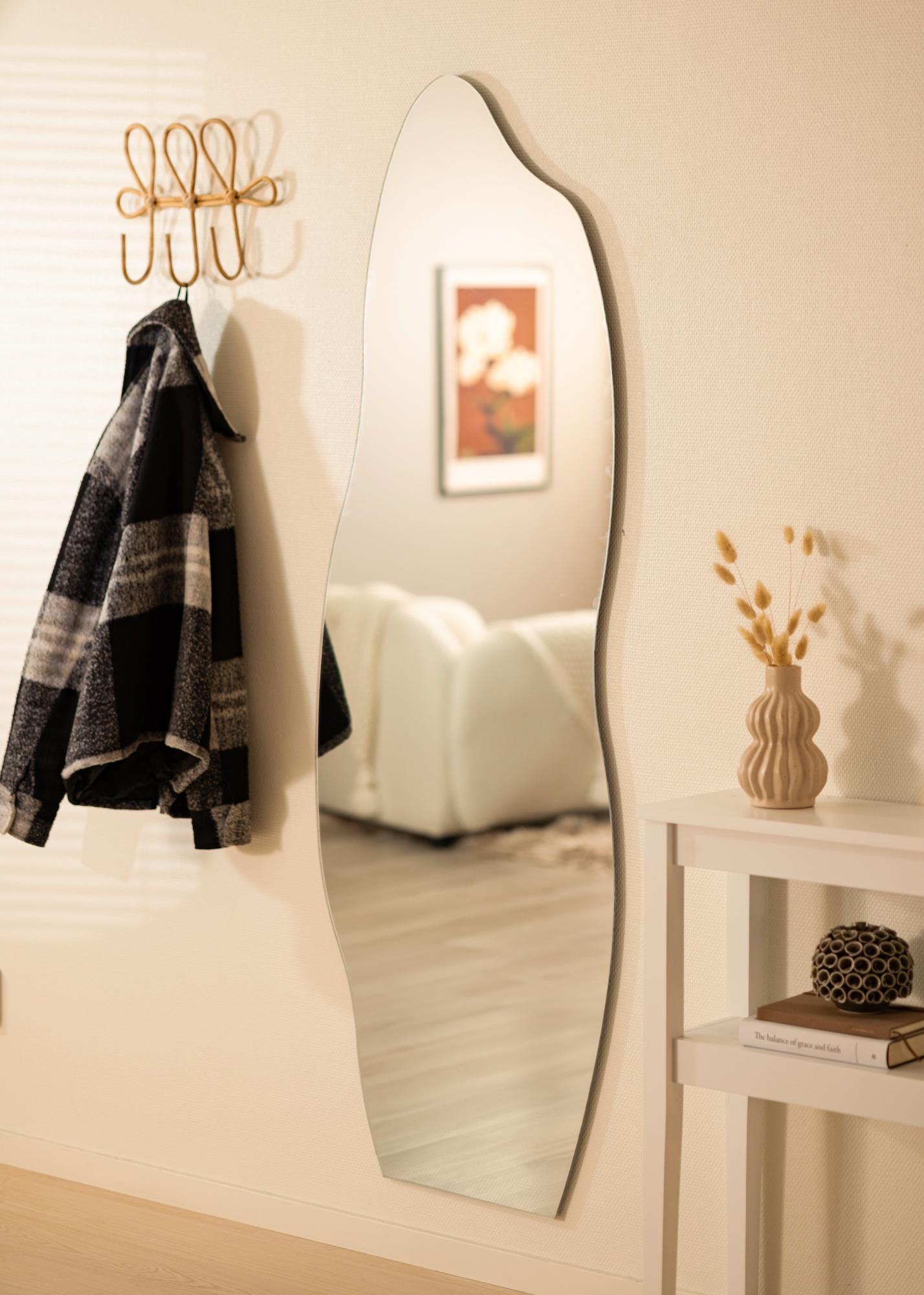 O espelho tem uma forma única em forma de onda, é larga na base e se curva elegantemente para cima. Essa forma incomum o transforma em uma obra de arte por si só e adiciona um toque dinâmico à sua parede. Ele é projetado para ser o ponto focal da sua casa, seja colocado no corredor, quarto ou sala de estar.