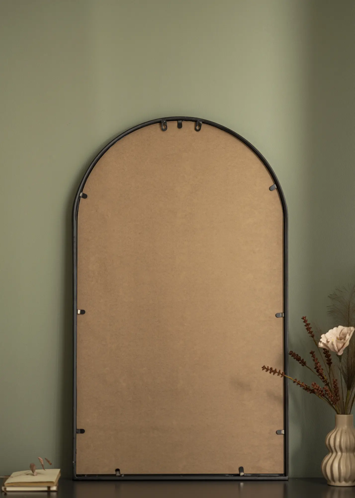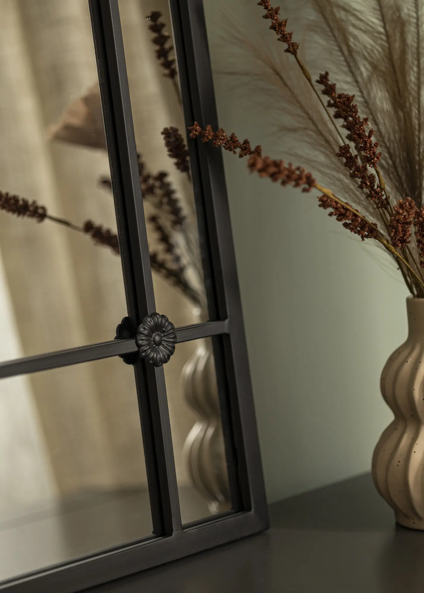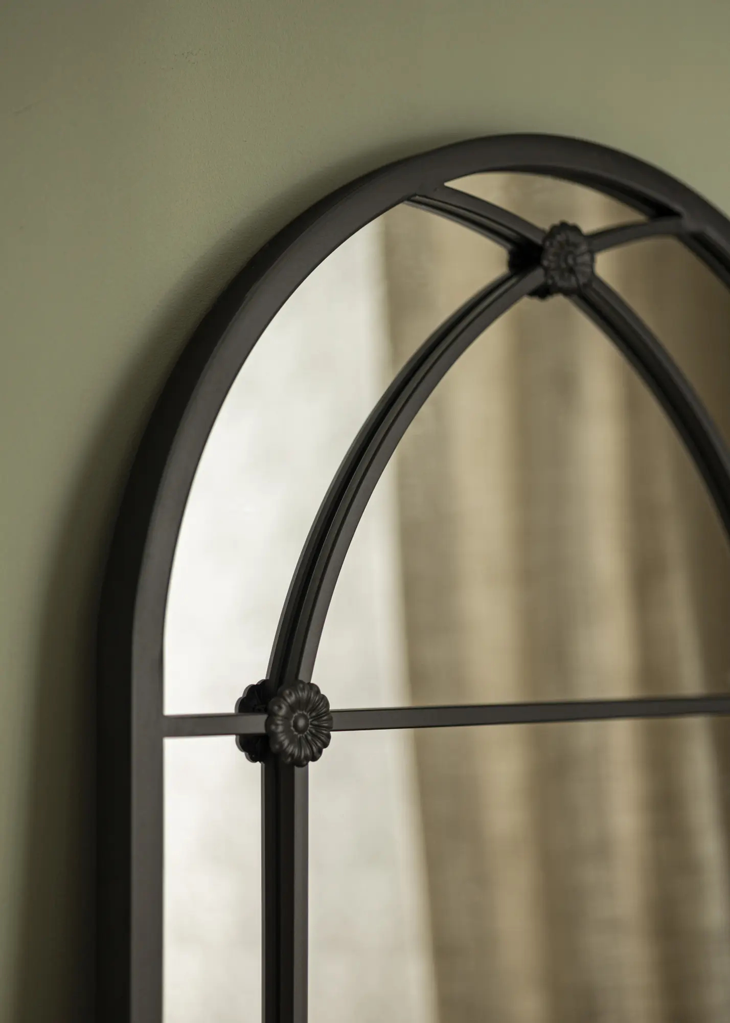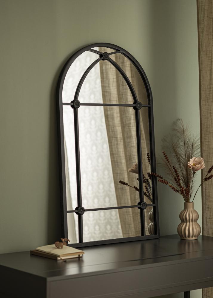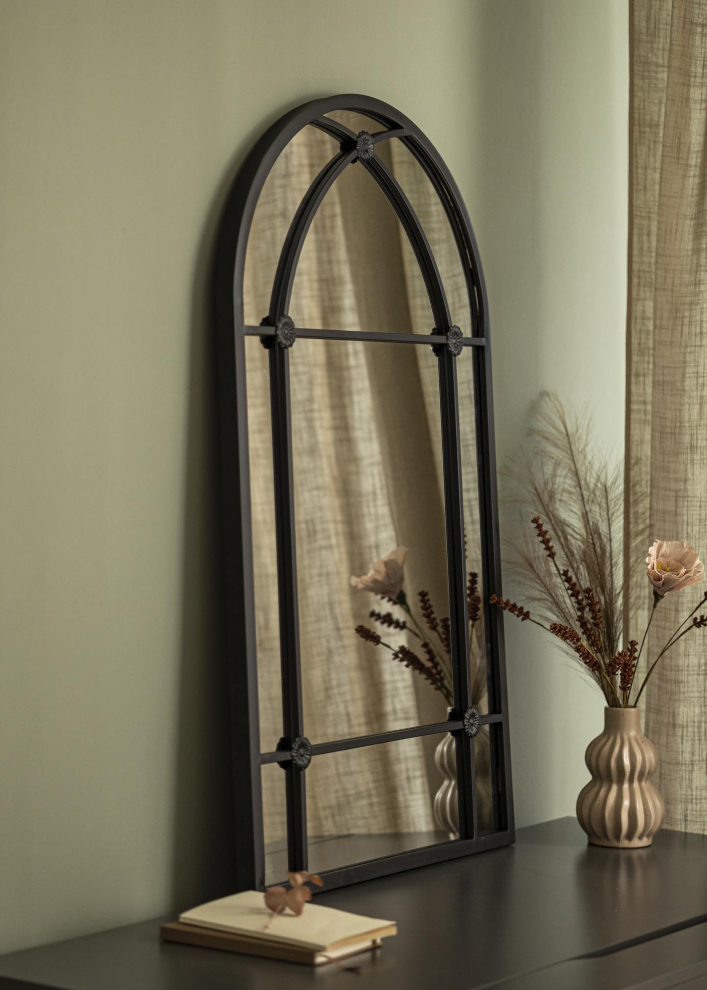 Com sua forma arqueada e detalhes em ferro, o espelho lembra janelas clássicas que trazem uma sensação de profundidade e espaço ao ambiente. Não é apenas um objeto prático para uso diário, mas também um detalhe decorativo artístico que chama a atenção e contribui para a atmosfera do espaço.