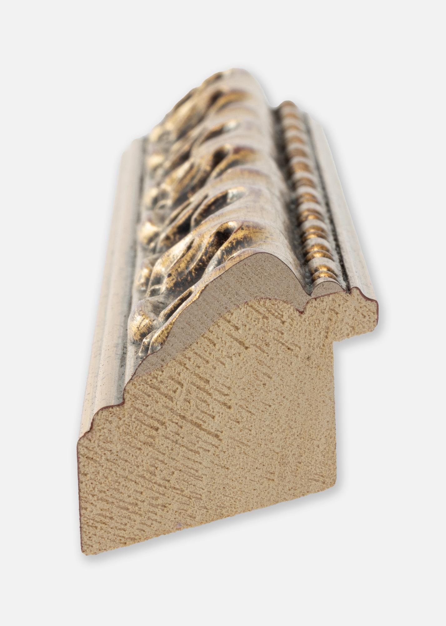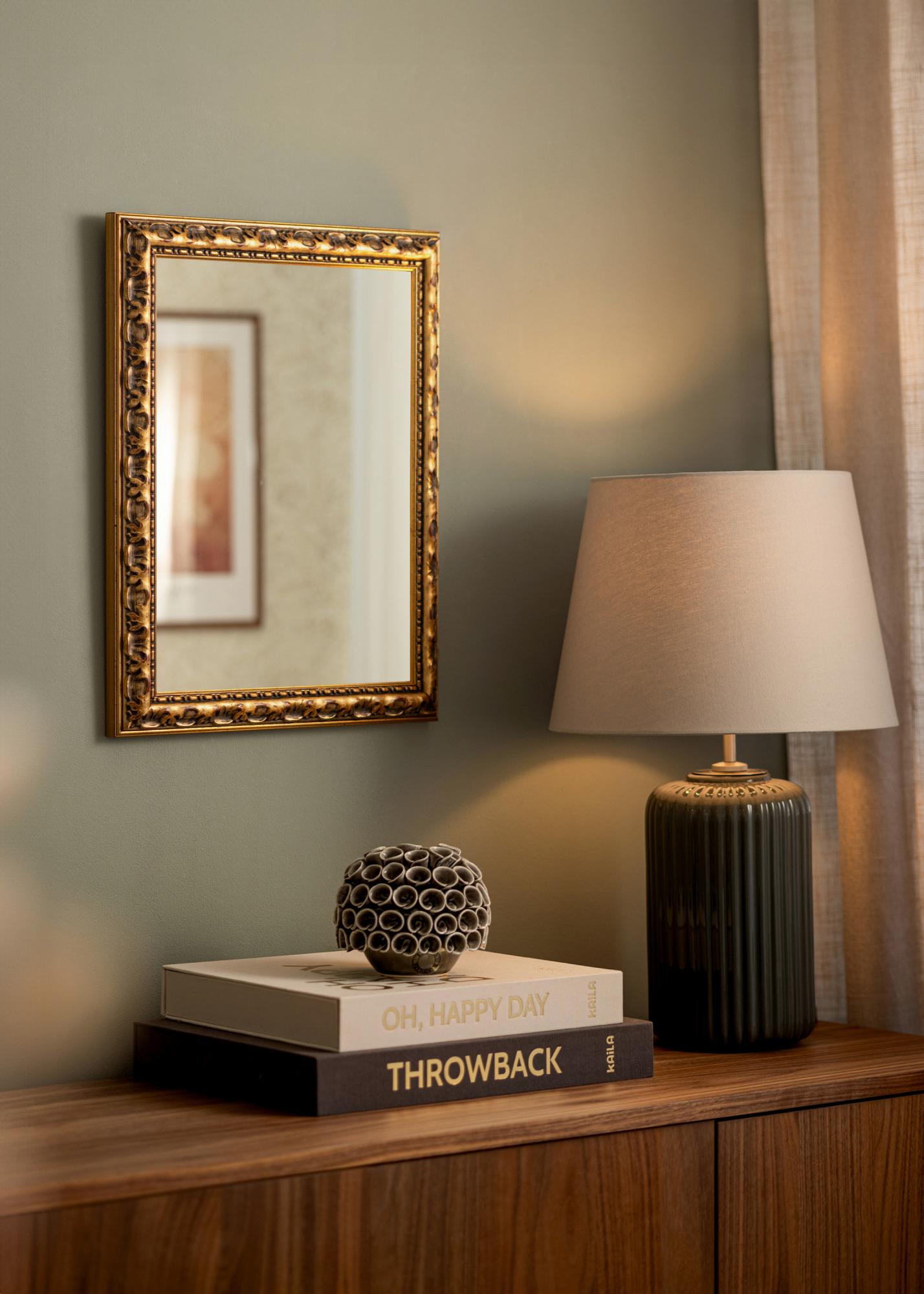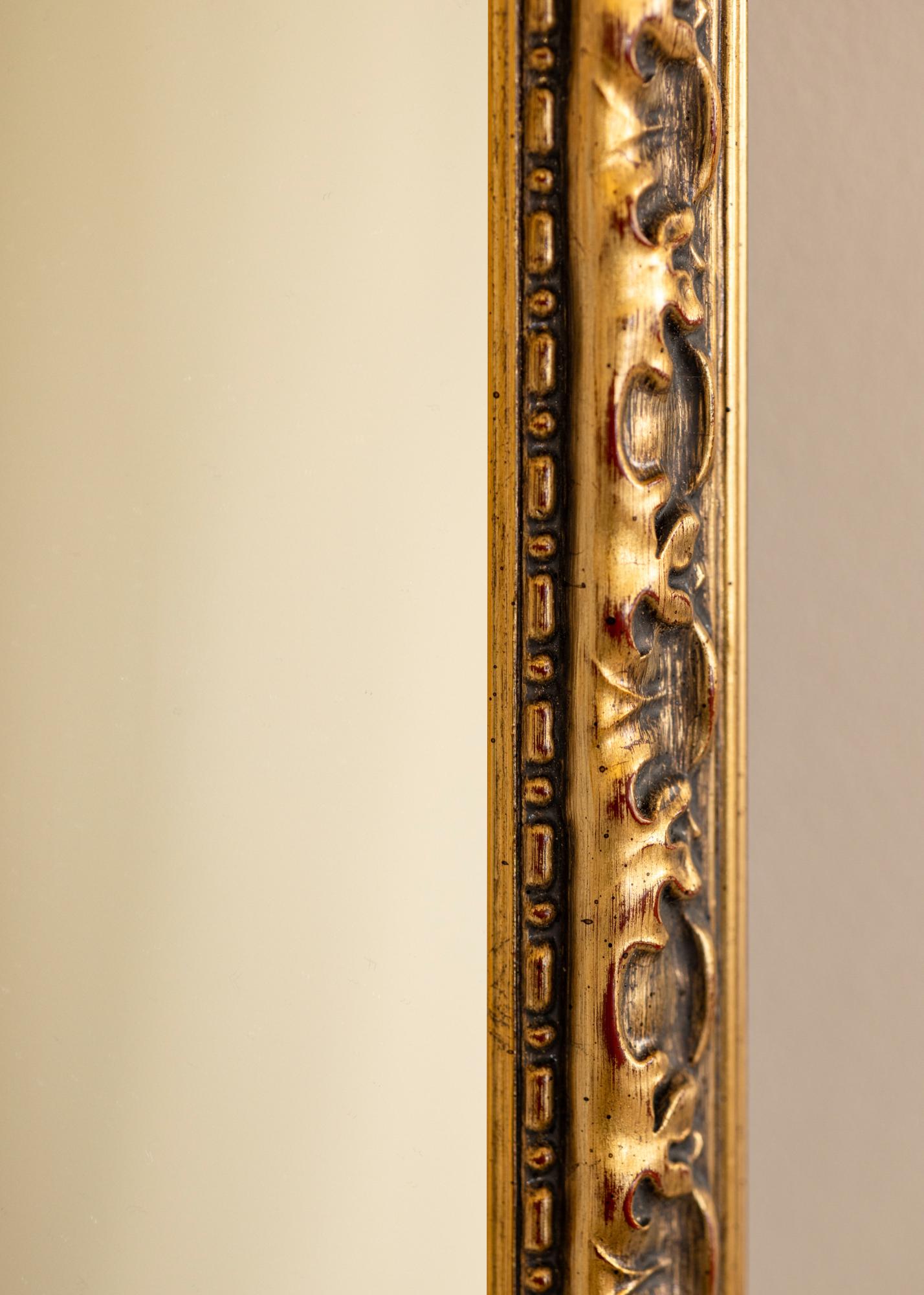 A moldura do Espelho Freyja Ouro tem 38 mm de largura e uma profundidade de 34 mm, o que confere ao espelho uma sensação robusta e sólida. Fabricado em pinho, combina durabilidade com uma estética clássica. O acabamento antigo com detalhes patinados escuros e sutis traços vermelhos reforça o caráter rústico do espelho e lhe confere um charme atemporal.