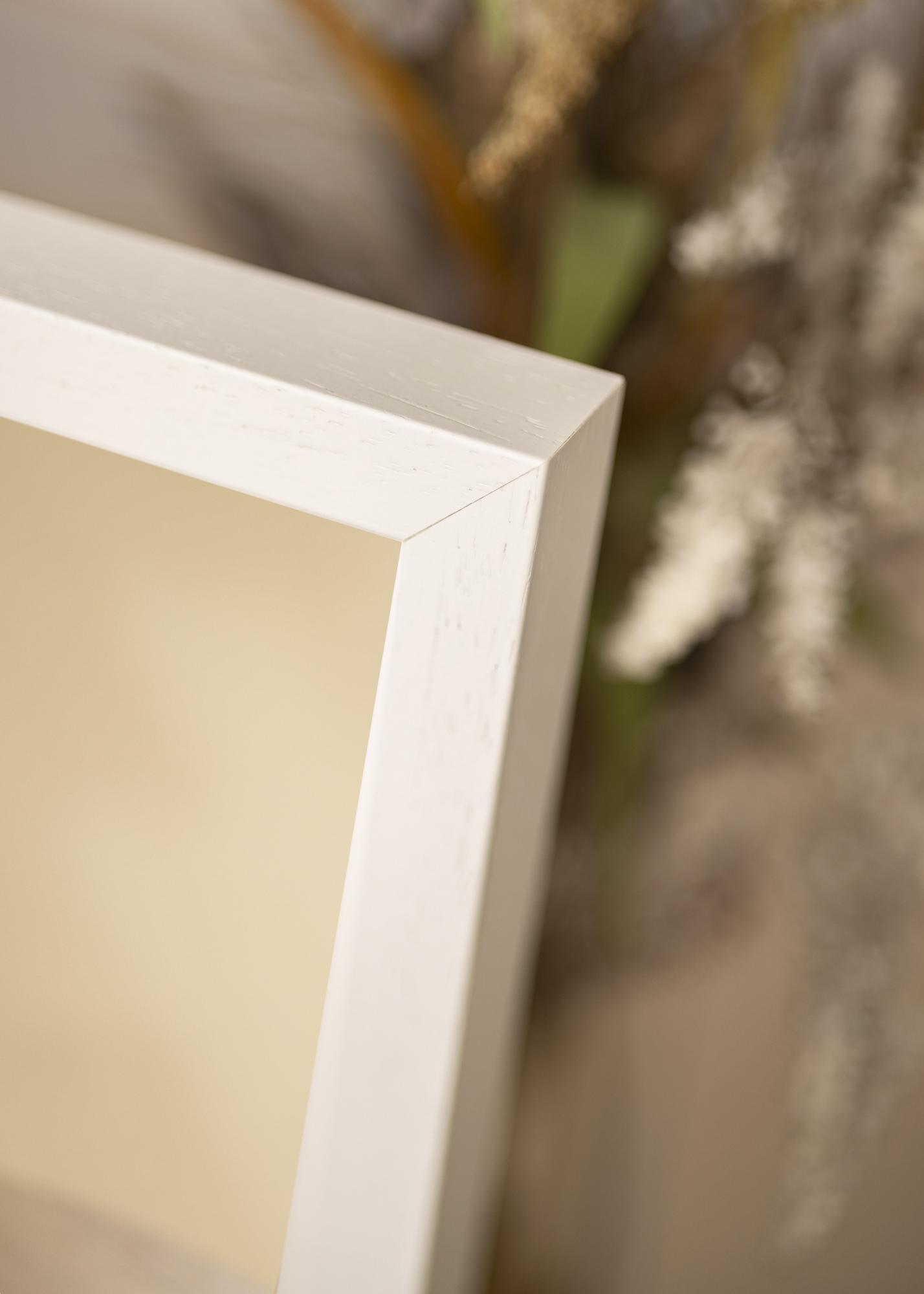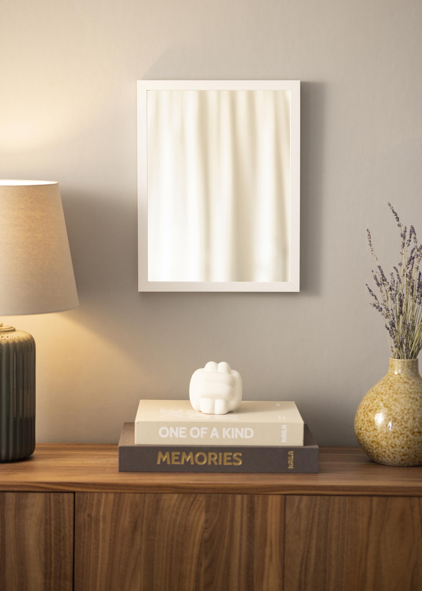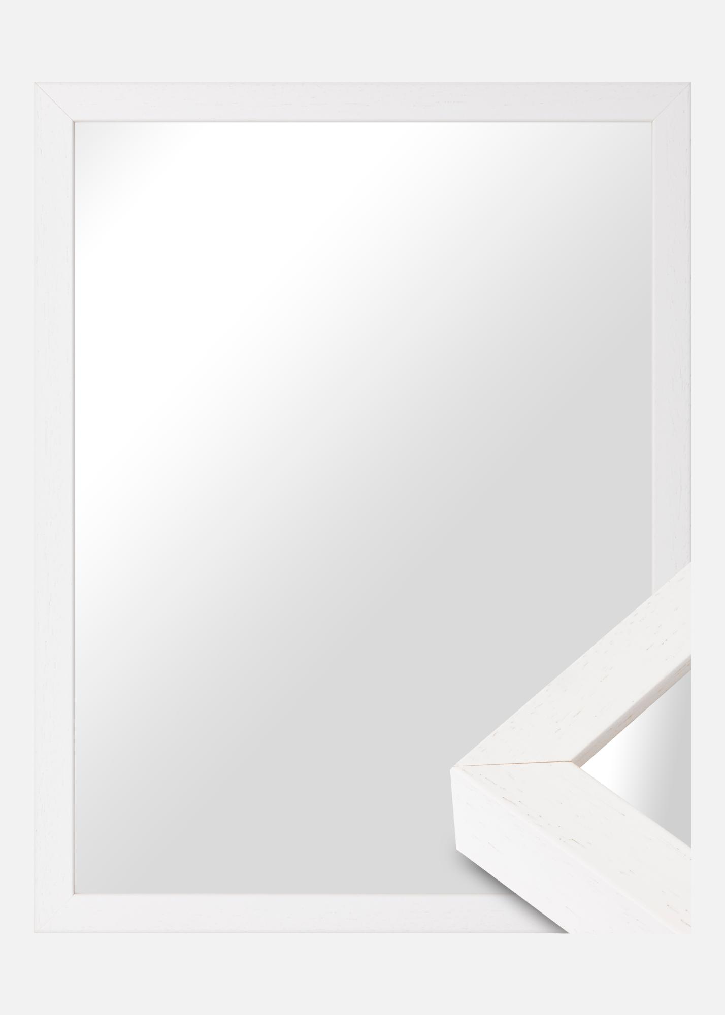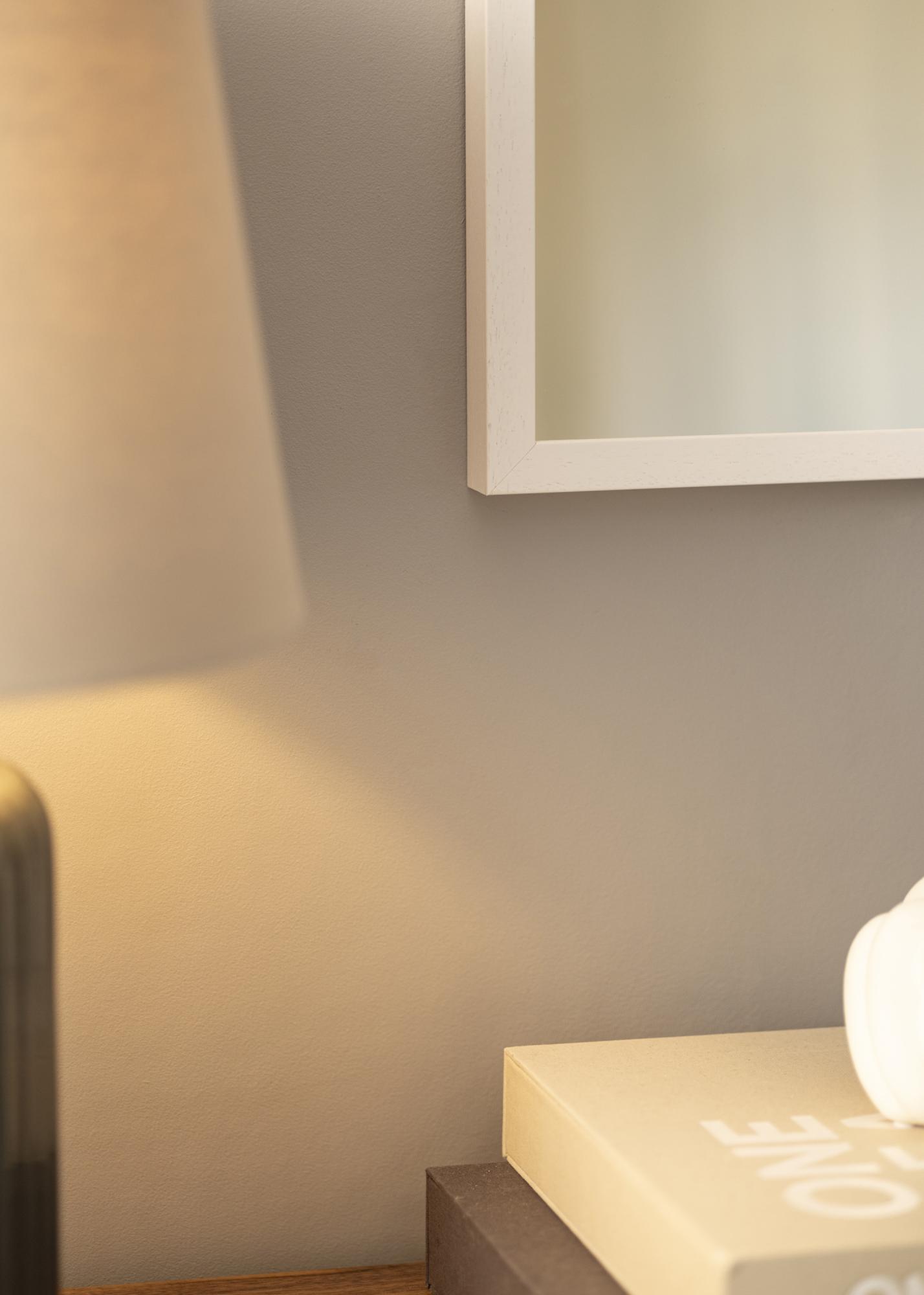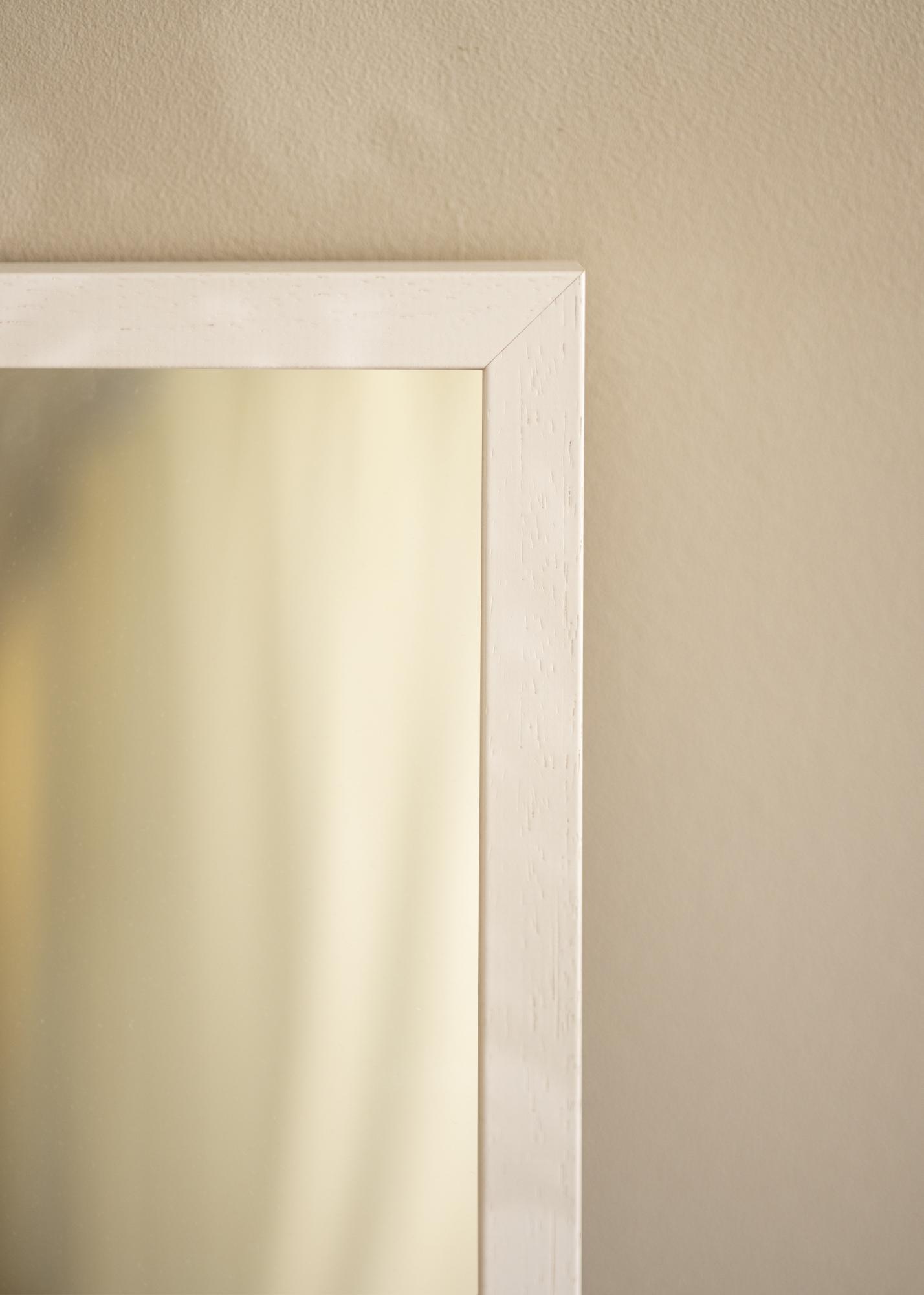 Gävle Vit numa moldura de madeira sólida com uma profundidade de 31 mm, o que faz com que o espelho se projete um pouco da parede.