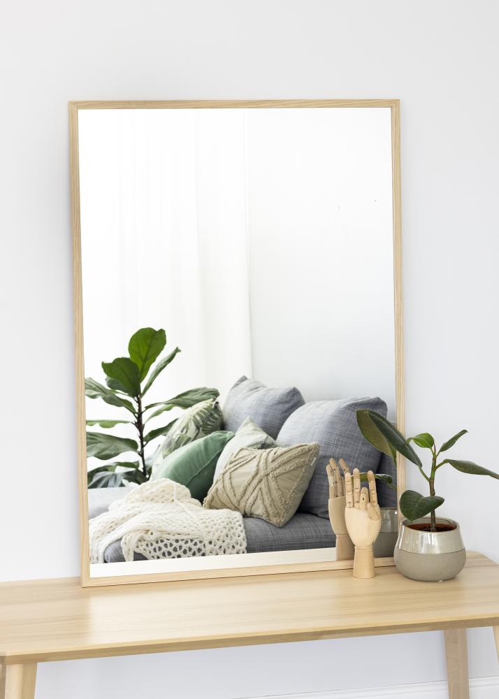Deixe este espelho com uma moldura de madeira de carvalho de alta qualidade adornar sua casa! A moldura é feita de uma lista de pinho com folheado de carvalho genuíno por cima. A superfície é sem tratamento, o que significa que pode escolher pintar ou envernizar a moldura como desejar, ou pode deixar a estrutura rústica e elegante do carvalho ser. As possibilidades de variação fazem com que este espelho se adapte a qualquer casa e se torne um detalhe atemporal. Este espelho de parede mede 70x100 cm e possui vidro de espelho incolor. A faixa da moldura tem 17 mm de largura e 22,5 mm de profundidade. O espelho possui suportes de parede.