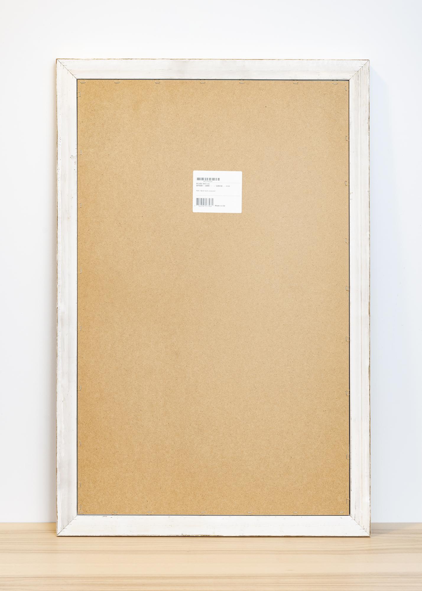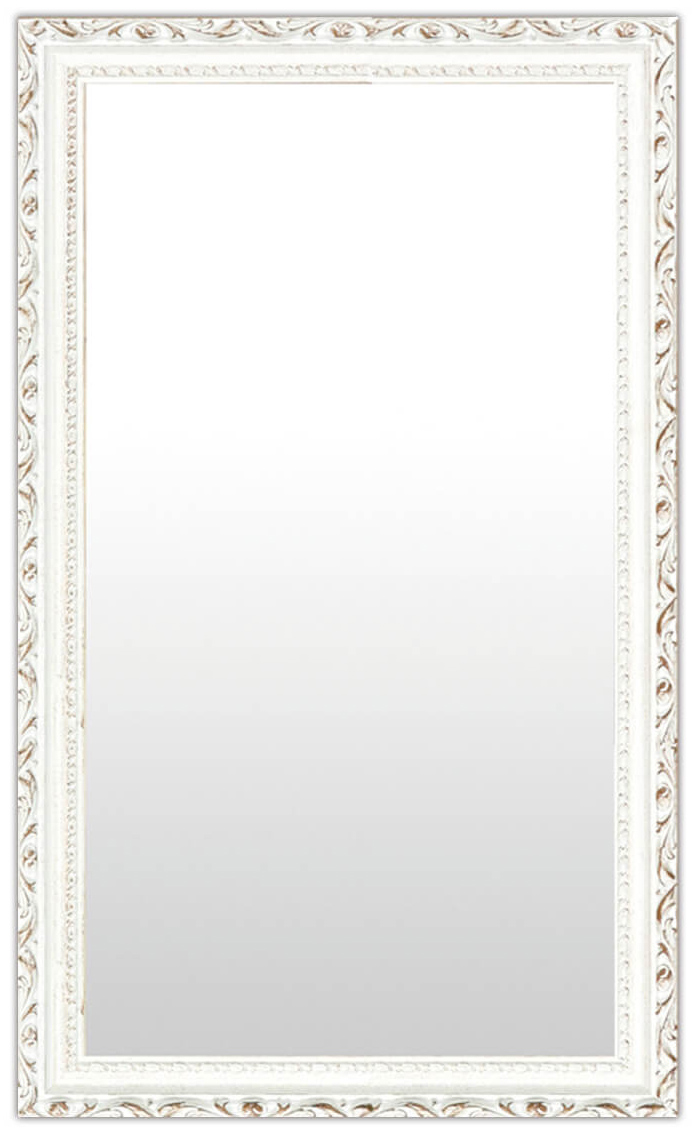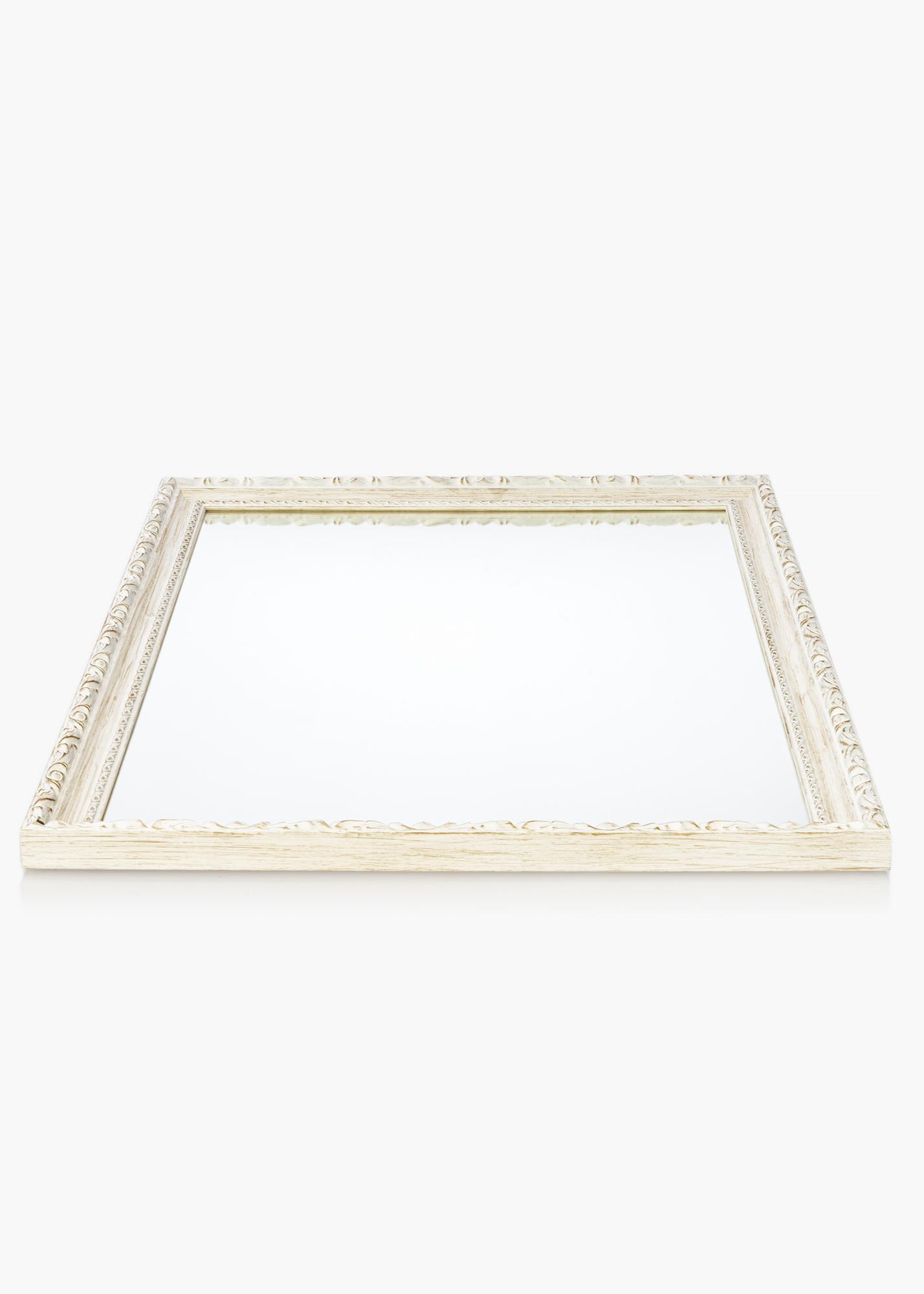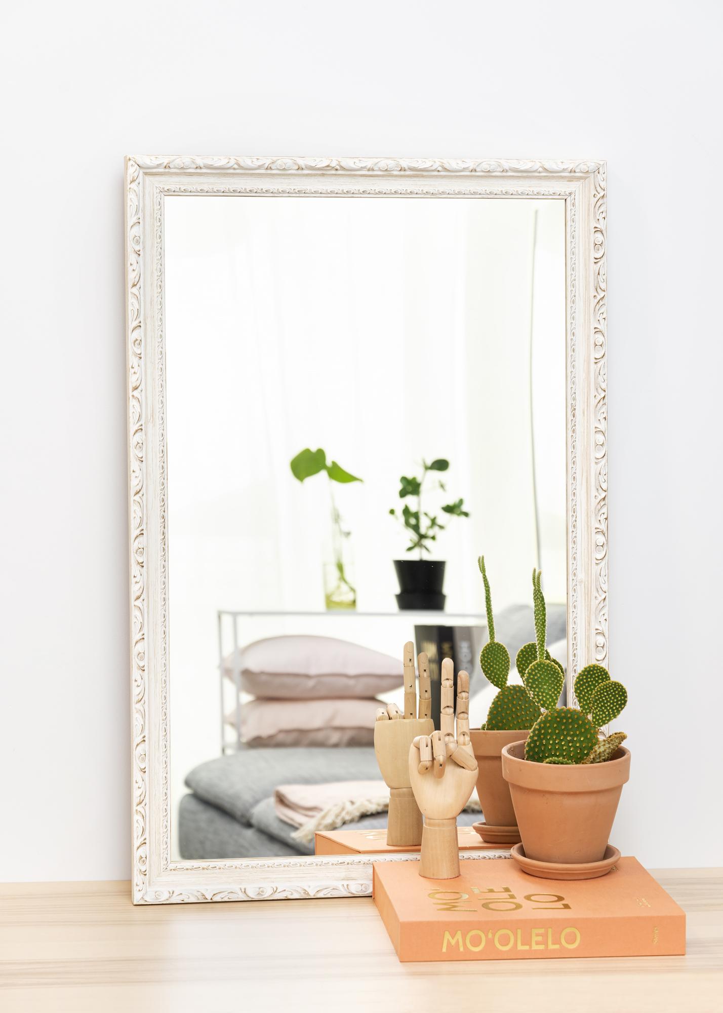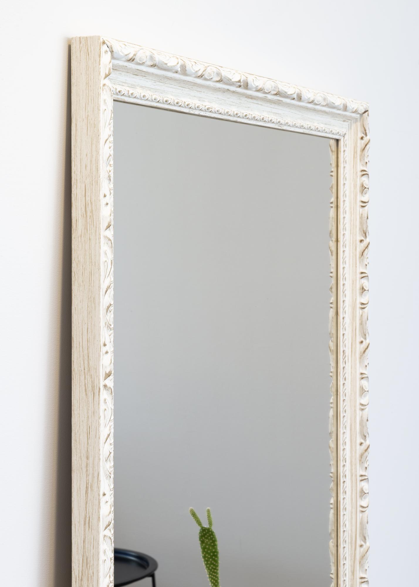 Espelho branco em estilo antigo com veios de madeira visíveis e uma largura de 40 mm. Uma excelente escolha quando procura um espelho que se destaca e ocupa espaço.