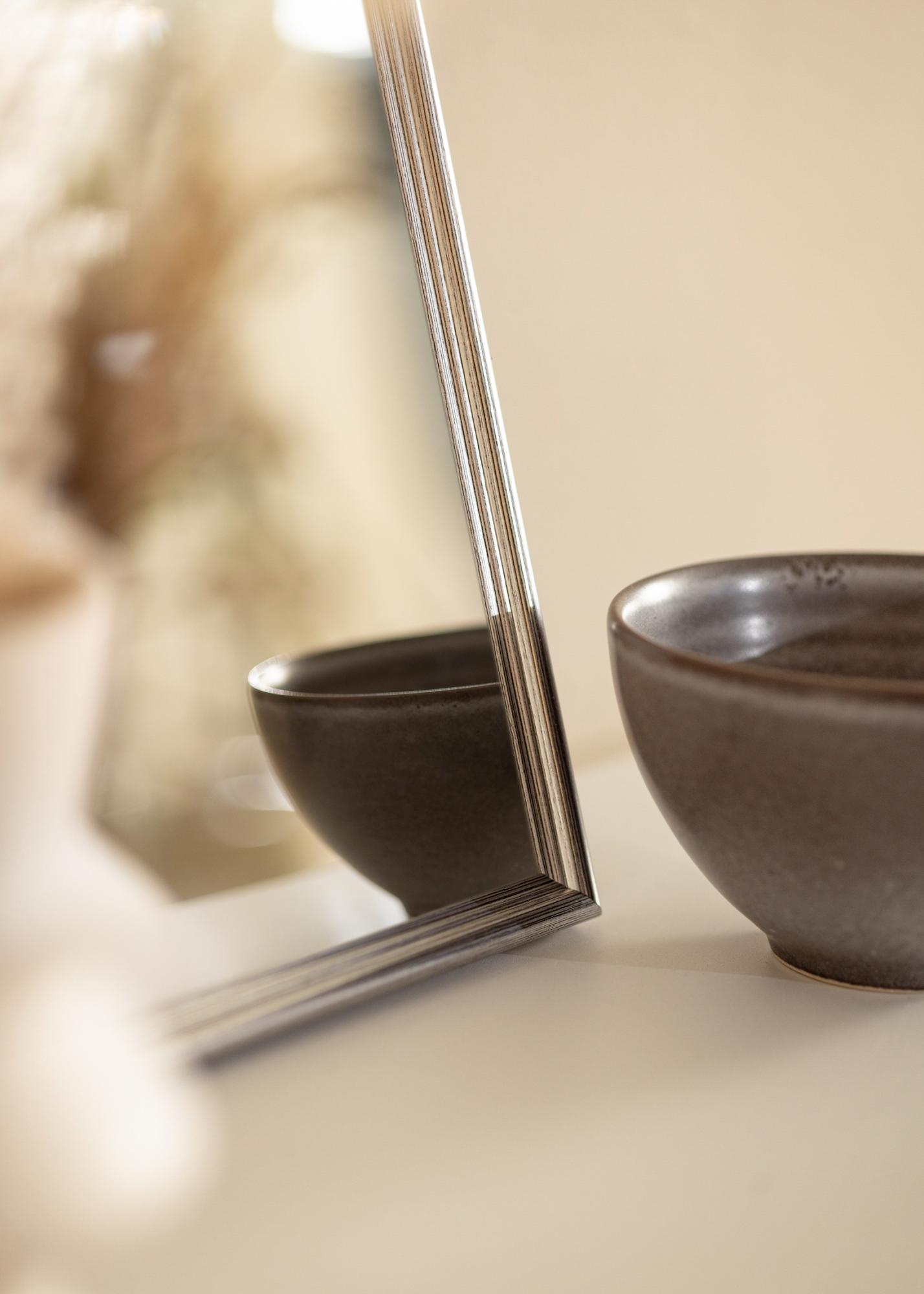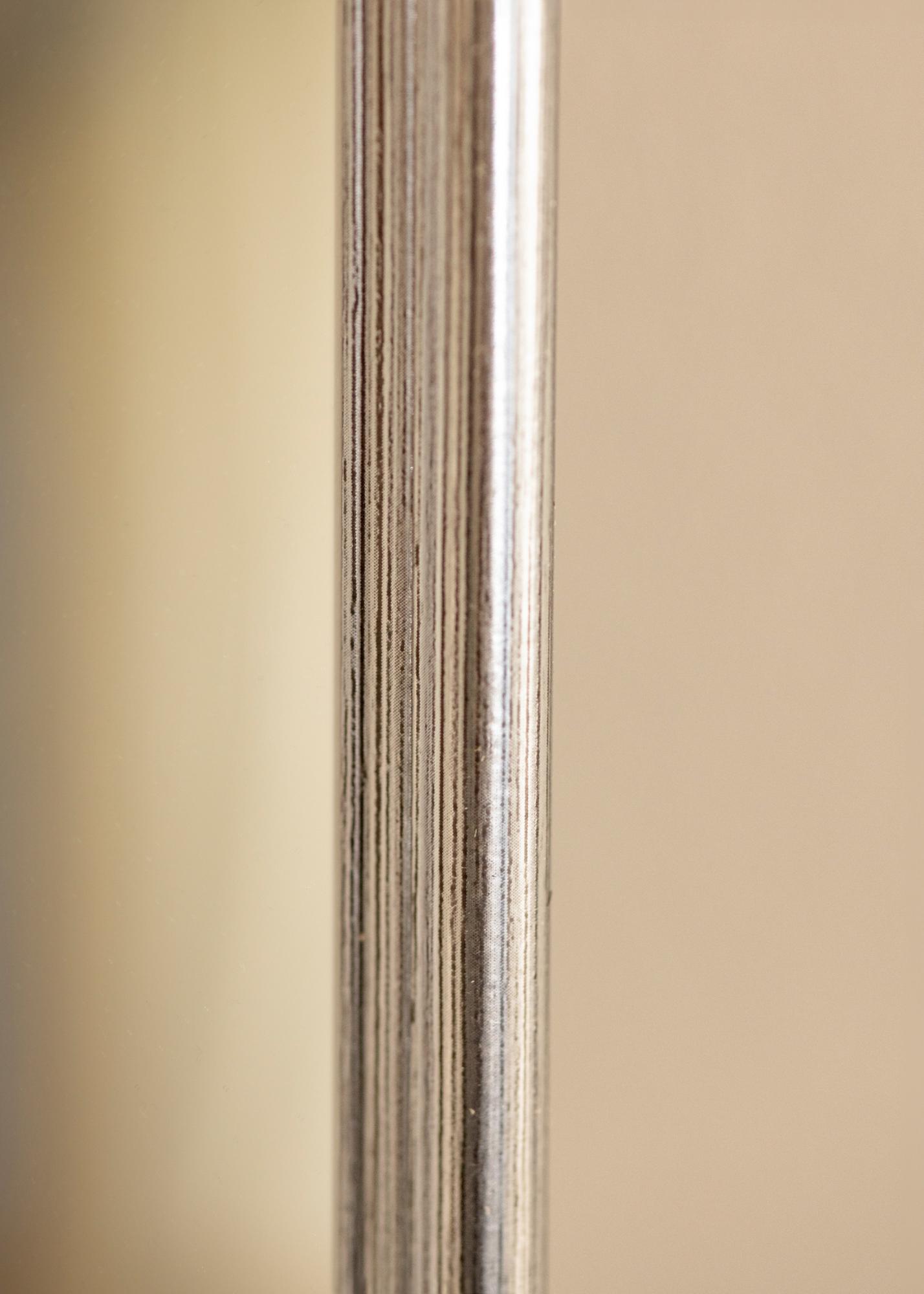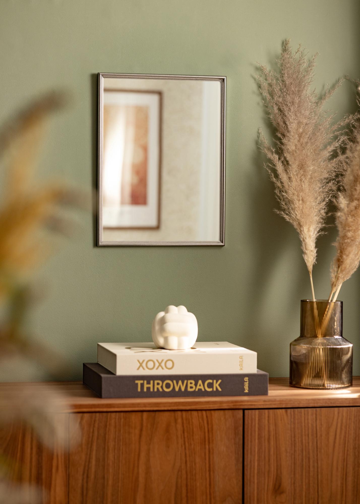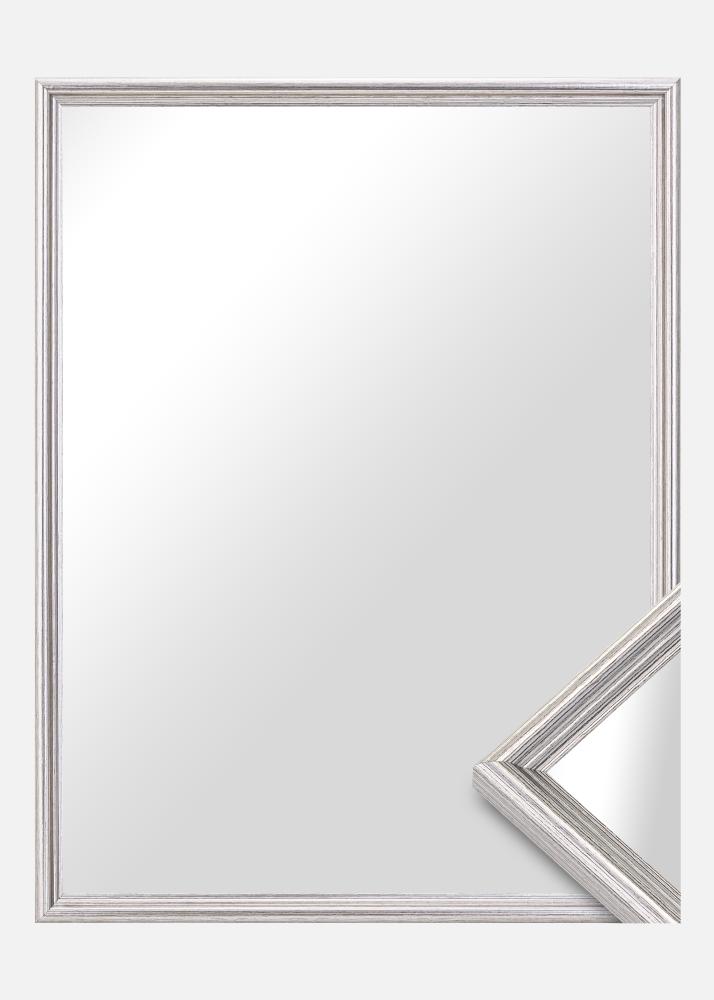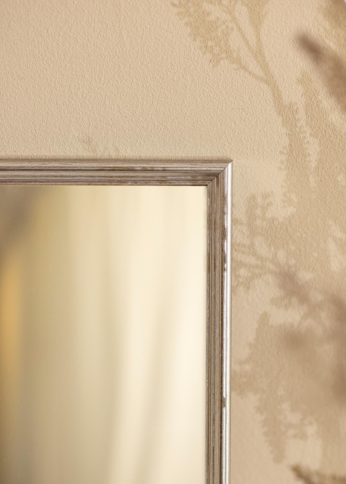 Vamos fabricar um espelho que se encaixe perfeitamente na sua casa! Este espelho elegante é feito de acordo com as suas próprias medidas para garantir que seja o correto. O espelho possui uma moldura clássica perfilada pintada com uma cor prateada brilhante. Combina bem com componentes de decoração em preto, branco e roxo, por exemplo.