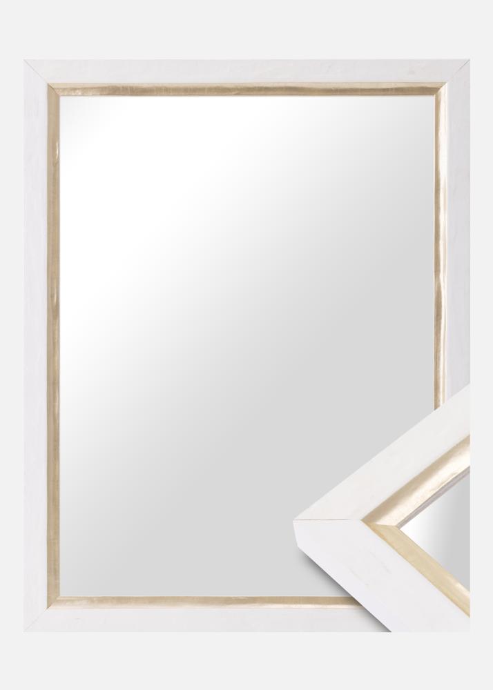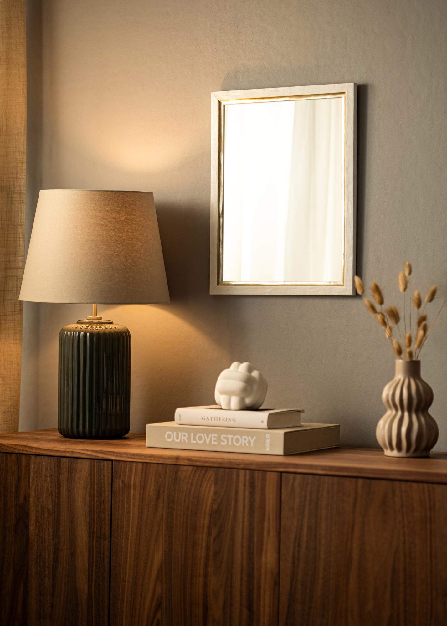 "Leonie" é um espelho amplo fabricado na Itália, o que garante alta qualidade e design elegante. O espelho possui um perfil elegante em branco, com uma superfície claramente estruturada e uma borda prateada larga próxima ao vidro do espelho.