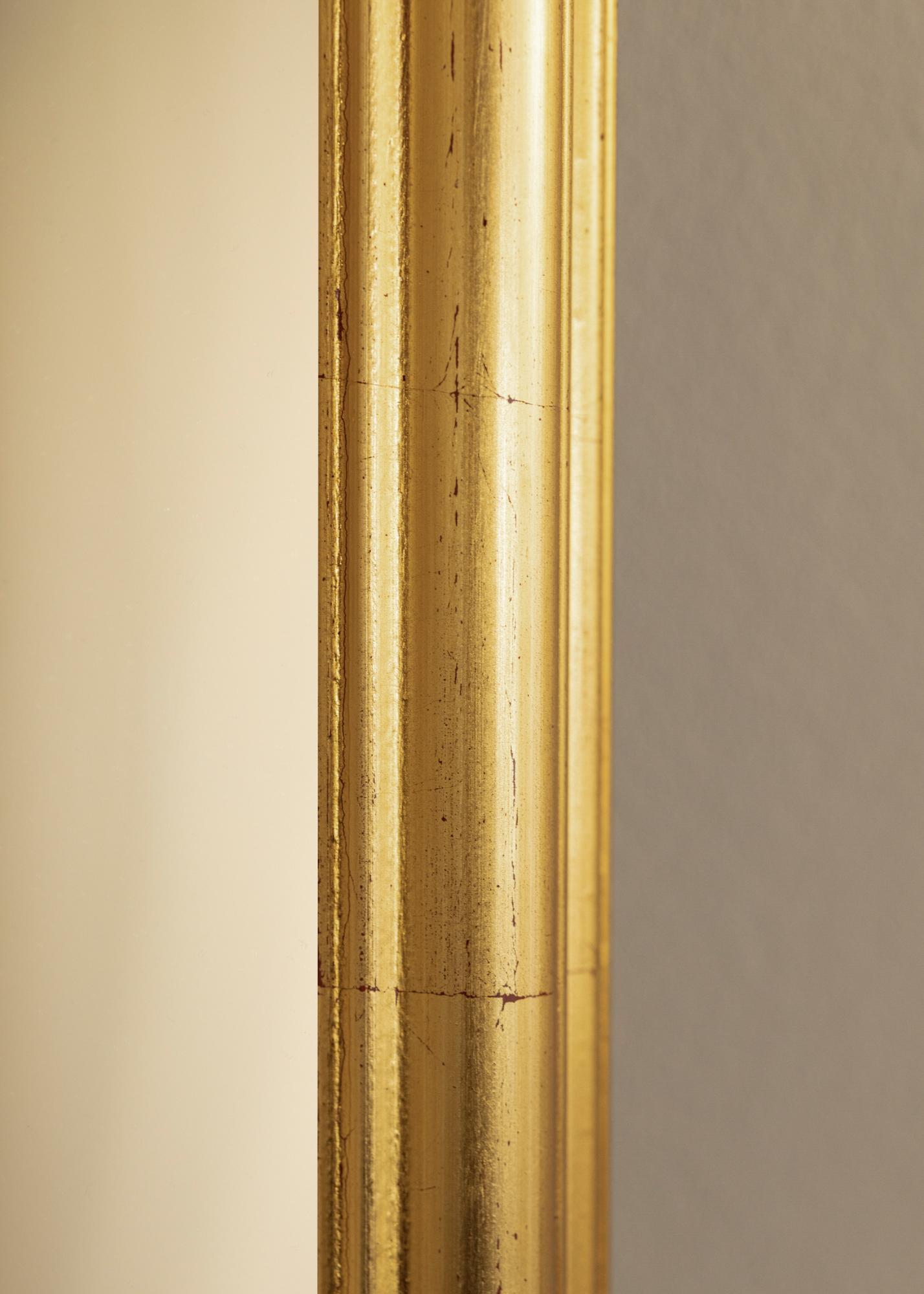 A moldura é feita de madeira de ayos e possui um perfil suavemente curvado que contribui para a aparência sofisticada do espelho. A superfície é patinada com sutis rachaduras e pequenos detalhes escuros, conferindo ao espelho uma autêntica sensação vintage. O acabamento dourado cria uma atmosfera quente e clássica, perfeita para adicionar um toque de elegância atemporal à sua casa.