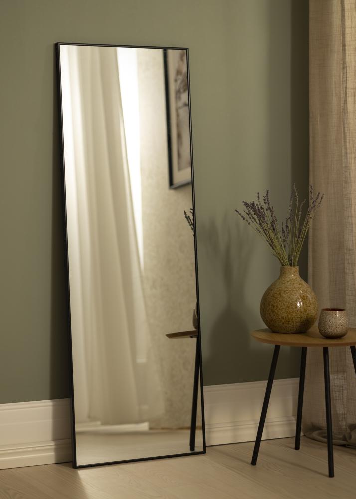 Este espelho é projetado para ser pendurado verticalmente, tornando-o uma excelente opção para quartos, corredores ou closets onde a otimização do espaço vertical é essencial. A moldura de alumínio preto abraça o vidro do espelho com uma borda sutil, mas proeminente, que complementa uma variedade de estilos de decoração, desde o minimalismo moderno até o chic clássico.