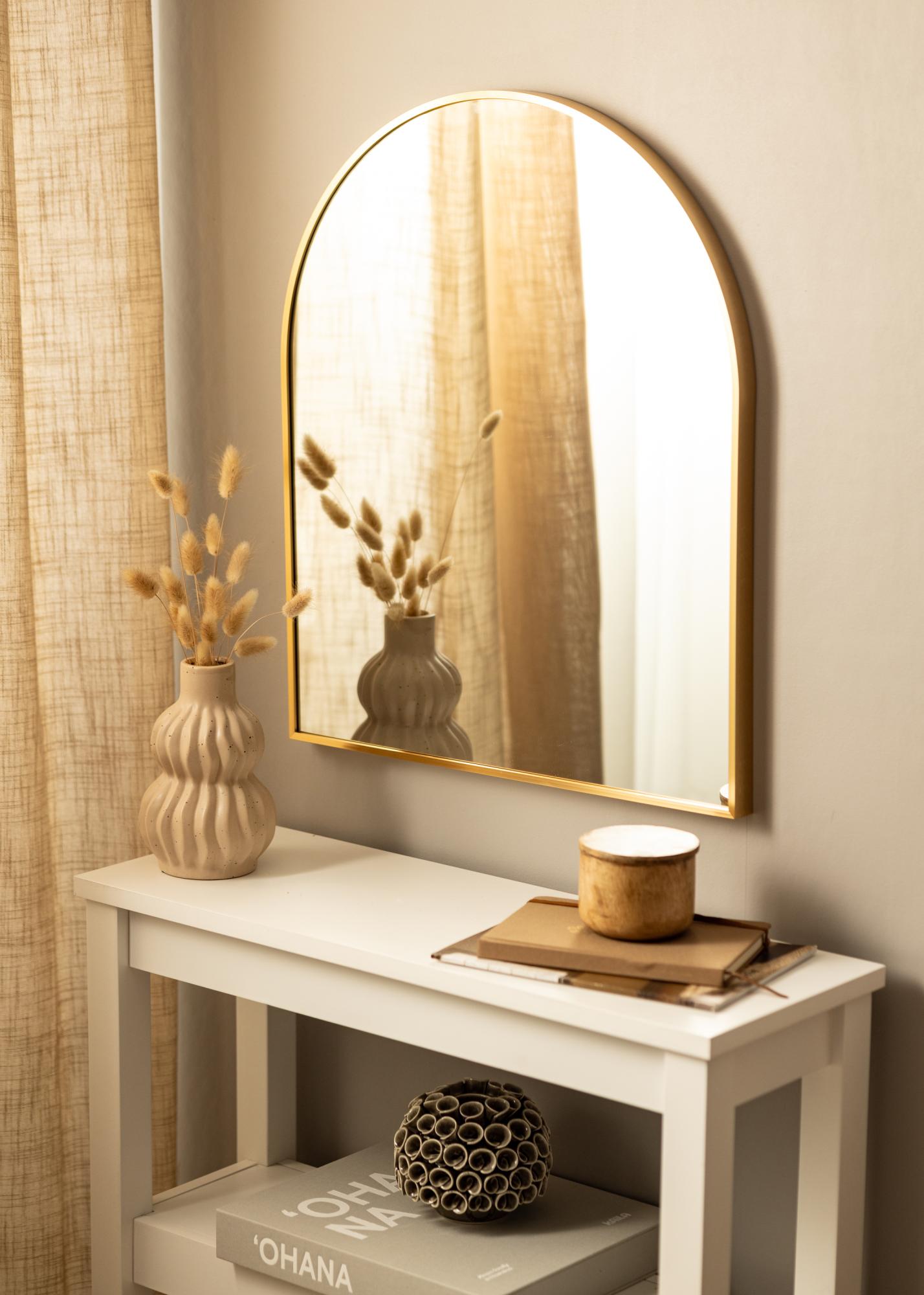 Este é um espelho de parede moderno que pode ser usado em qualquer divisão. Pode deixá-lo como um detalhe elegante no quarto ou na sala de estar, ou usá-lo como espelho de casa de banho ou espelho de entrada para poder se refletir adequadamente ao se preparar para o dia. O espelho numa moldura de metal com 28 mm de profundidade, com um tom dourado exclusivo que confere-lhe um acabamento excecional. A forma elegante inspirada em arcos reforça ainda mais a expressão luxuosa.