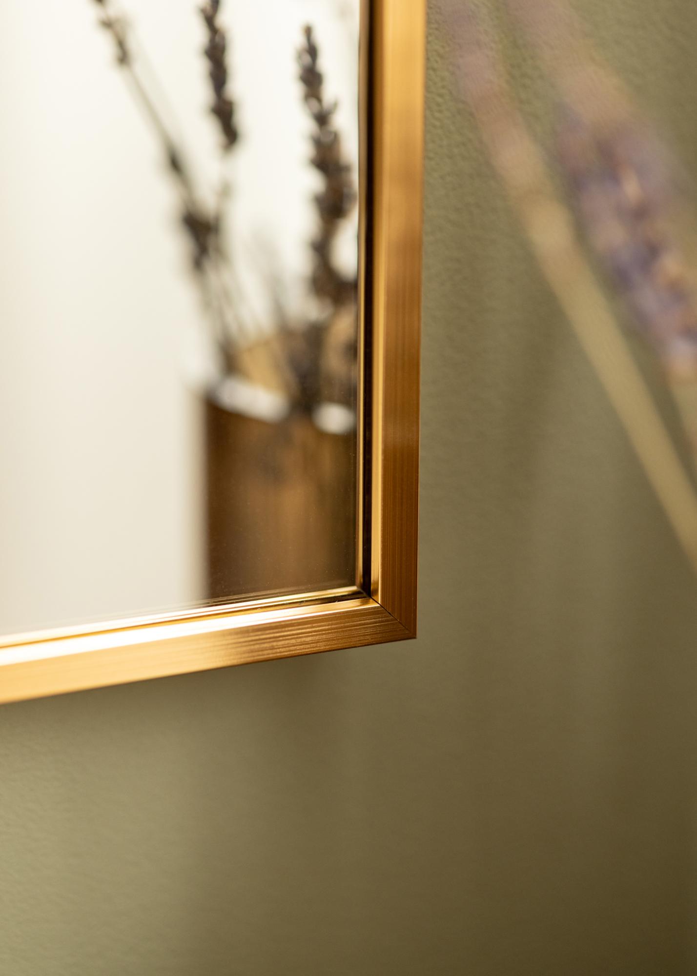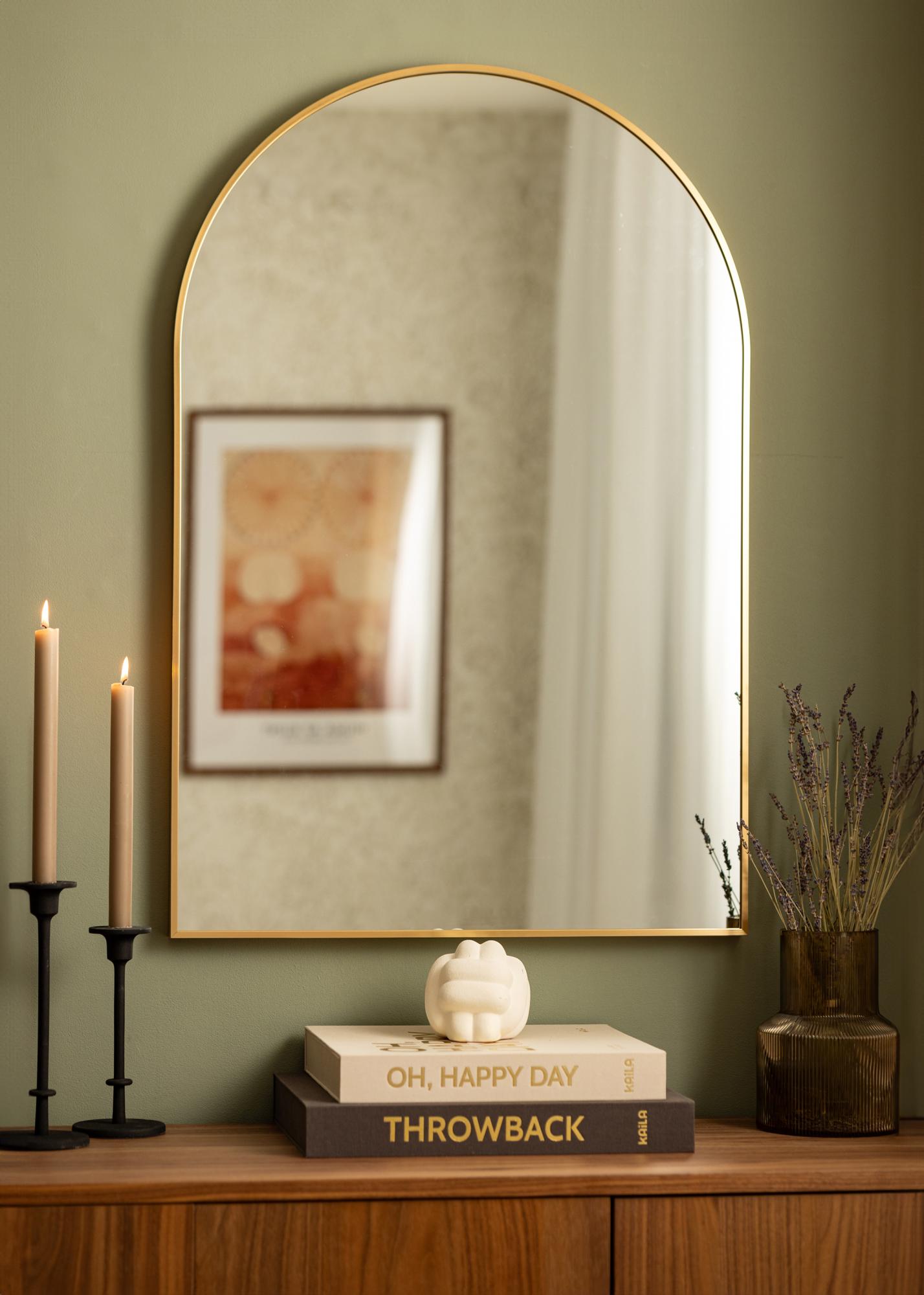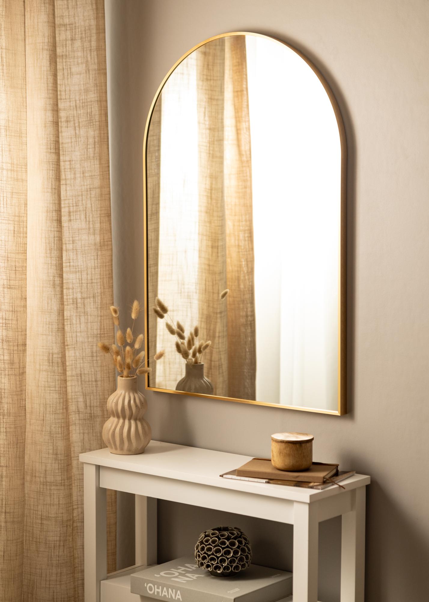 Este é um espelho de parede moderno que pode ser usado em qualquer divisão. Pode deixá-lo como um detalhe elegante no quarto ou na sala de estar, ou usá-lo como espelho de casa de banho ou espelho de entrada para poder se refletir adequadamente ao se preparar para o dia. O espelho numa moldura de metal com 28 mm de profundidade, com um tom dourado exclusivo que confere-lhe um acabamento excecional. A forma elegante inspirada em arcos reforça ainda mais a expressão luxuosa.