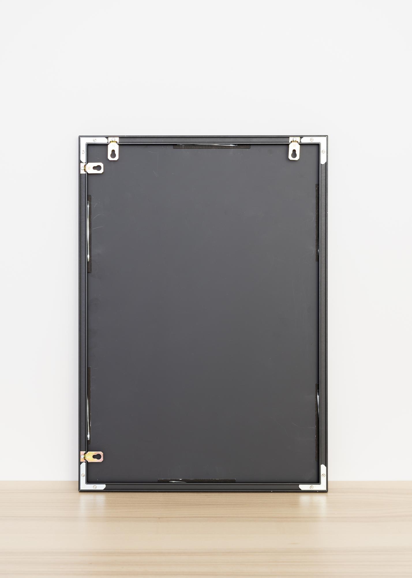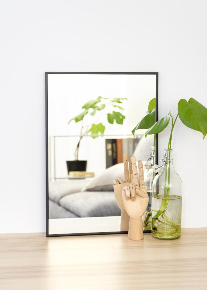 Um espelho elegante com moldura de alumínio preto. O espelho está equipado com suportes de parede inteligentes, o que facilita a sua suspensão.