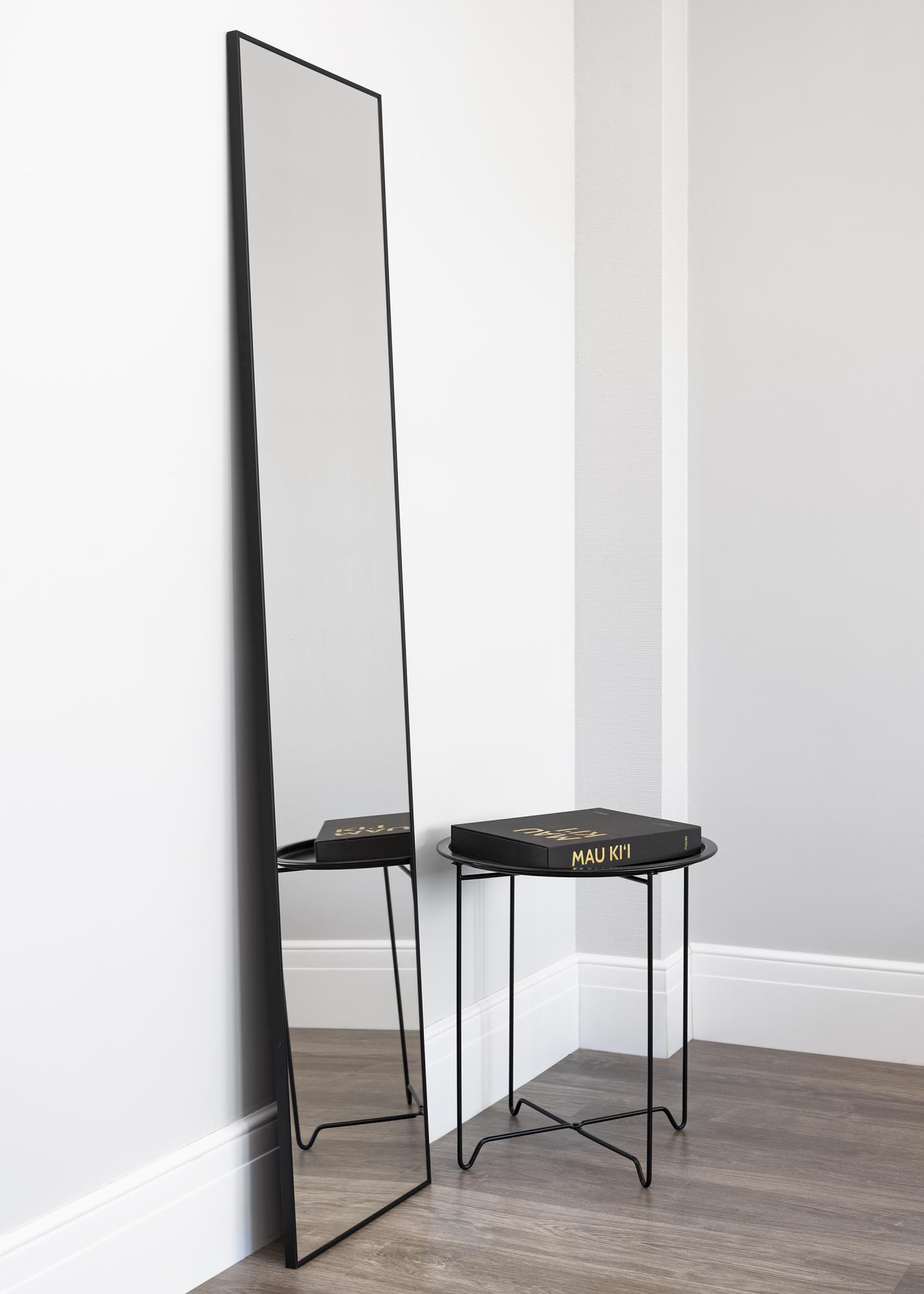 Sku :Um espelho elegante com moldura de alumínio preto. O espelho está equipado com suportes de parede inteligentes, o que facilita a sua suspensão.