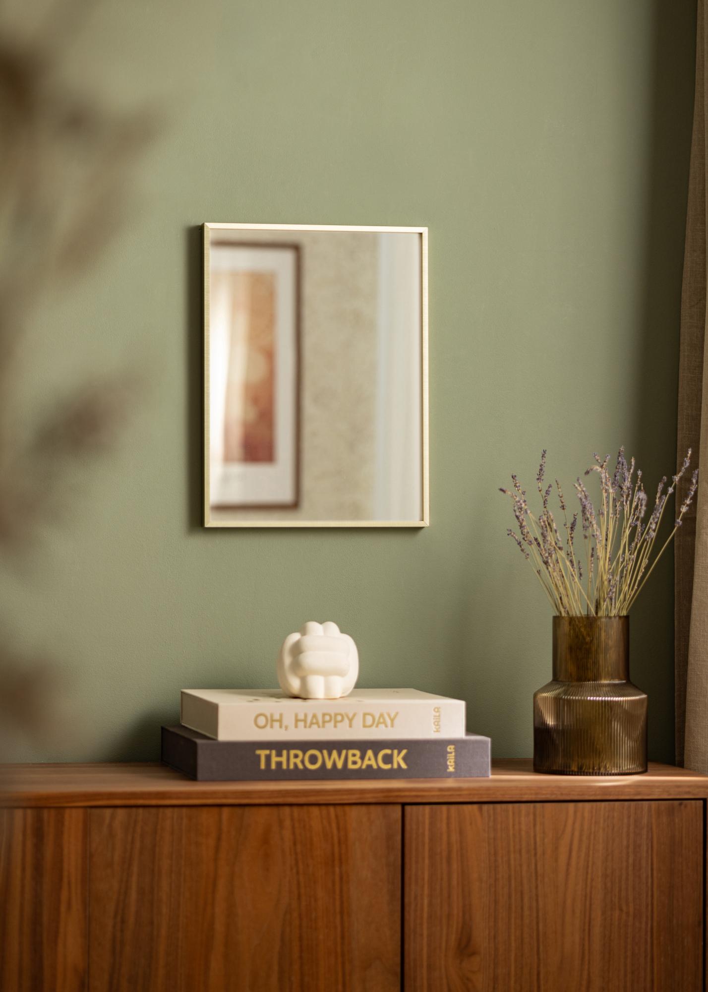A moldura deste espelho tem 7,8 mm de largura e uma profundidade de 25,9 mm, o que lhe confere uma sensação robusta e estável. Feito de alumínio, combina durabilidade com um peso leve, tornando-o fácil de montar na parede. O acabamento escovado em ouro oferece um visual moderno e sofisticado que se adapta tanto a estilos de decoração clássicos quanto modernos.