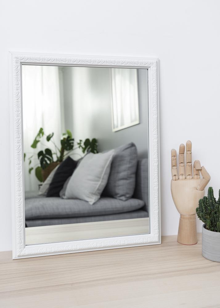 Este espelho de parede é um detalhe de decoração elegante que reflete lindamente a luz de todas as fontes de luz do ambiente. A moldura branca proporciona uma impressão clara e fresca, que é perfeitamente complementada pelo perfil decorativo da moldura e pelos belos padrões.
