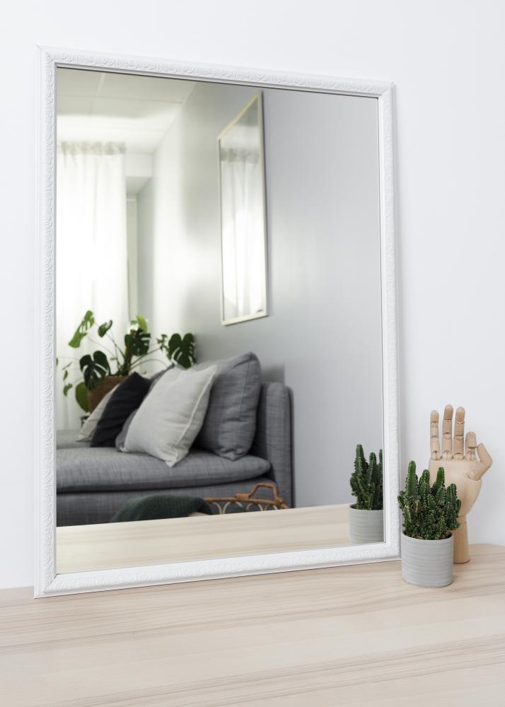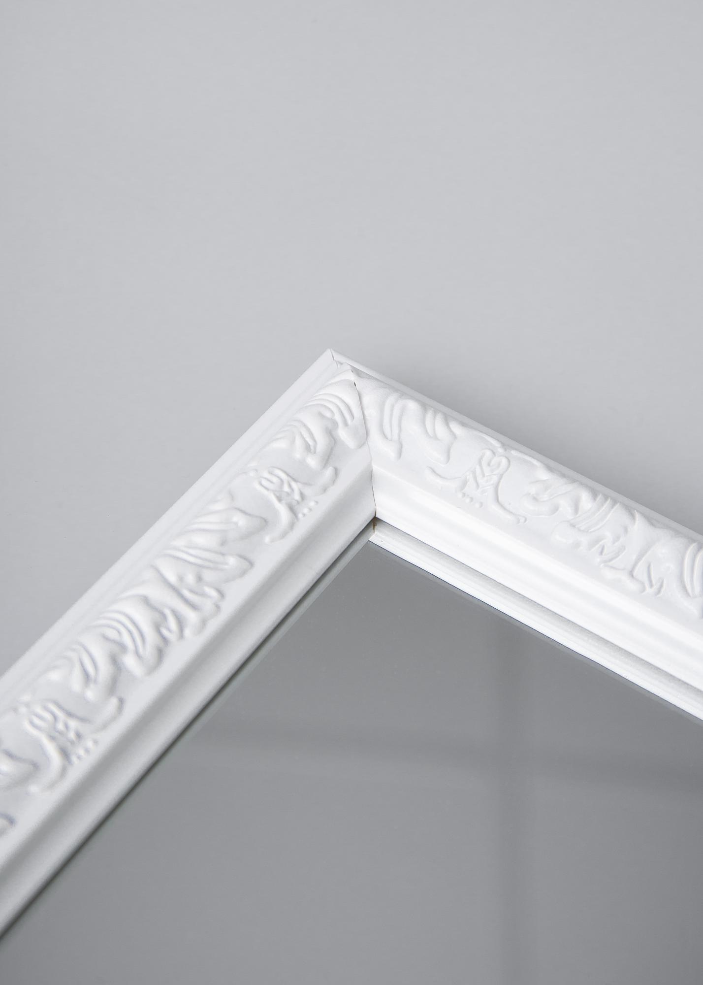 Este espelho de parede é um detalhe de decoração elegante que reflete lindamente a luz de todas as fontes de luz do ambiente. A moldura branca proporciona uma impressão clara e fresca, que é perfeitamente complementada pelo perfil decorativo da moldura e pelos belos padrões.