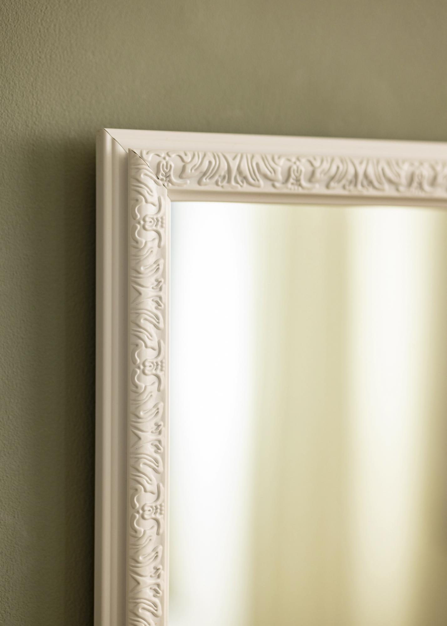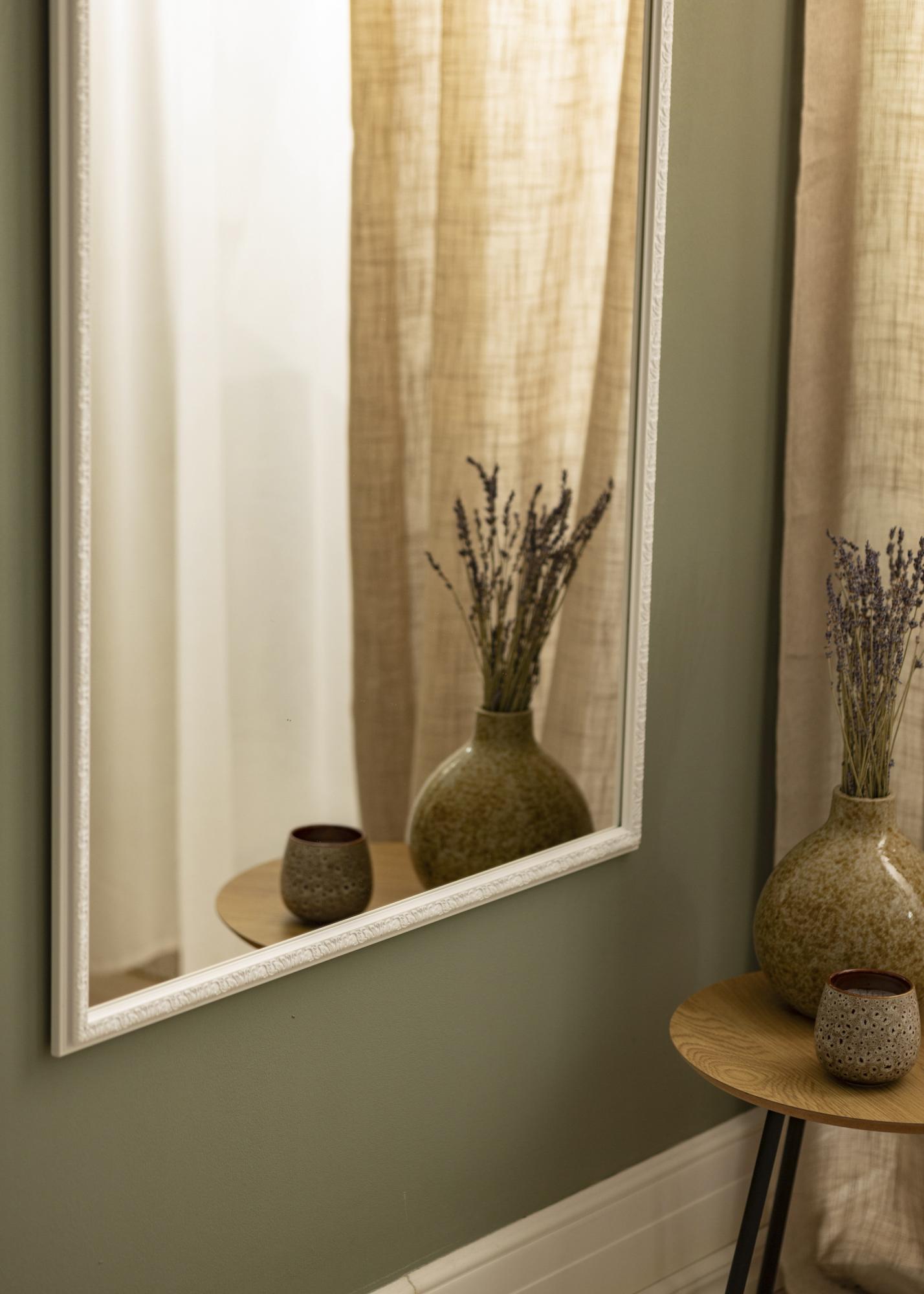 Este espelho de parede é um detalhe de decoração elegante que reflete lindamente a luz de todas as fontes de luz do ambiente. A moldura branca proporciona uma impressão clara e fresca, que é perfeitamente complementada pelo perfil decorativo da moldura e pelos belos padrões.