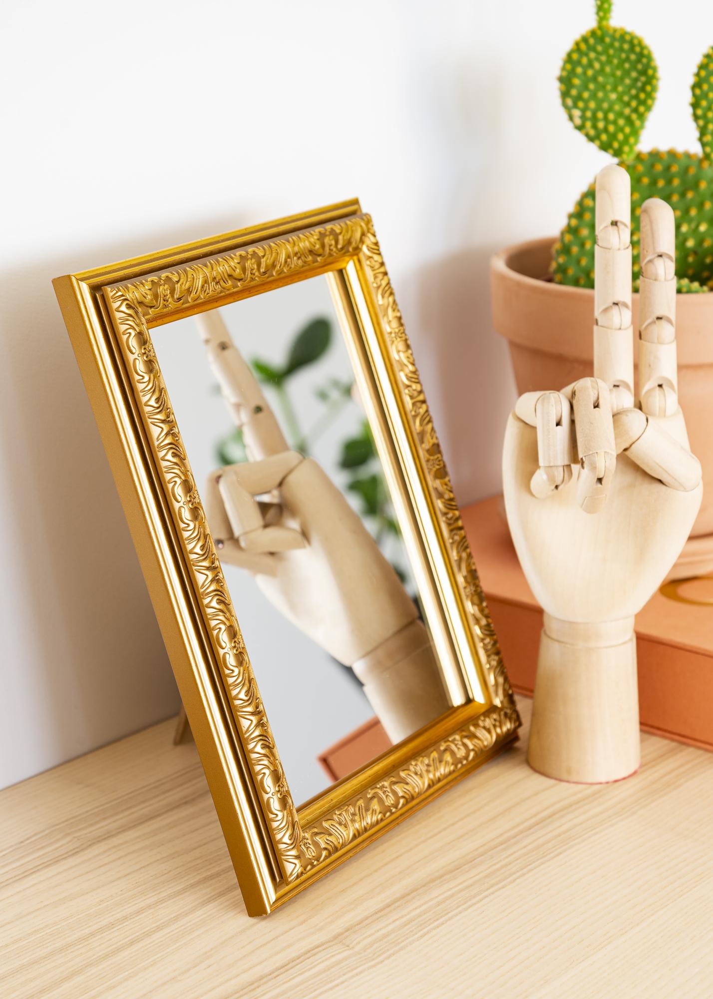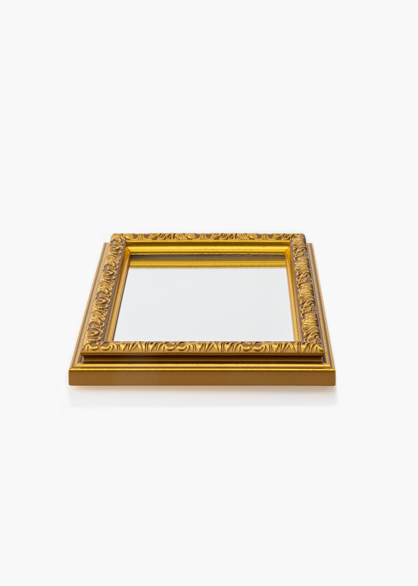 Iniciar o seletor de molduras »Nostalgia Dourada é uma série de espelhos de parede. A moldura é ricamente decorada com símbolos irregulares que dão uma impressão um pouco misteriosa.
