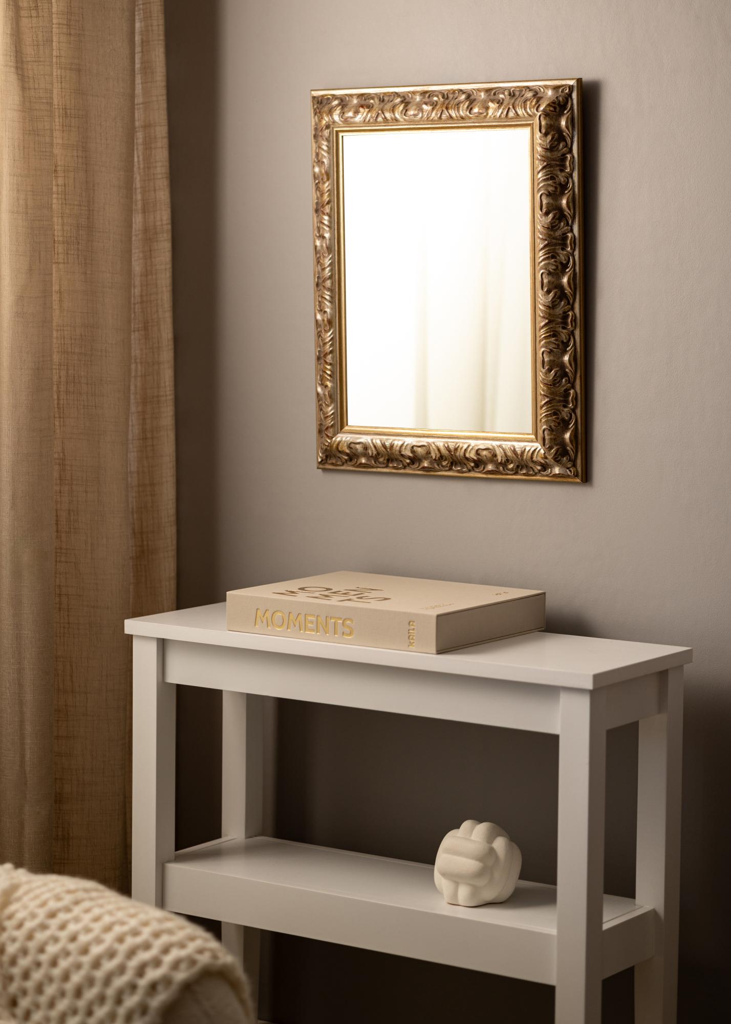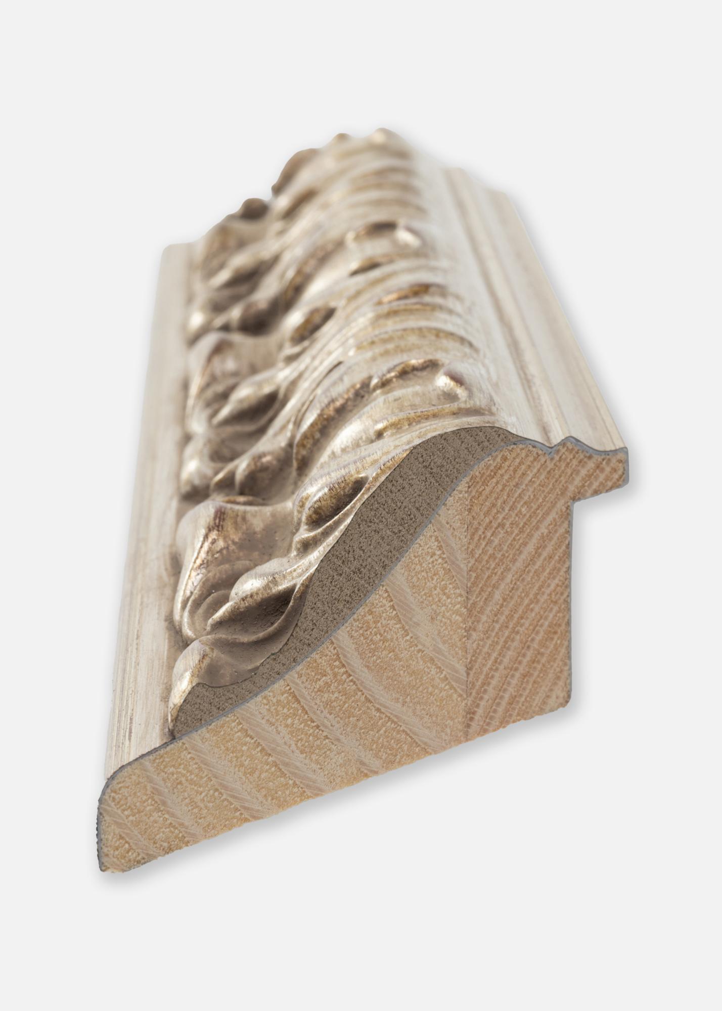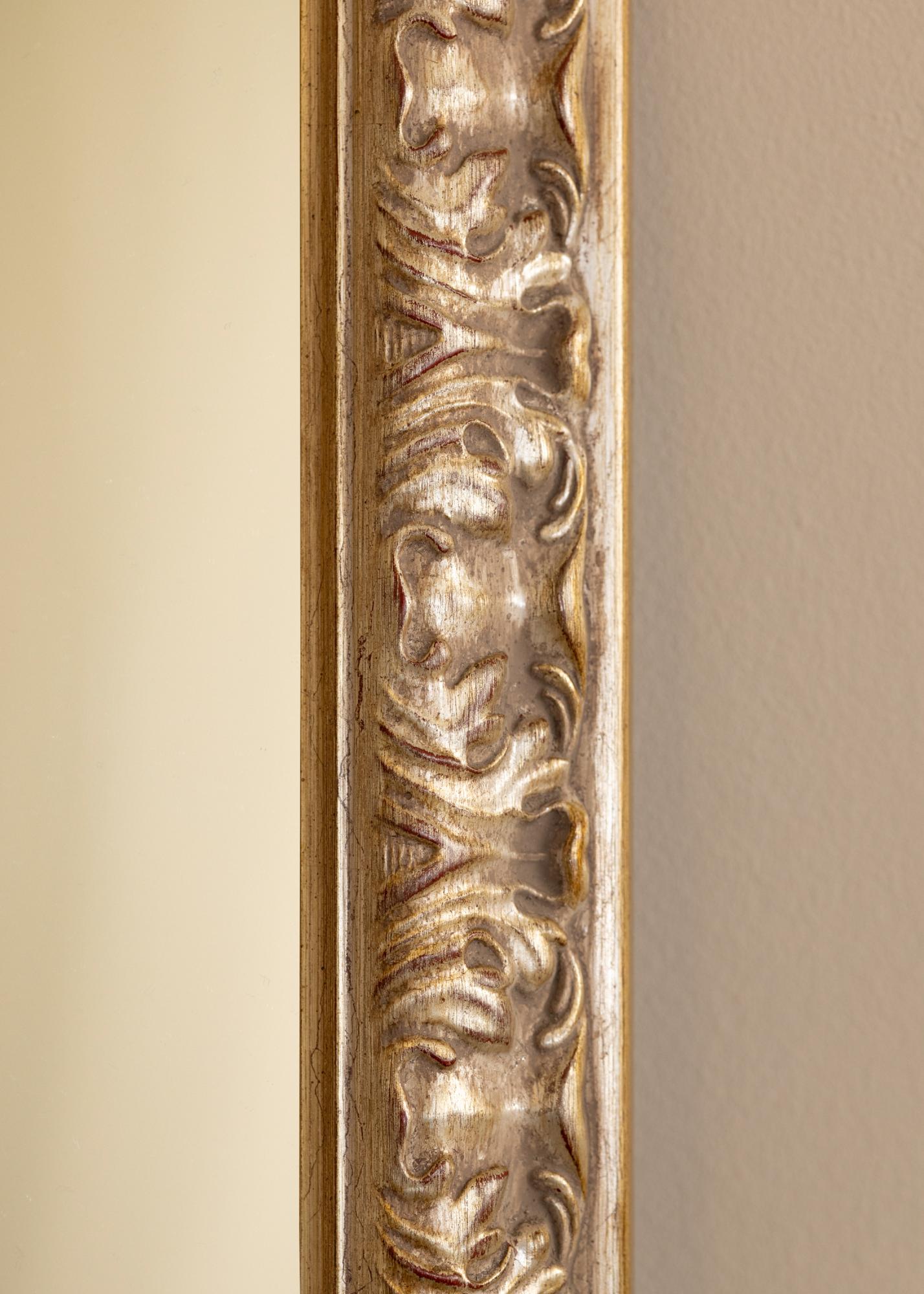 A moldura é feita de pinho e possui um acabamento em prata antiga com detalhes sutis em dourado e toques de vermelho. Esta combinação de cores cria um belo contraste e dá ao espelho uma expressão clássica e sofisticada. O visual decorativo faz com que o espelho seja perfeito para enquadramentos onde uma sensação elegante é buscada.