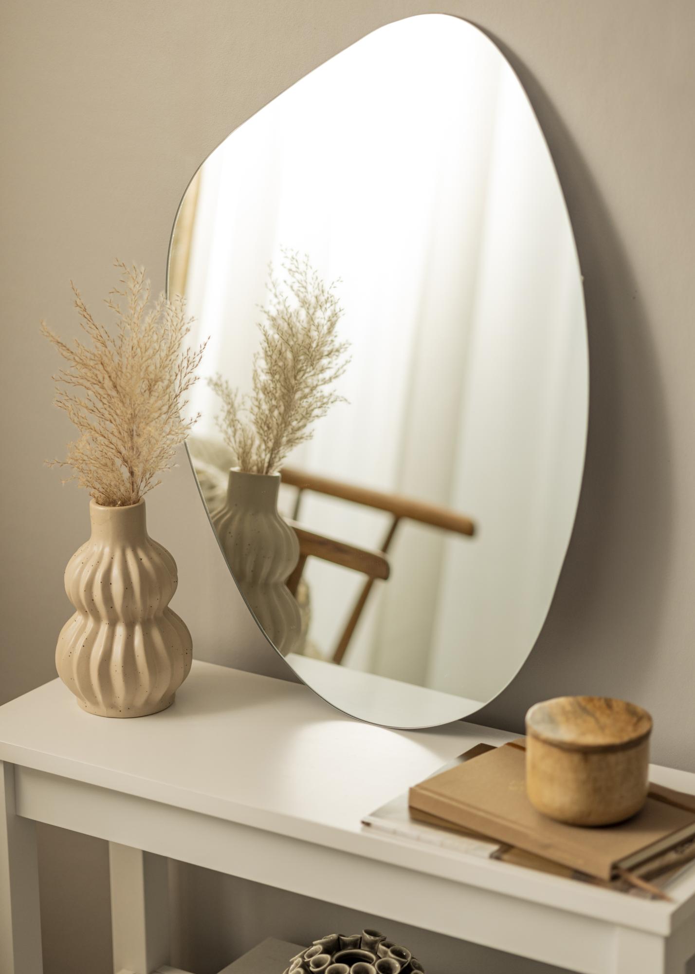 Este espelho tem uma expressão minimalista, com um design sem moldura e um vidro fino. Tem um tamanho de 50x60 cm e é fácil de montar na parede, graças ao suporte de parede na parte de trás do espelho.