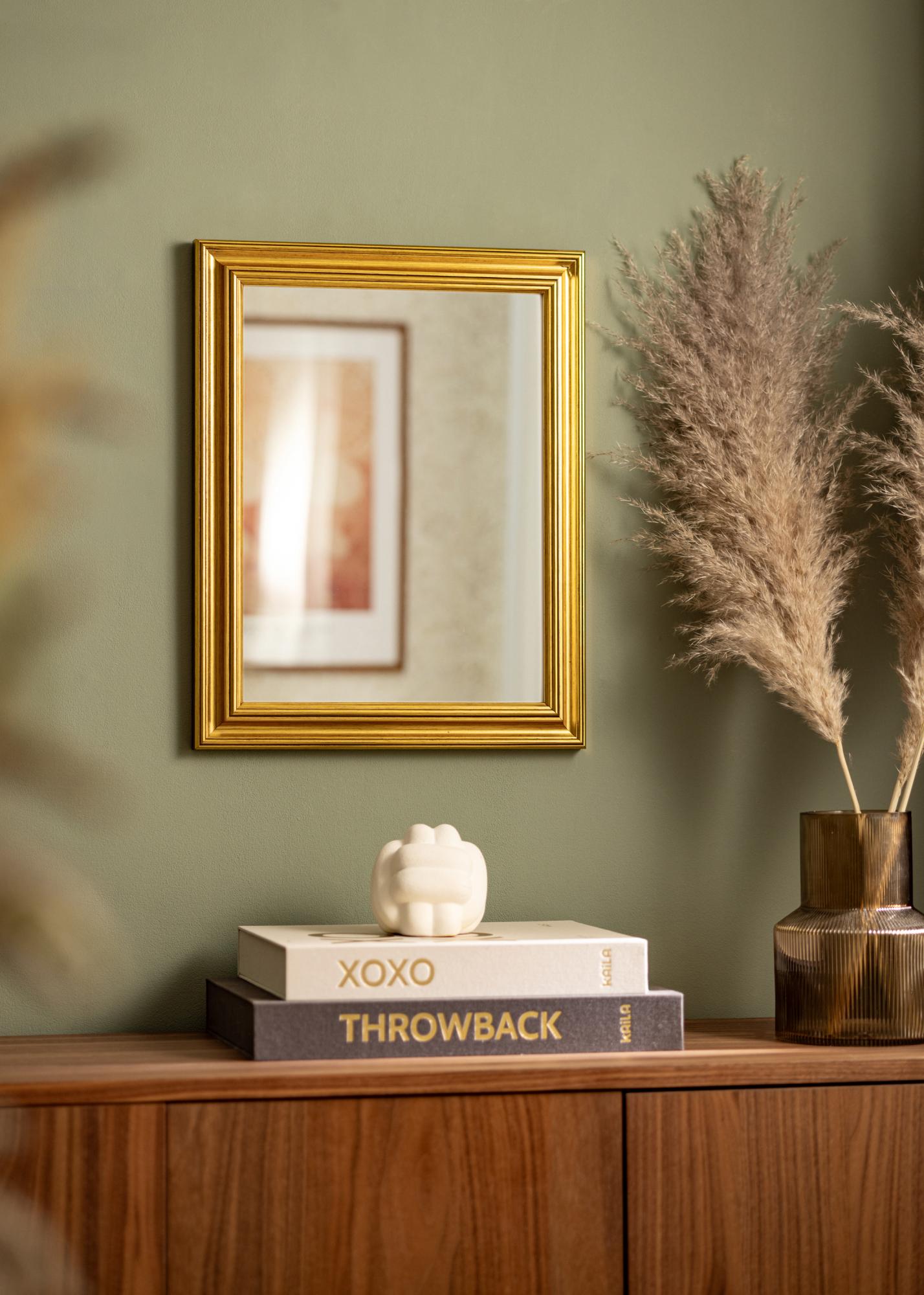 Clássico espelho dourado com moldura de madeira que parece pintado à mão, dando ao espelho uma sensação viva e um brilho bonito. A larga moldura dá ao espelho uma aparência exclusiva e faz com que ele se encaixe tanto numa casa decorada com antiguidades quanto numa casa moderna com decoração romântica ou elegante. Combine o espelho com um par de apliques de latão e quadros com molduras douradas para criar uma sensação completa no ambiente.